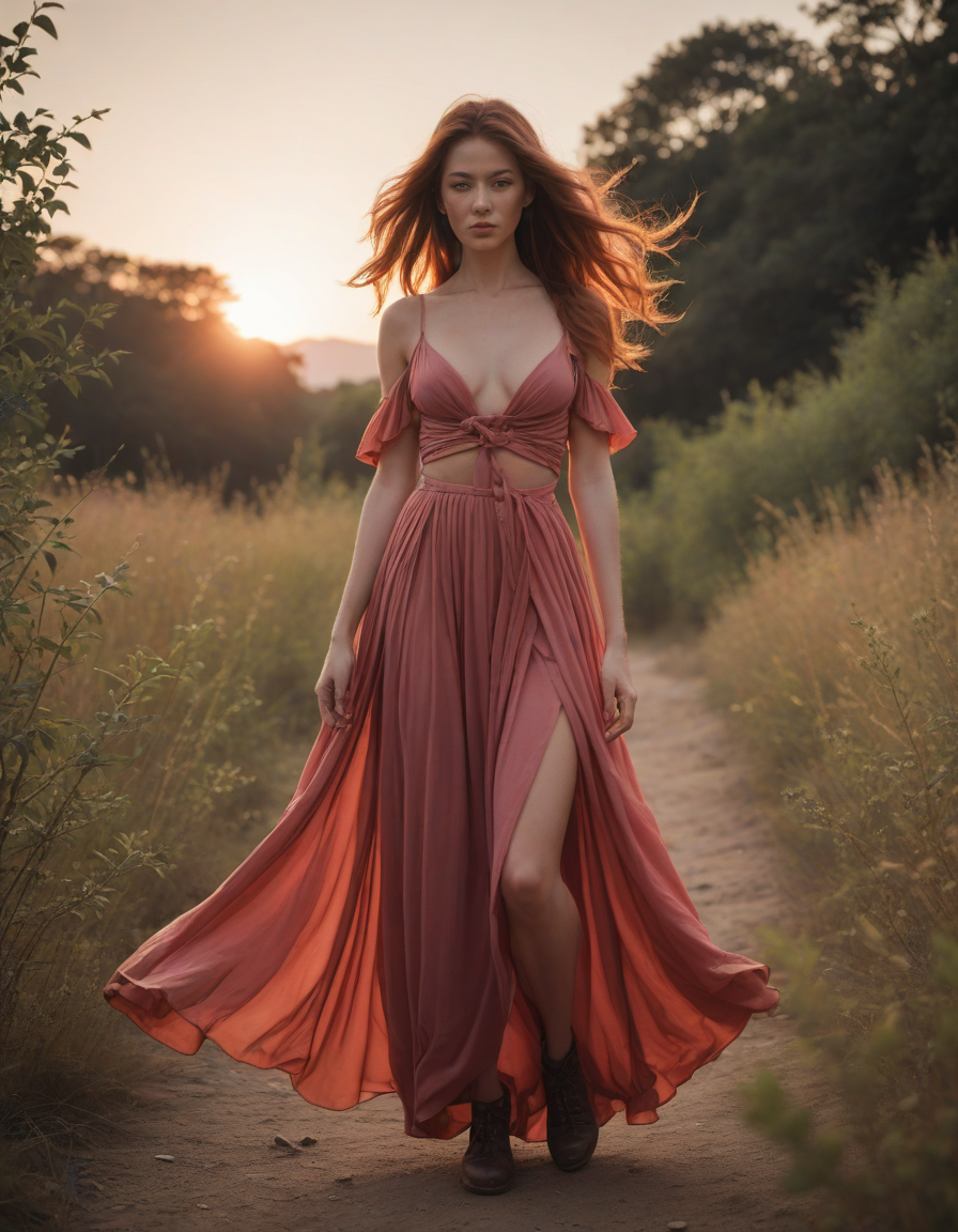 Rose colored long dress flowing in the wind in a curious way, duke nukem, short telephoto lens, summer sunset hue, in a witch outfit