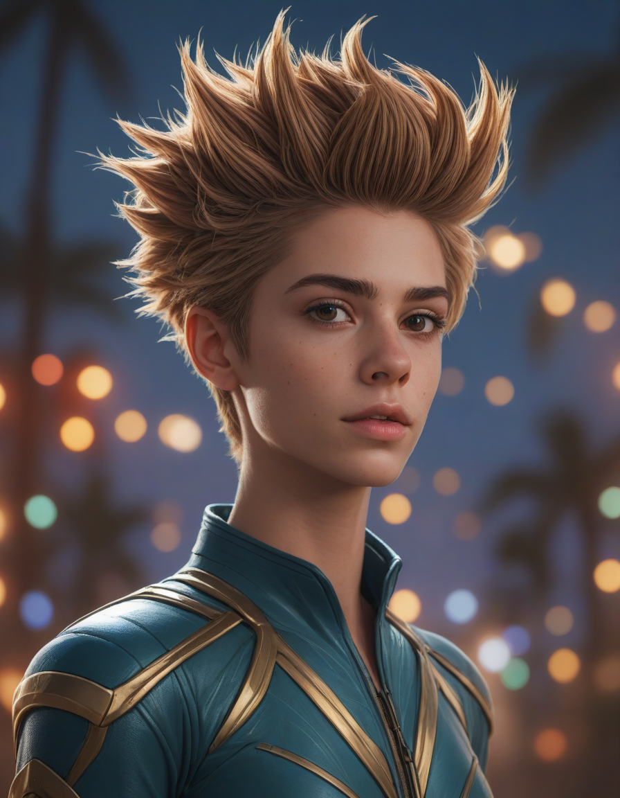treant, sonic the hedgehog, fireworks, a sharp, first portrait with bokeh effect, comic portrait, hair up, glow, Futuristic hero saving the world, bell haircut, photorealistic portrait, extremely detailed