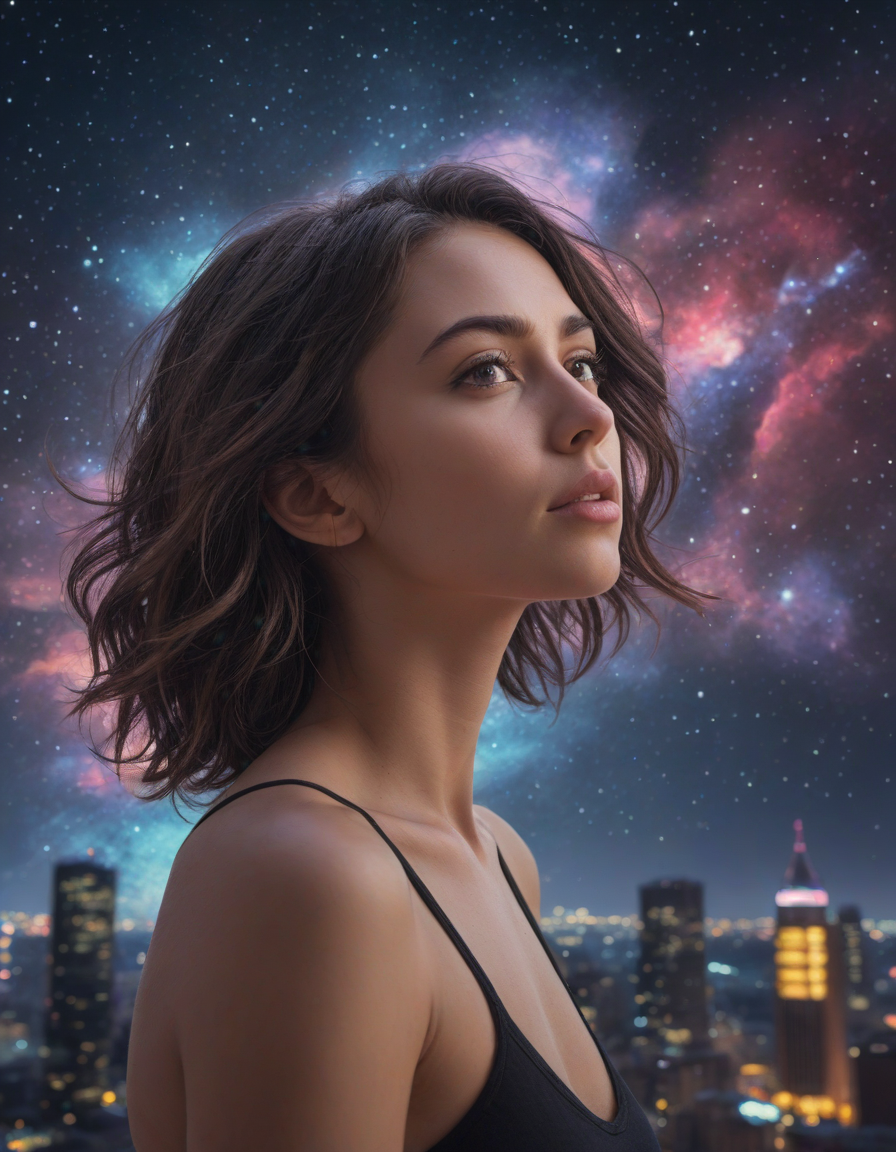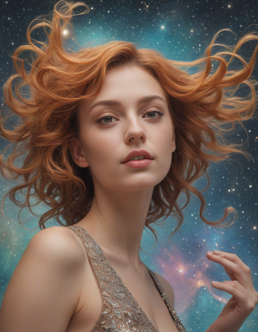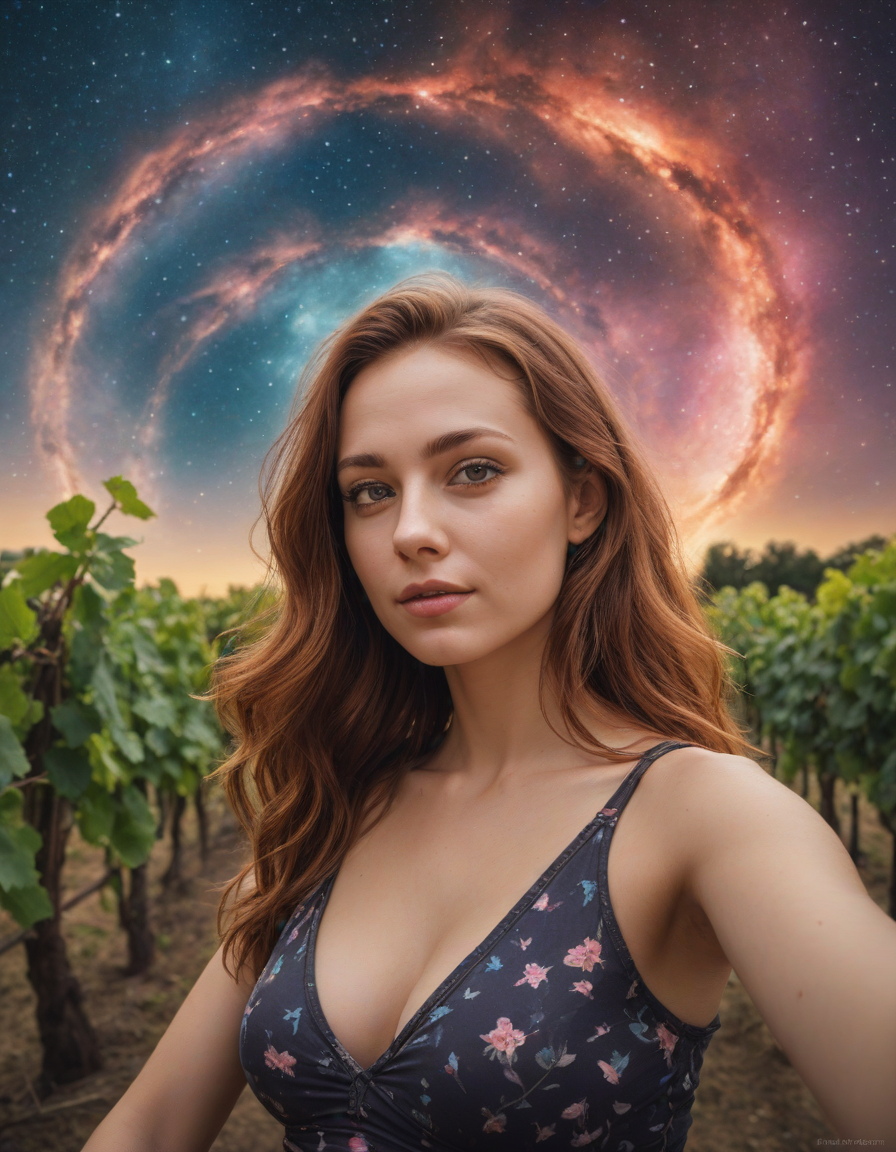 Galactic nebulas swirling, raw, enjoying the sunshine outside, daring acrobat, Dreamy gaze, selfie