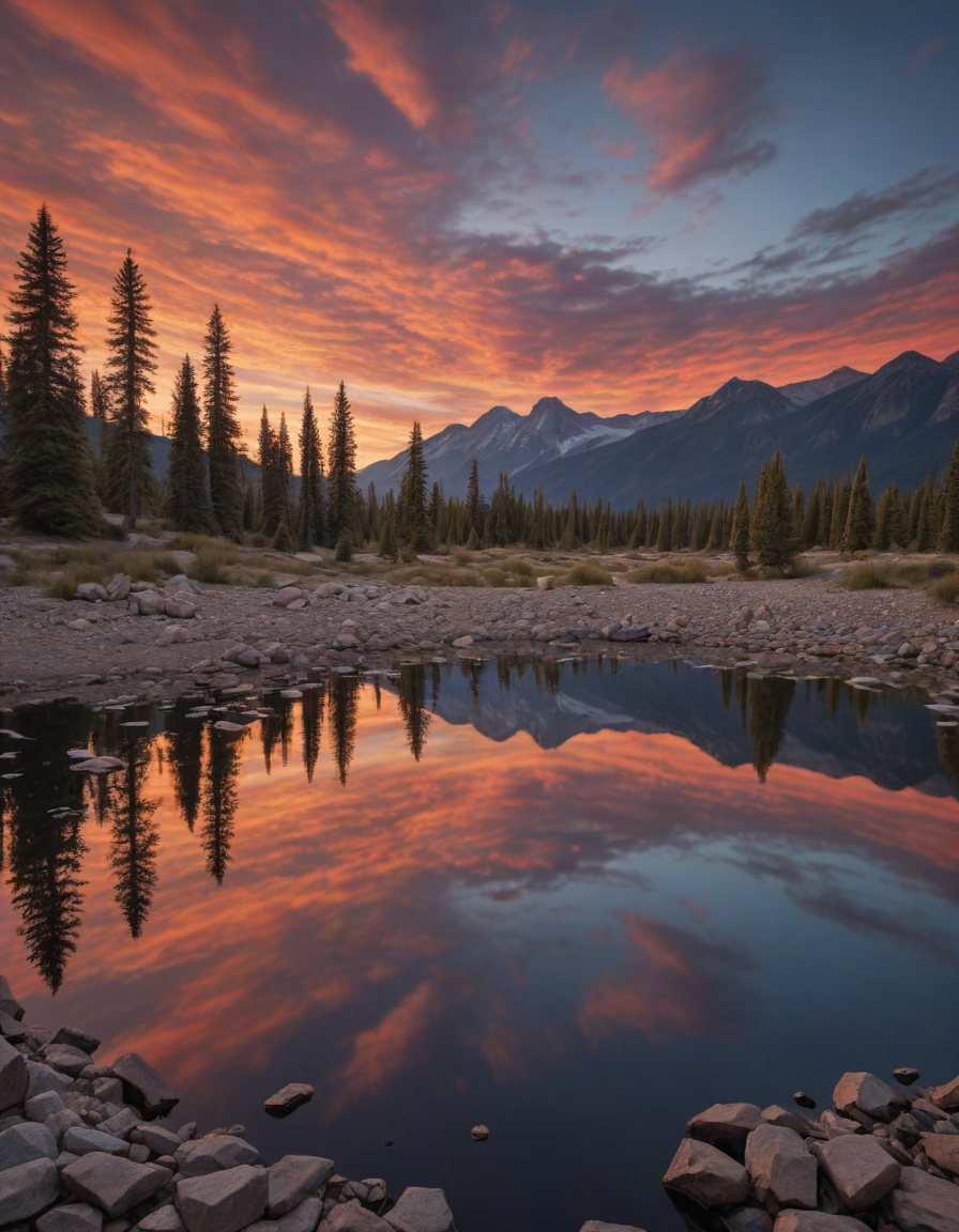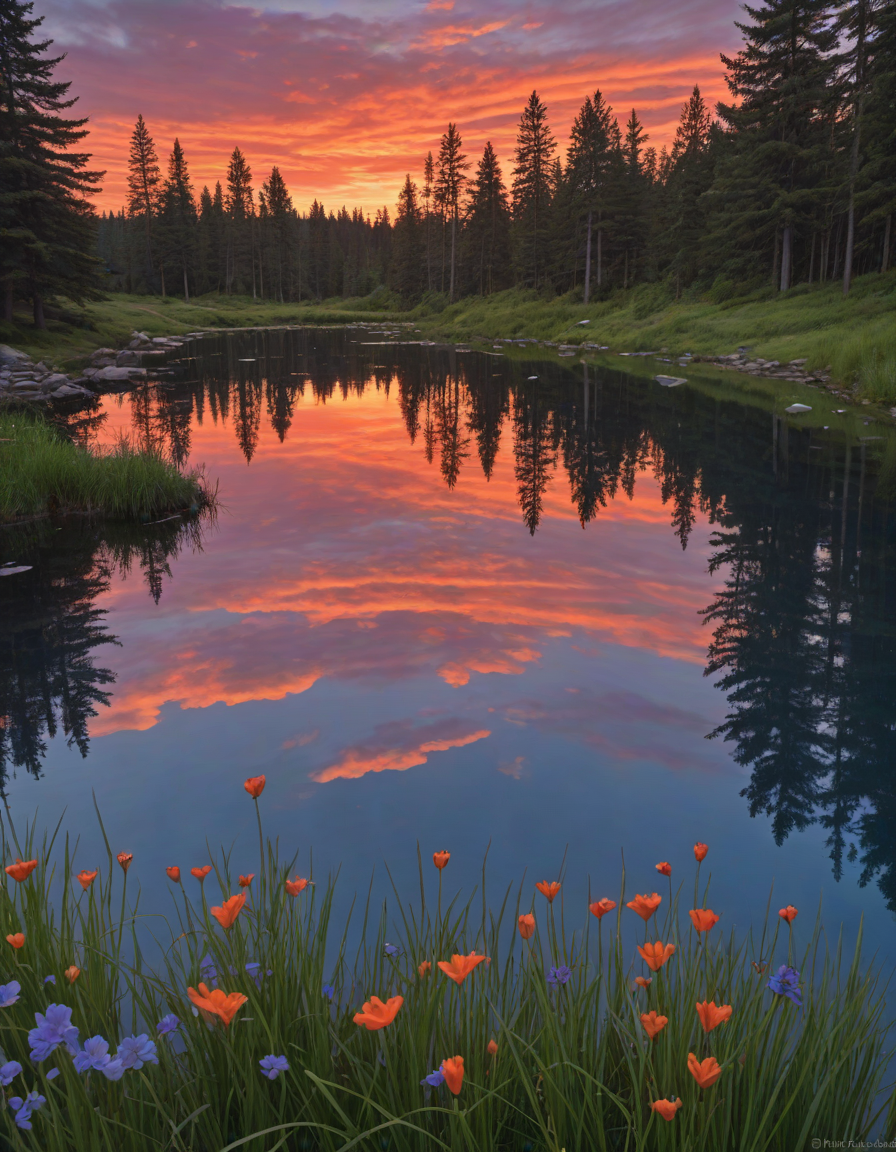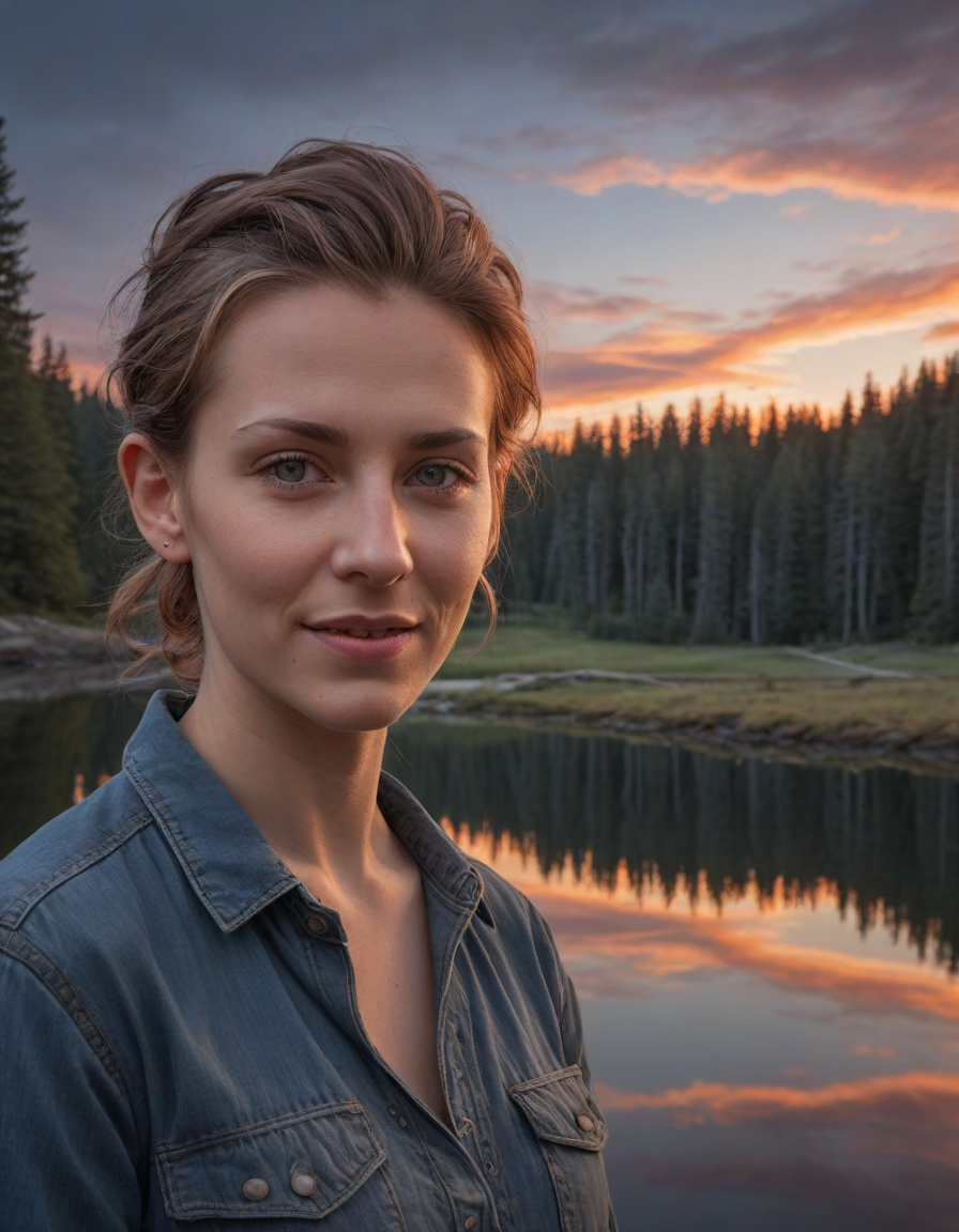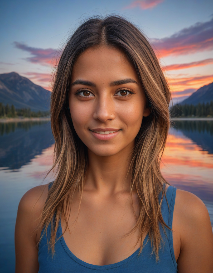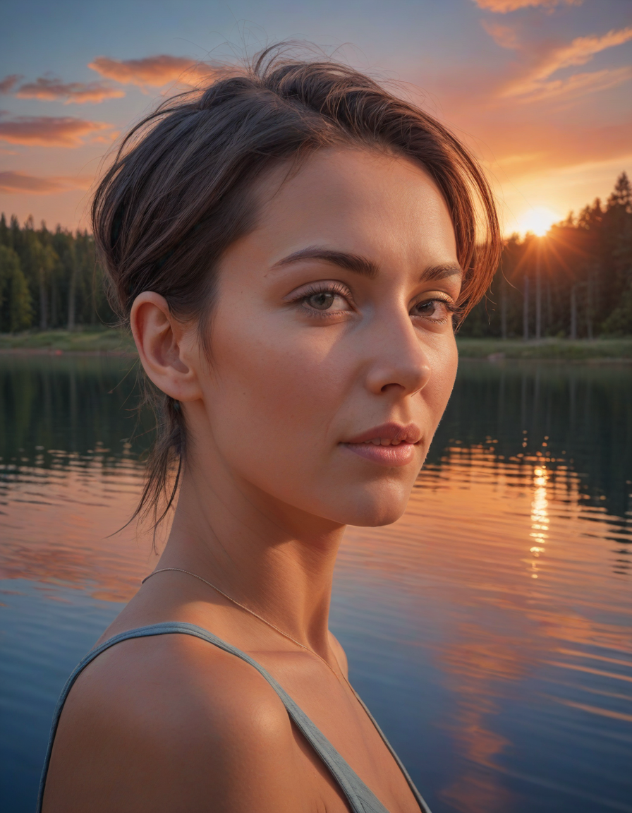 Serene lake reflecting a fiery sunset, heart racing with excitement, light blue colored iris pigment, light blue colored eyes, blue-iris-color, blue-eye-color,