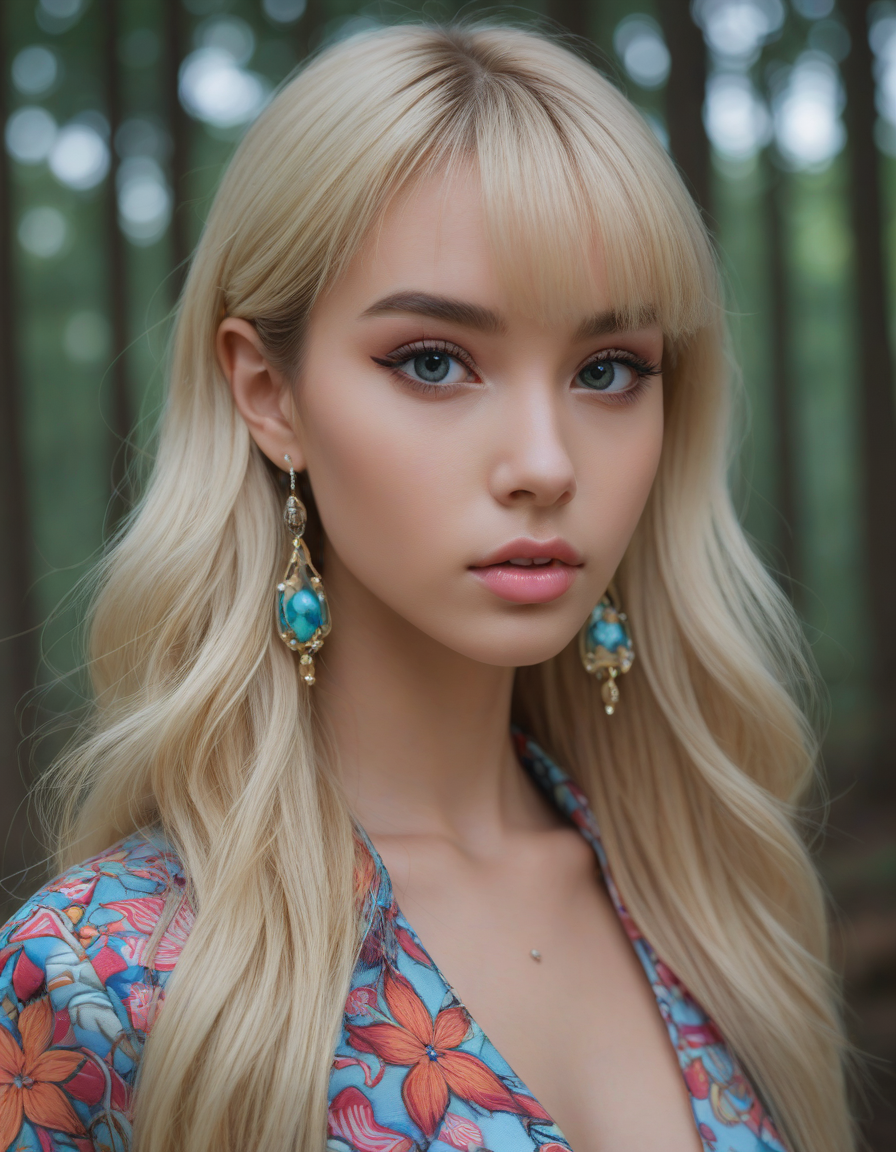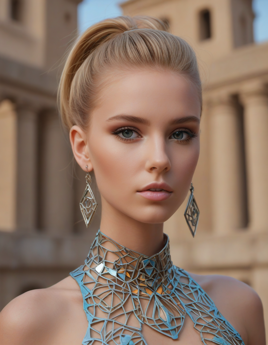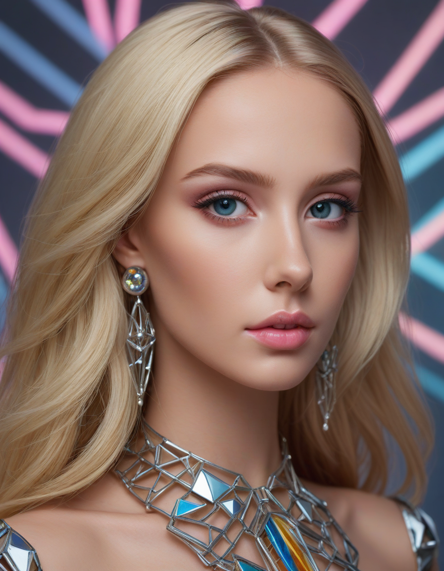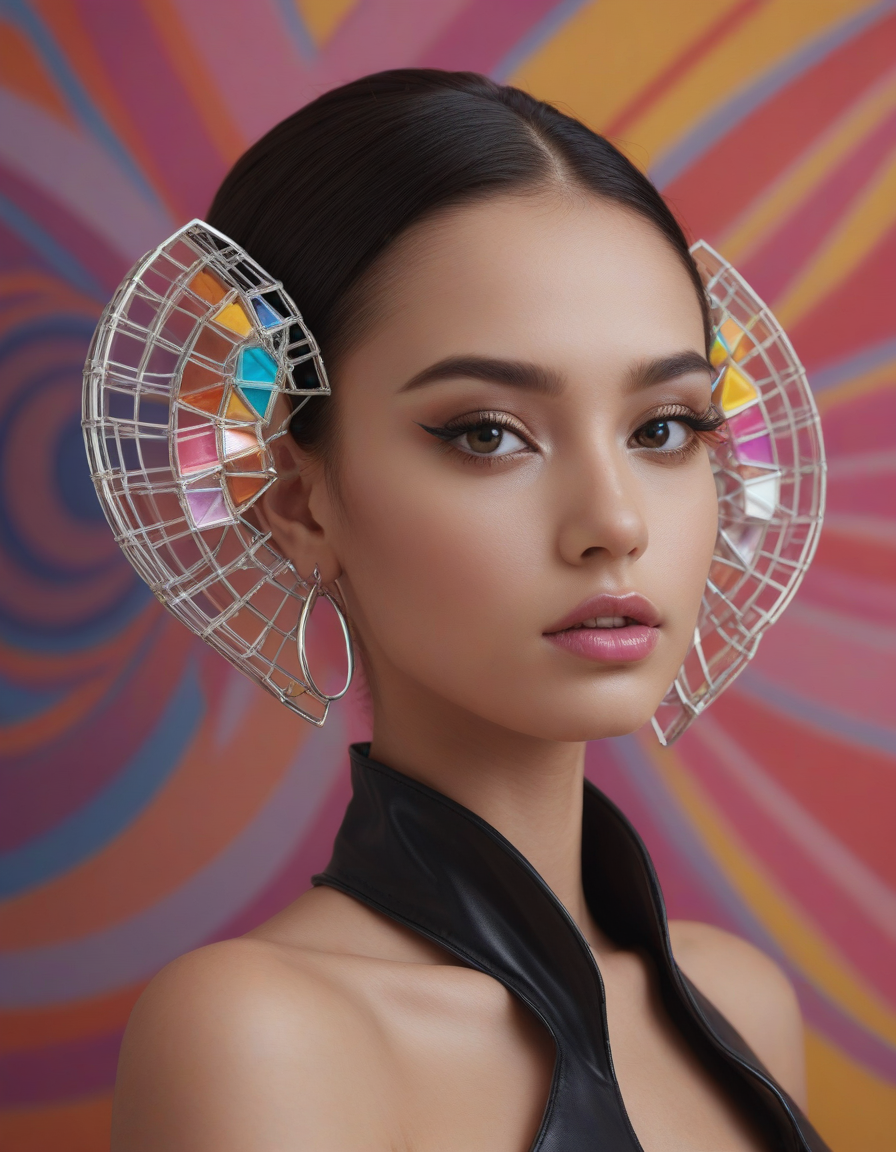 piercing gaze, earrings, kaleidoscope portrait, barbie, sleek, futuristic fashion