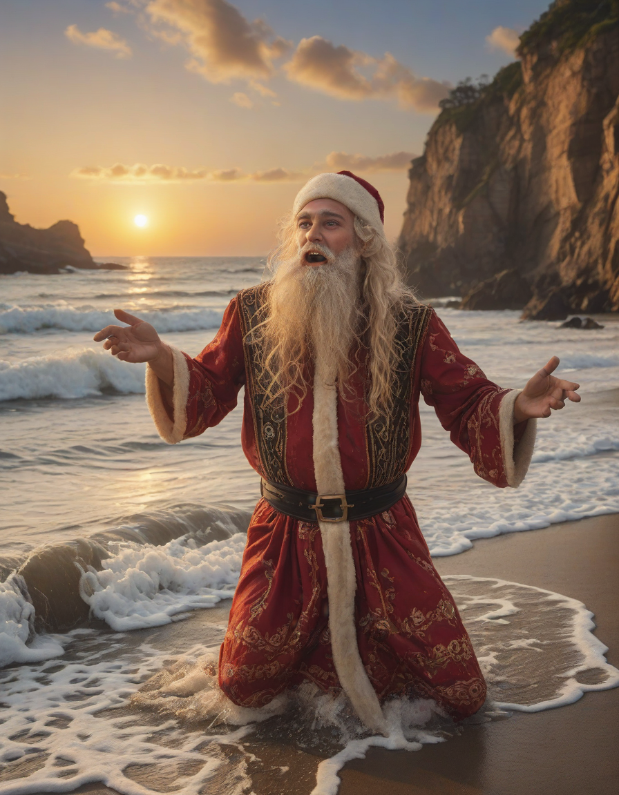 drunk santa yelling, bright-eyed curiosity, Prismatic renaissance, Gifted, Gothic beauty with dark makeup, afraid, whimsical fairytale, Surfer catching wave in beach sunset, Angular patterns over subjects