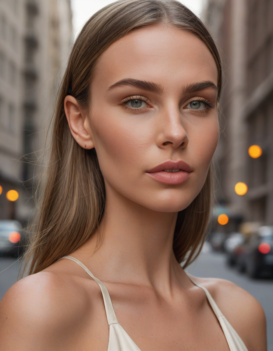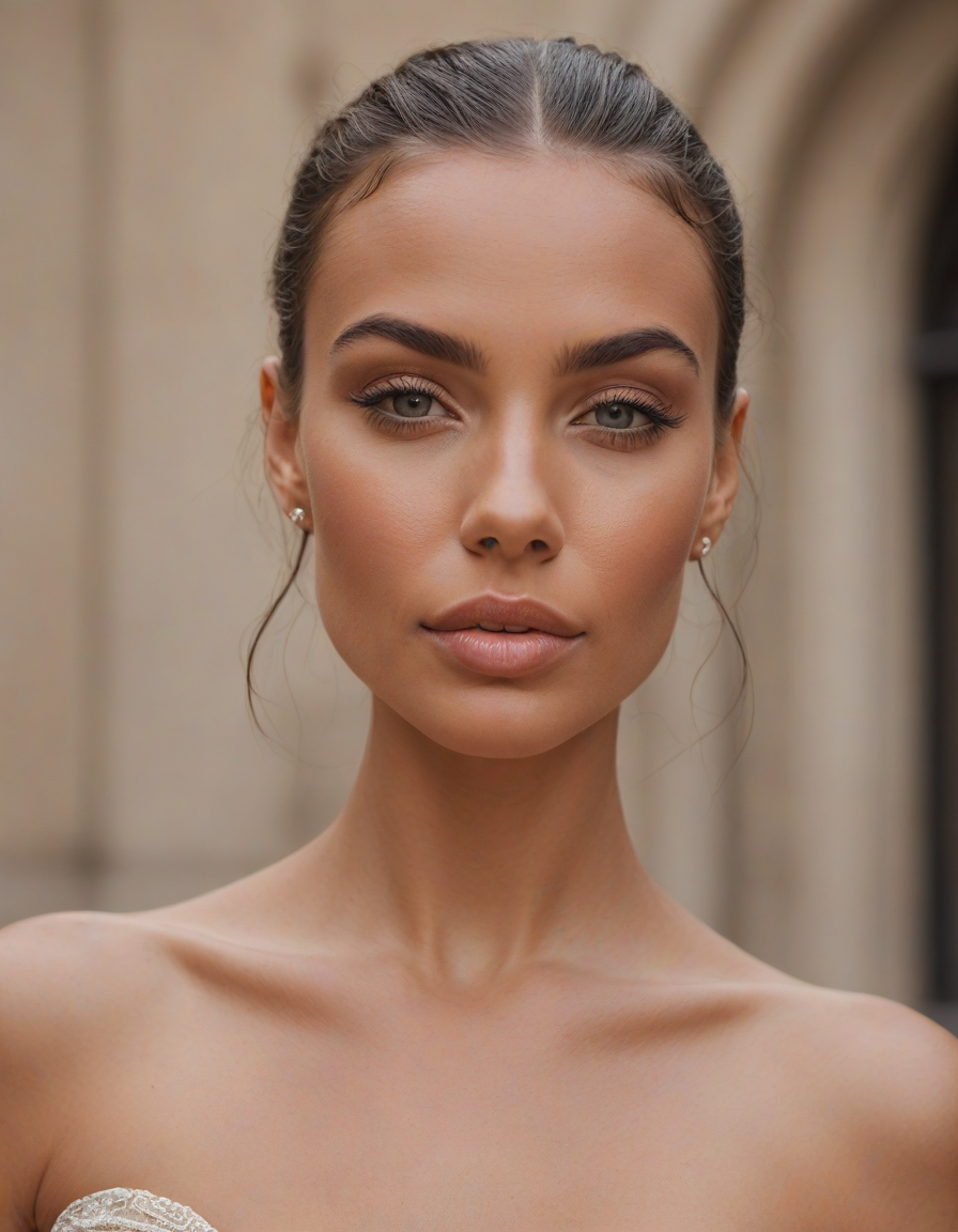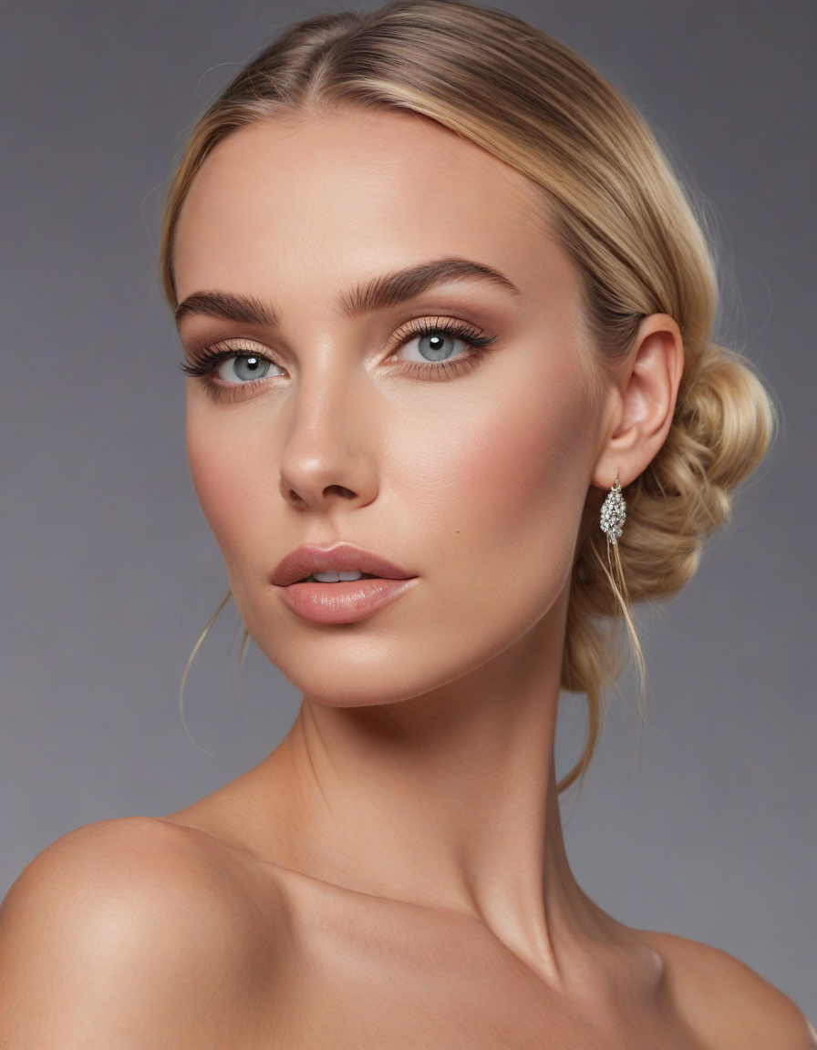 High-arched eyebrows, pronounced cheekbones, very thick full lips, thick full lips, lip fillers, narrow facial structure, small chin, pointed nose tip, deep-set eyes with visible upper eyelid space, prominent jawline, smooth forehead, elongated face shape, subtle eye creases, thin nose bridge, voluminous cheek appearance, defined lip contour, sculpted facial silhouette, soft nasolabial folds, high forehead, delicate ear shape, refined jaw angle, sleek facial contour, radiant skin texture, luminous eye reflection, sculpted eyebrow tail, accentuated cupid's bow, pronounced chin dimple, light-catching cheek highlight, defined eyelid crease, long eyelashes, symmetrical face balance, graceful neck line, airy eyebrow density, contoured cheek shading, polished skin finish, captivating gaze, structured nose profile, gleaming skin surface., savoring the view, formal, elegant evening wear