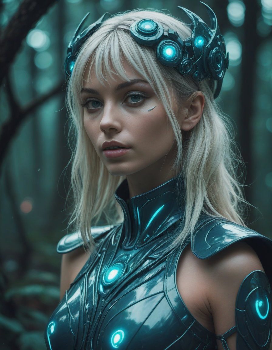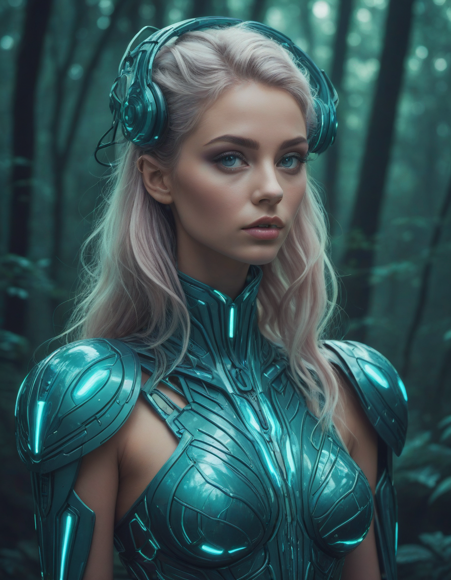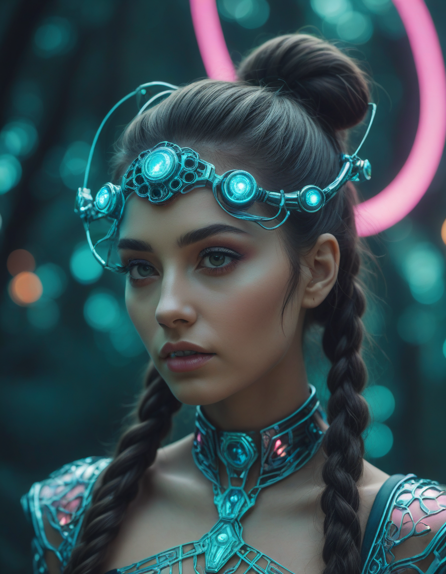 futuristic cyberpunk outfit with glowing accents, abstract, surreal, whimsical, magical fantasy forest, bioluminescent plants, ethereal atmosphere, curious, engaged, eager expression, close-up, macro, 1980s retro aesthetic, vintage filters, bold graphic designs