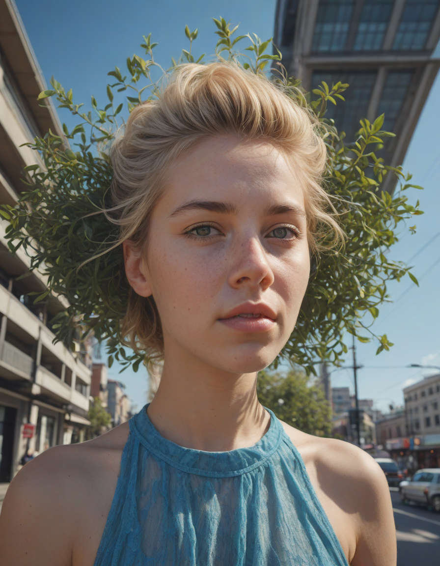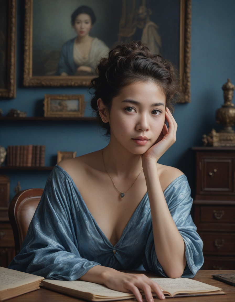 blue, glimmering, looking at viewer, Dream within a dream, surprised, utterly embarrassed, photorealistic portrait