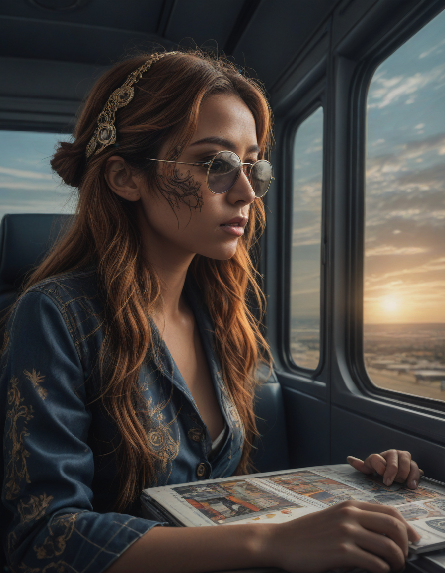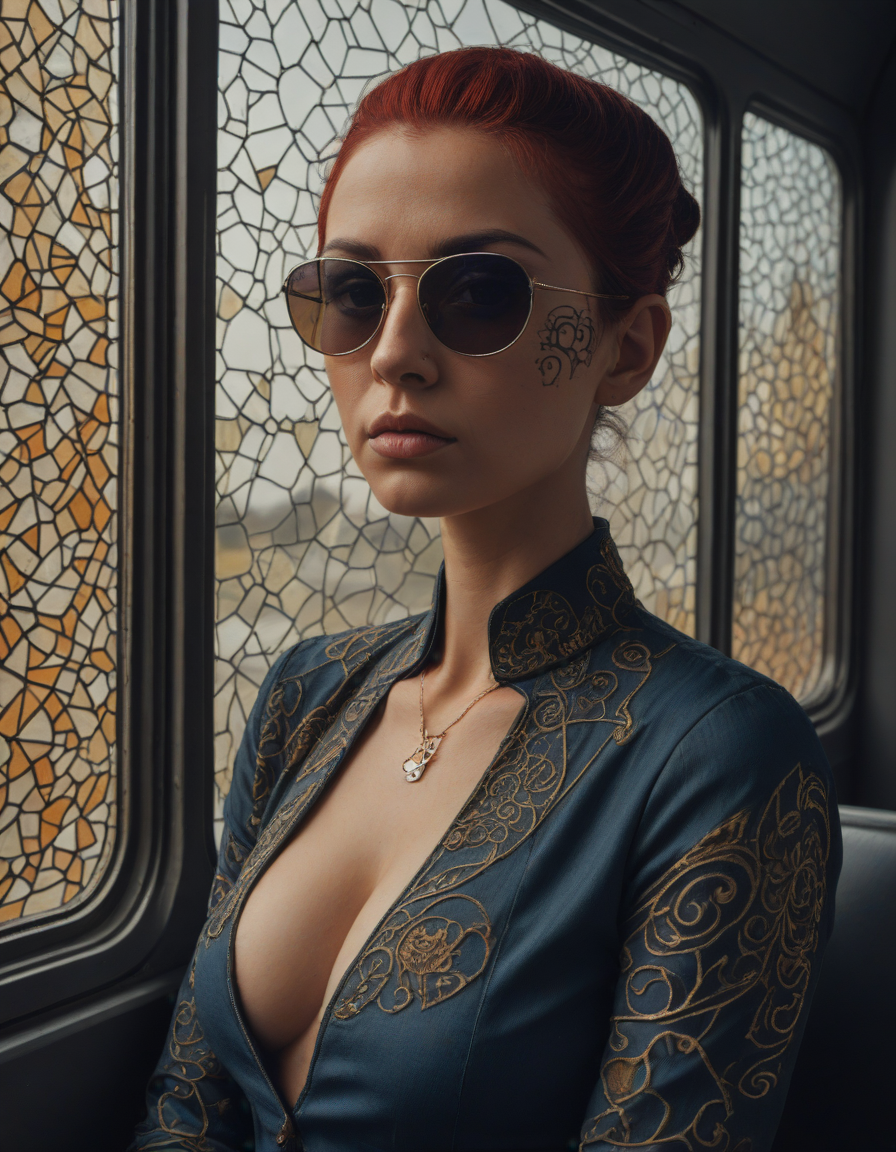 dark elf,drow, stained glass window, with intricate patterns, Striking juxtaposition, Mystical twilight, pincushion distortion, made of clouds, Sunburnt shoulders, aviator sunglasses, on the bus