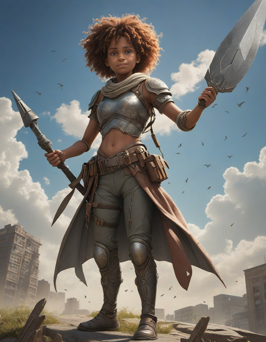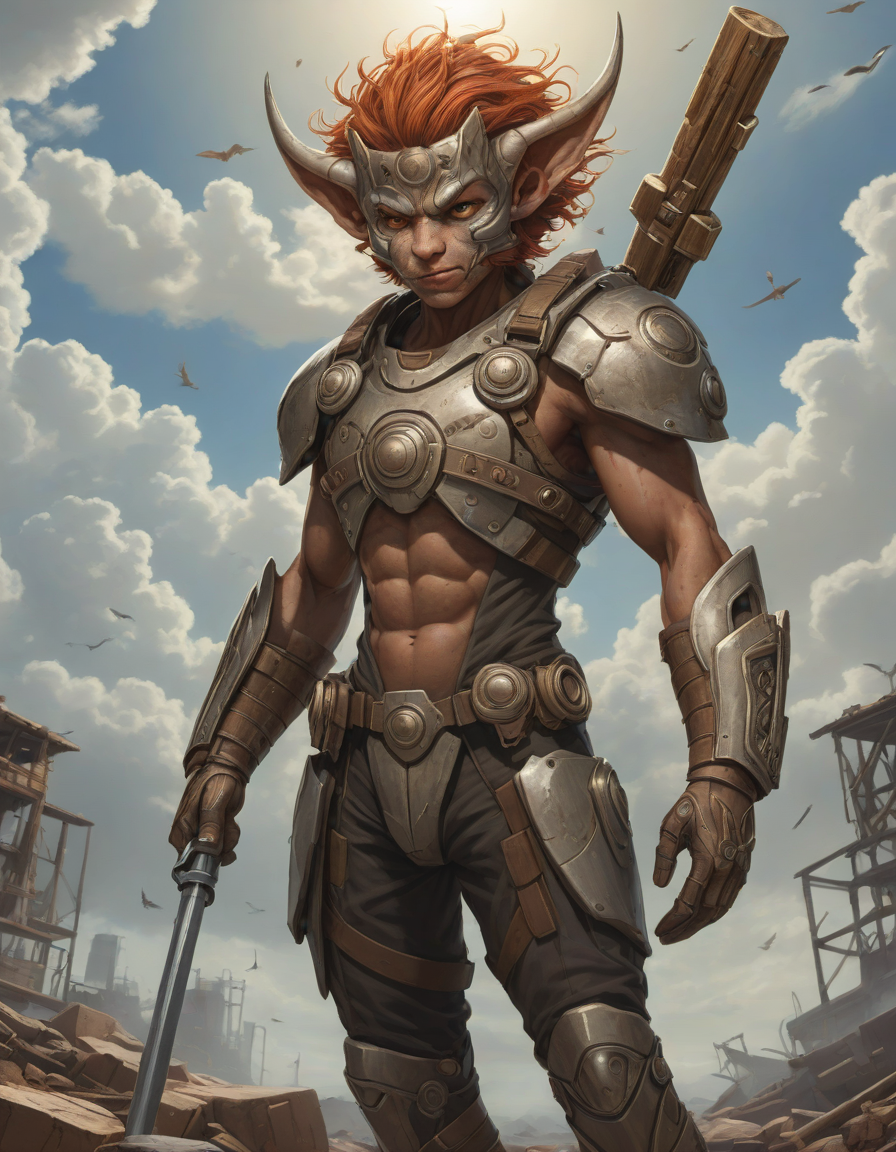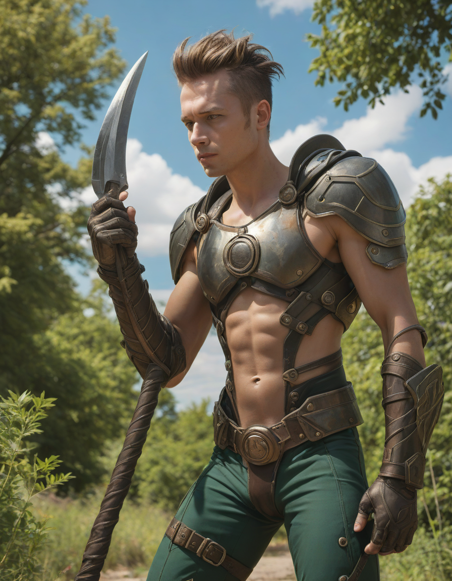 smart,intelligent, treant, superhero, heartbeat, Trembling hands clutching a cold metal weapon, whimsical clouds, Eyes glint with mischief, Glorious, active, super hero, cladorned in rugged plate mail, enjoying the sunshine outside