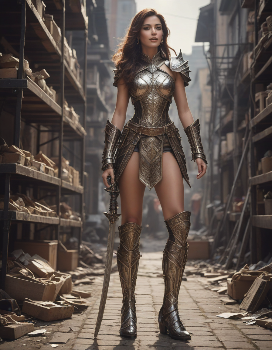 laughing, life of the party, bohemian, "free spirit", jewelry, tattoo, spring dress, elegant, high waist tight overknee stiletto boots, shiny, glossy PVC outfit, (shiny glossy PVC cloth textures), clothes made from pvc, plastic, tall woman, Holding a sword in both hands in a confident pose, detailed grip, detailed fuller, detailed pommel, detailed blade, detailed edge, , brick wall -> great window view, wearing complete set of armor, wearing full armor, Wearing chest armor, wearing leg armor, wearing feet armor, wearing bracer, wearing pauldrons, Wearing helmet, Wearing breastplate, Wearing gauntlets, Wearing greaves, Wearing pauldrons, Wearing vambraces, Wearing cuisses, Wearing sabatons, Wearing gorget, Wearing tassets, Wearing bracers, Wearing cuirass, Wearing faulds, Wearing plackart, Wearing spaulders, Wearing besagews