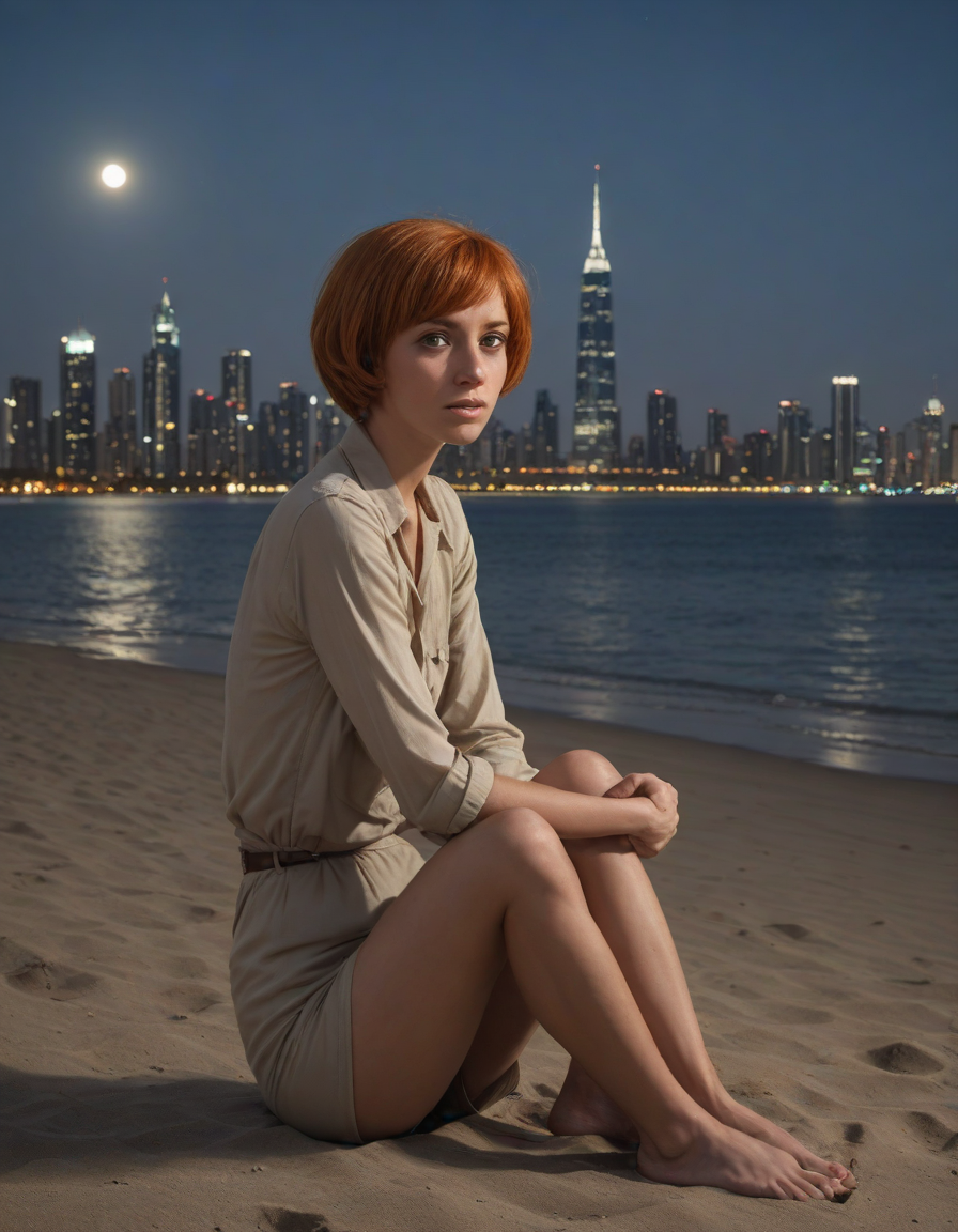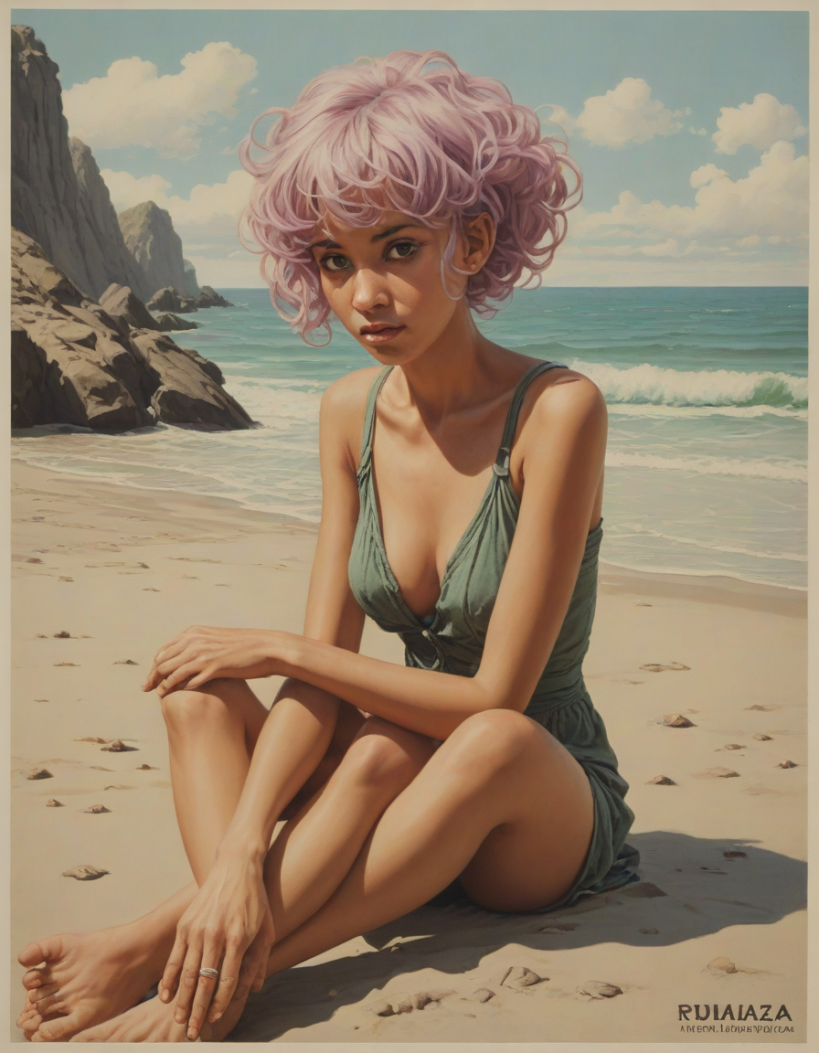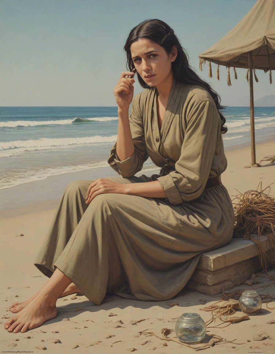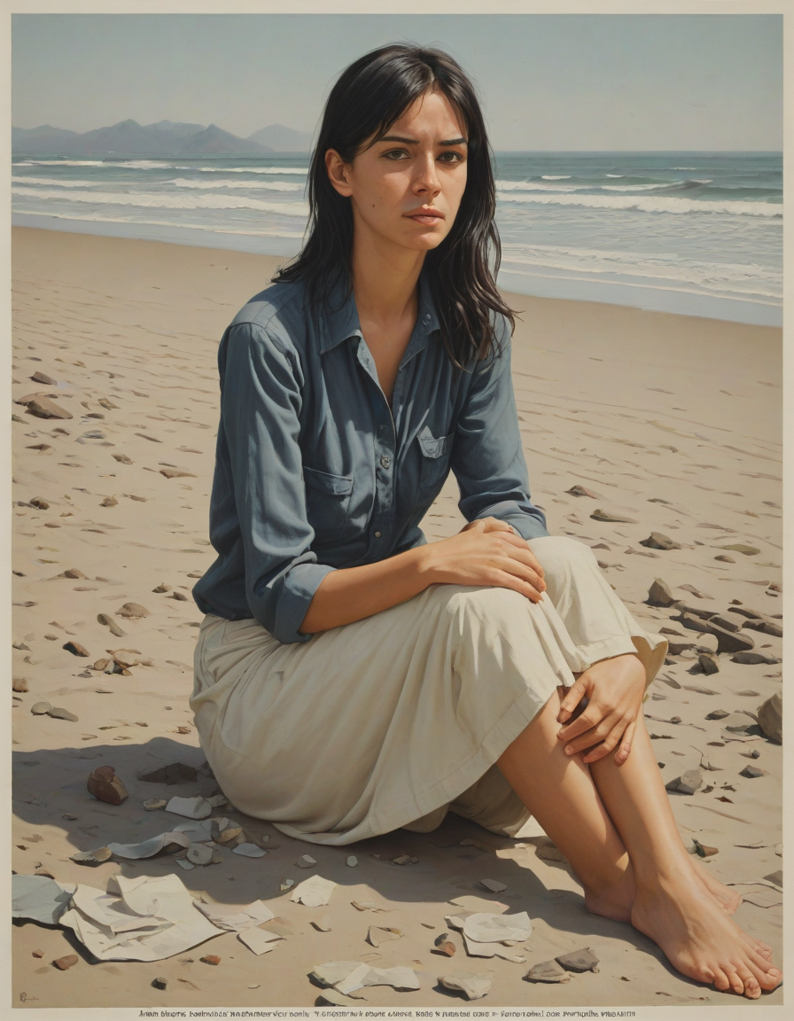 propaganda poster, sitting alone on beach, afraid, looking at viewer