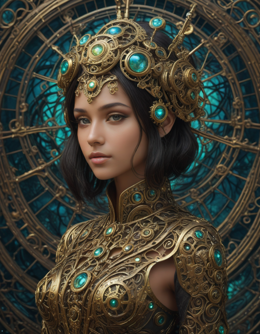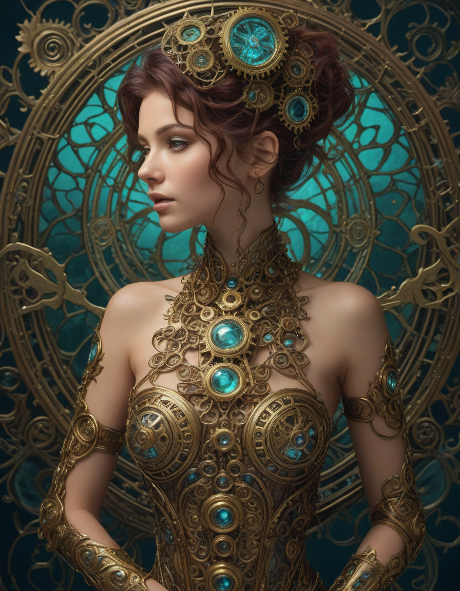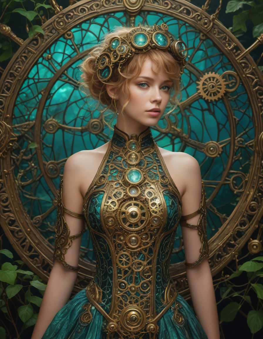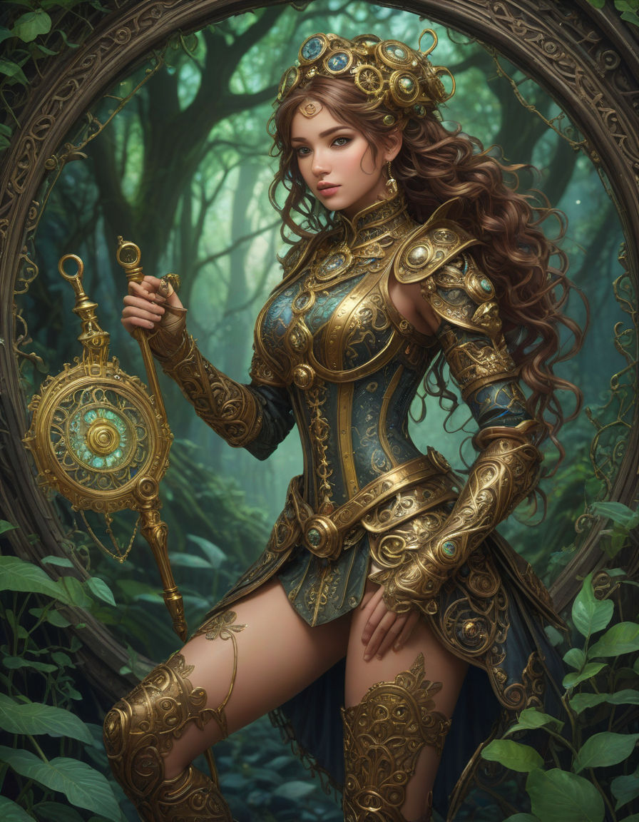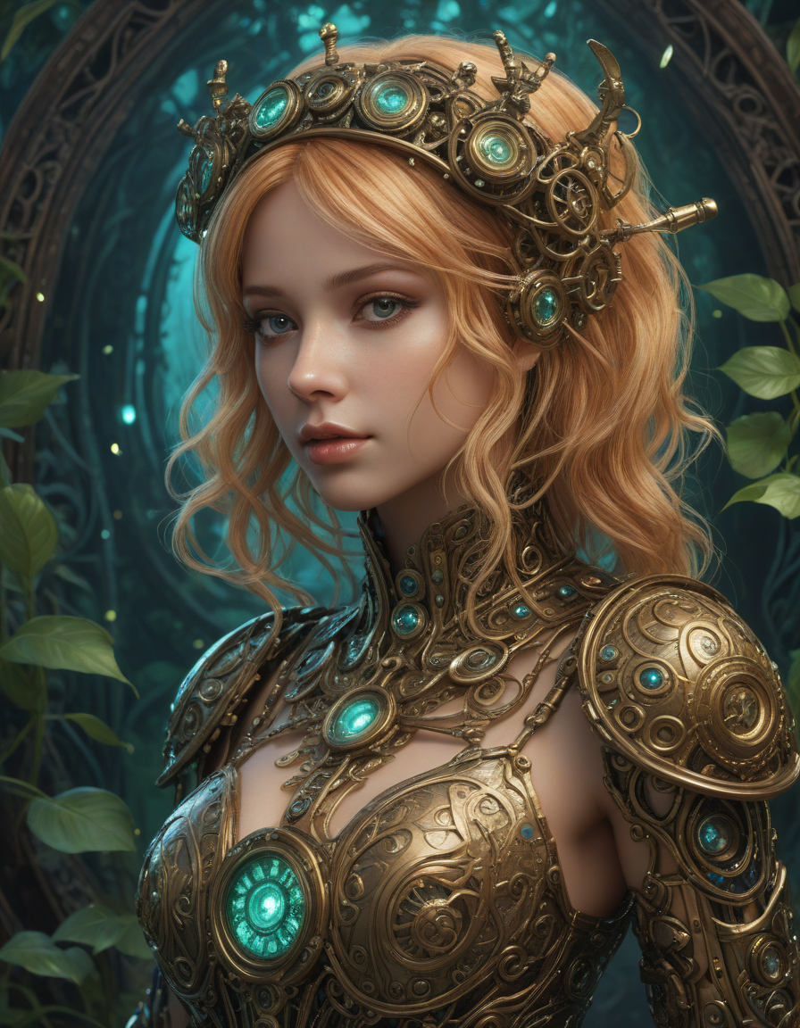 glowing magical aura, shimmering sparkles of magic, intricate steampunk accessories, gears and brass, highly detailed texture, magical fantasy forest, bioluminescent plants, ethereal atmosphere, cute, adorable, highly detailed steampunk armor with intricate gears and mechanisms, art nouveau, elegant curved lines, nature-inspired motifs
