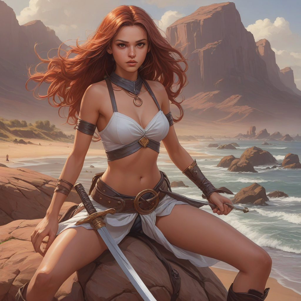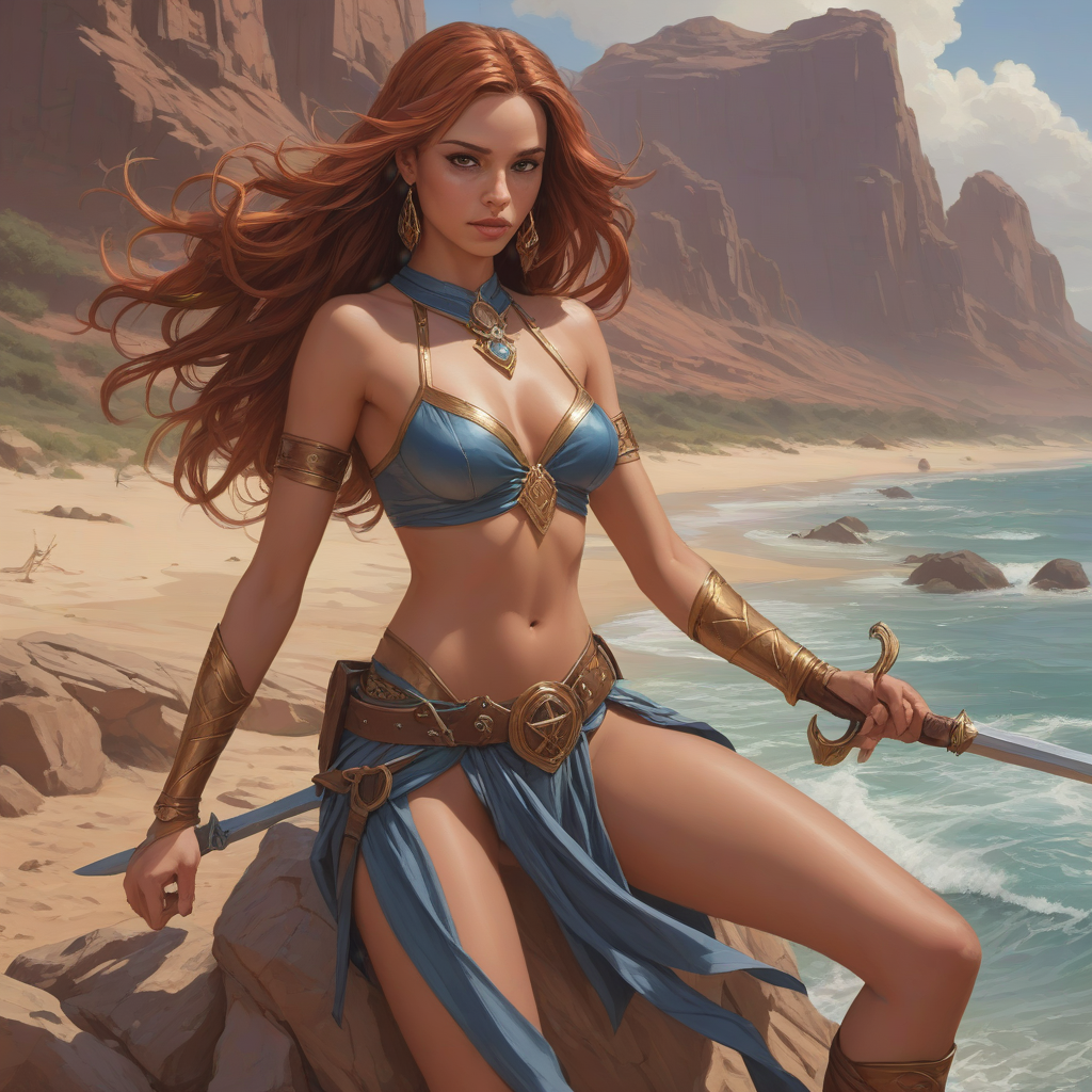 Intense contrast of, the sound of your heart thudding in your ears, stranded in the heart of a deserted island, the Mirage Queen lounges in a sea of tan sands, her turquoise tail flickering in intricate patterns, captivating even the rocky outcrop as it melts into the horizon, catwalk