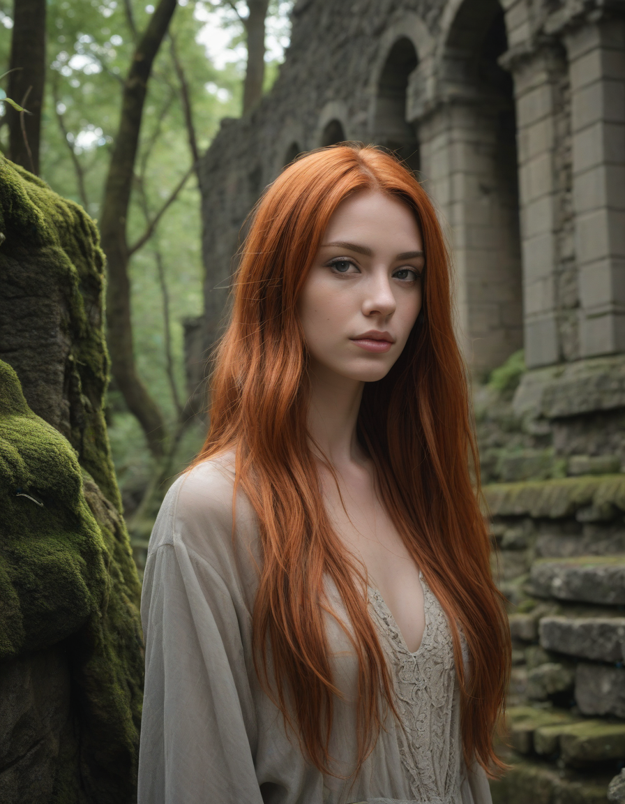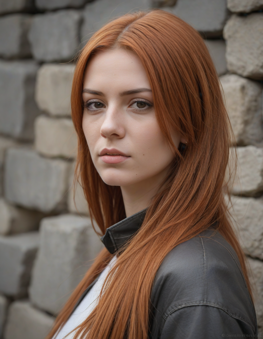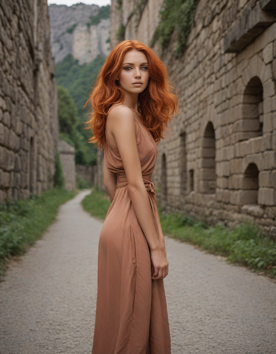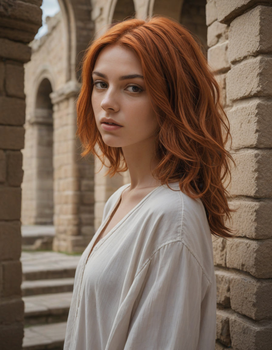 Gaia from Italy, medium chin-length wild auburn orange hair
