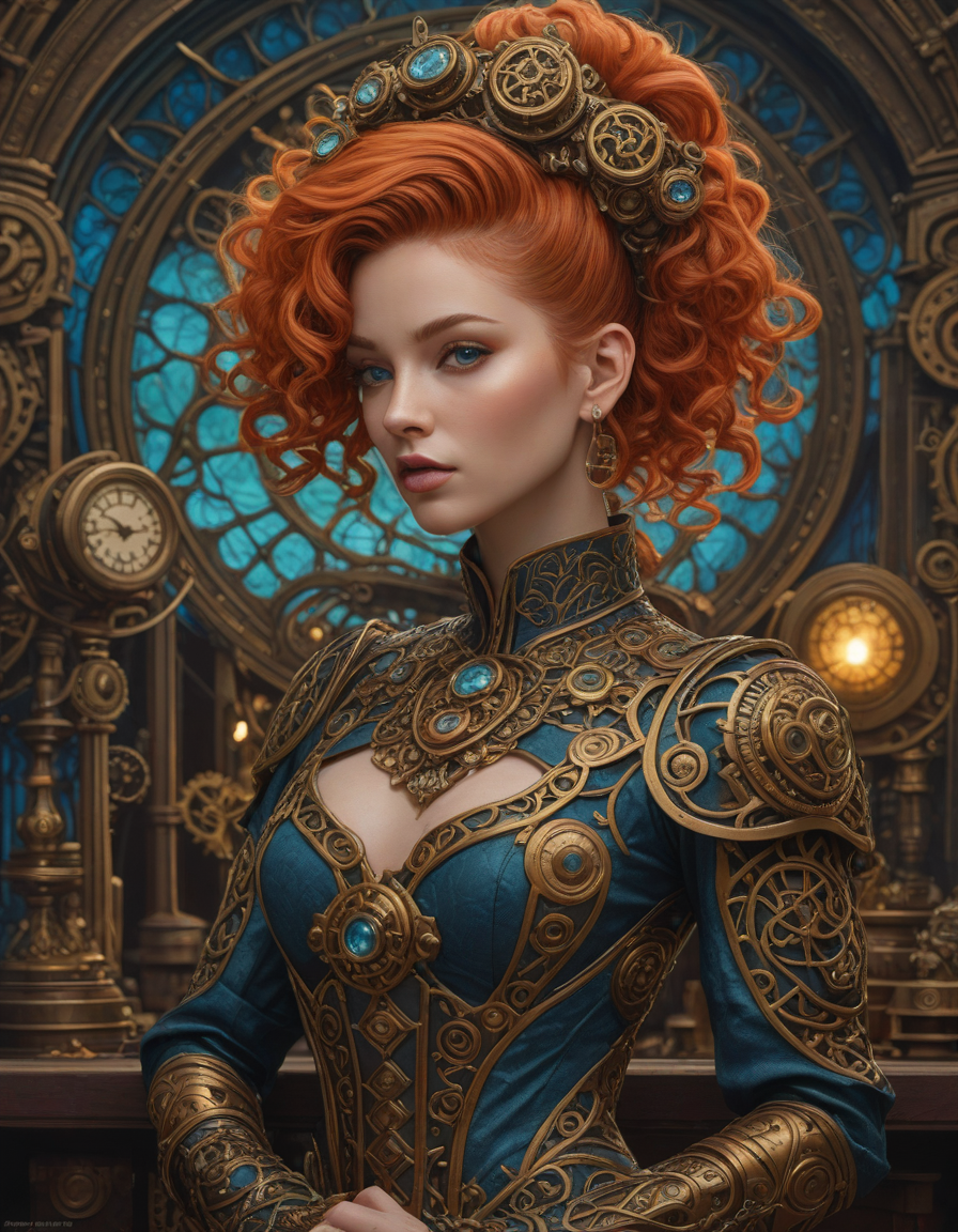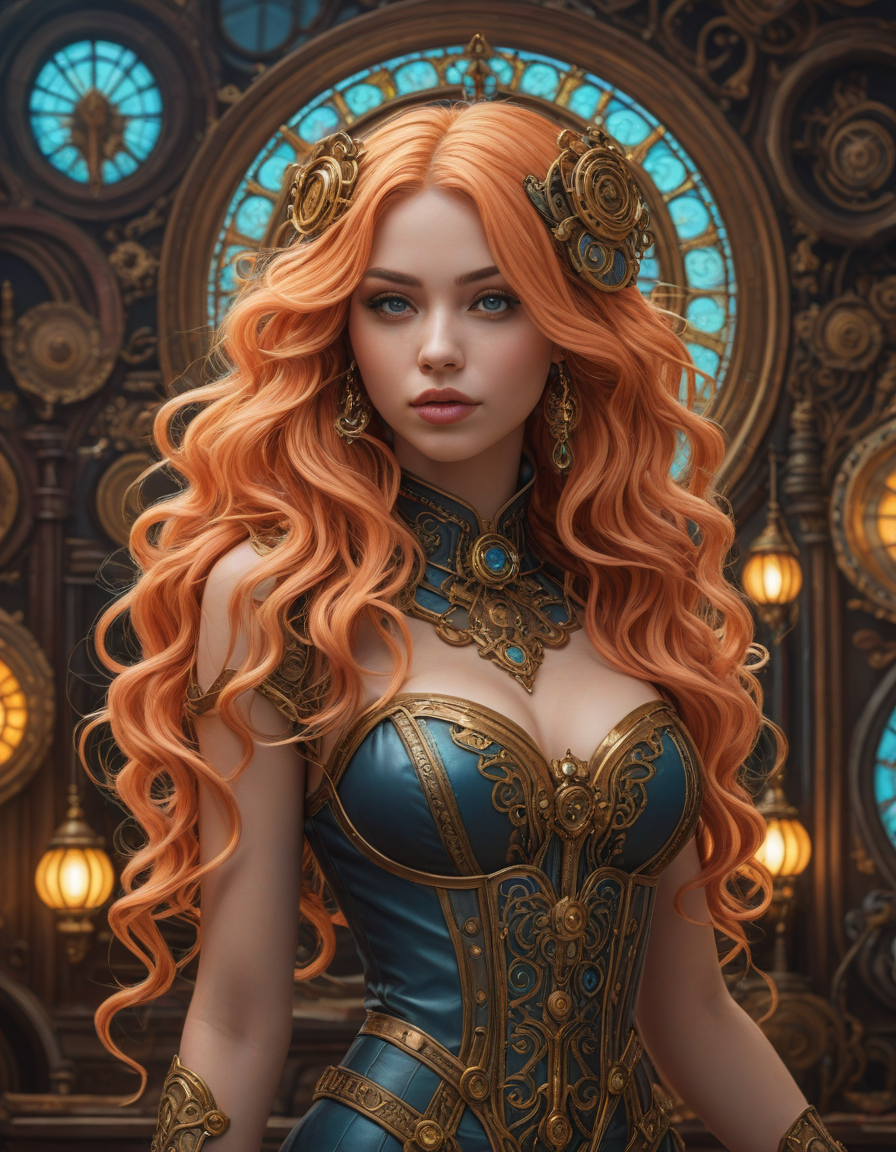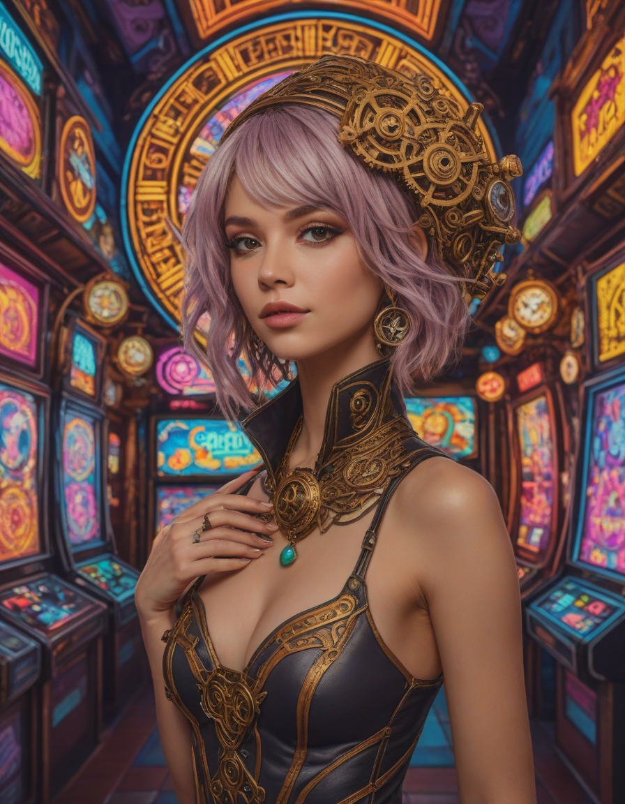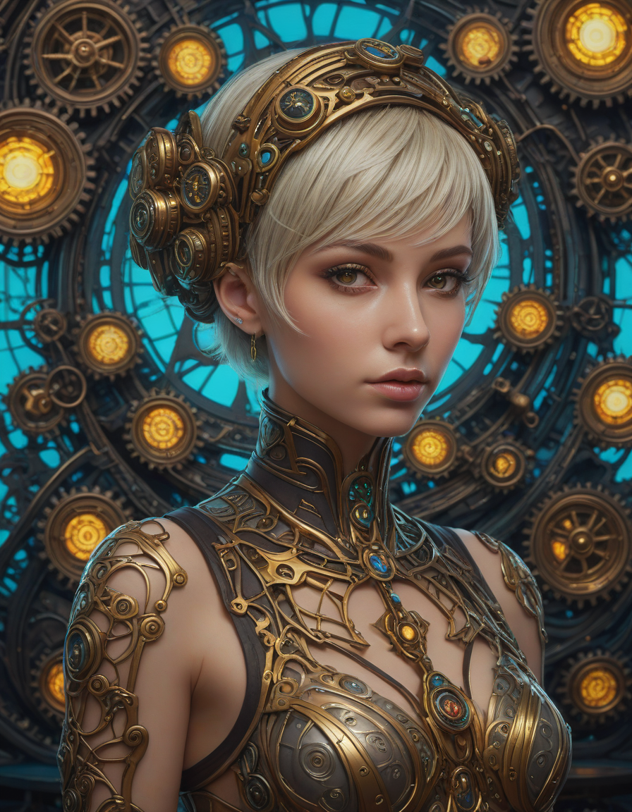 intricate steampunk accessories, gears and brass, art nouveau style, whimsical, cyberpunk, neon lights, futuristic cityscape, vibrant saturated colors, bold contrasting palette