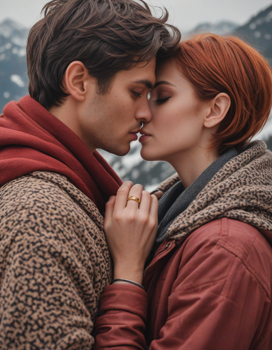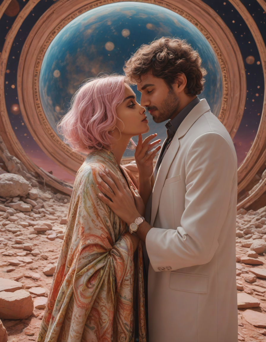 kissing, lively, expertly blending, mesmerizing color palette, cuddling together under a blanket, driven mad god, vibrant, retro disco outfit, extremely detailed, Enigmatic, crimson-flecked eyes, partying, charming, holding a paintbrush