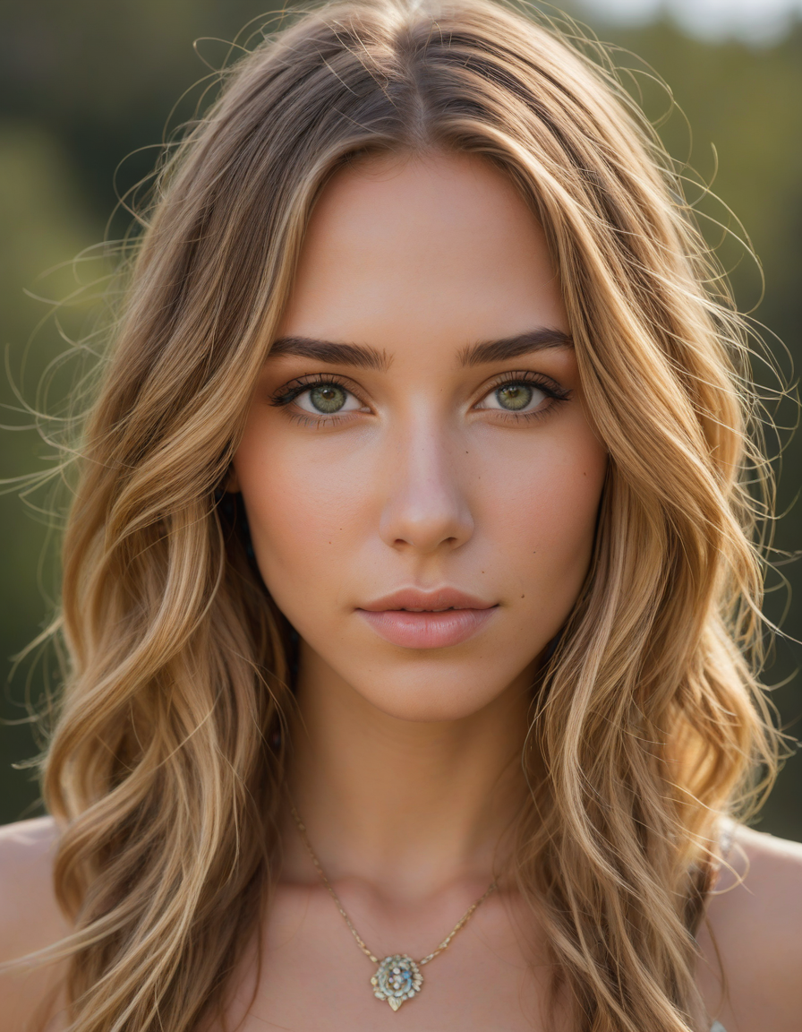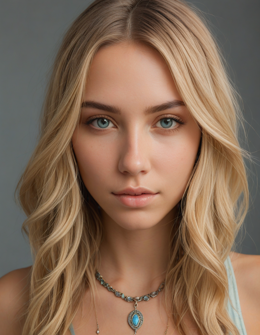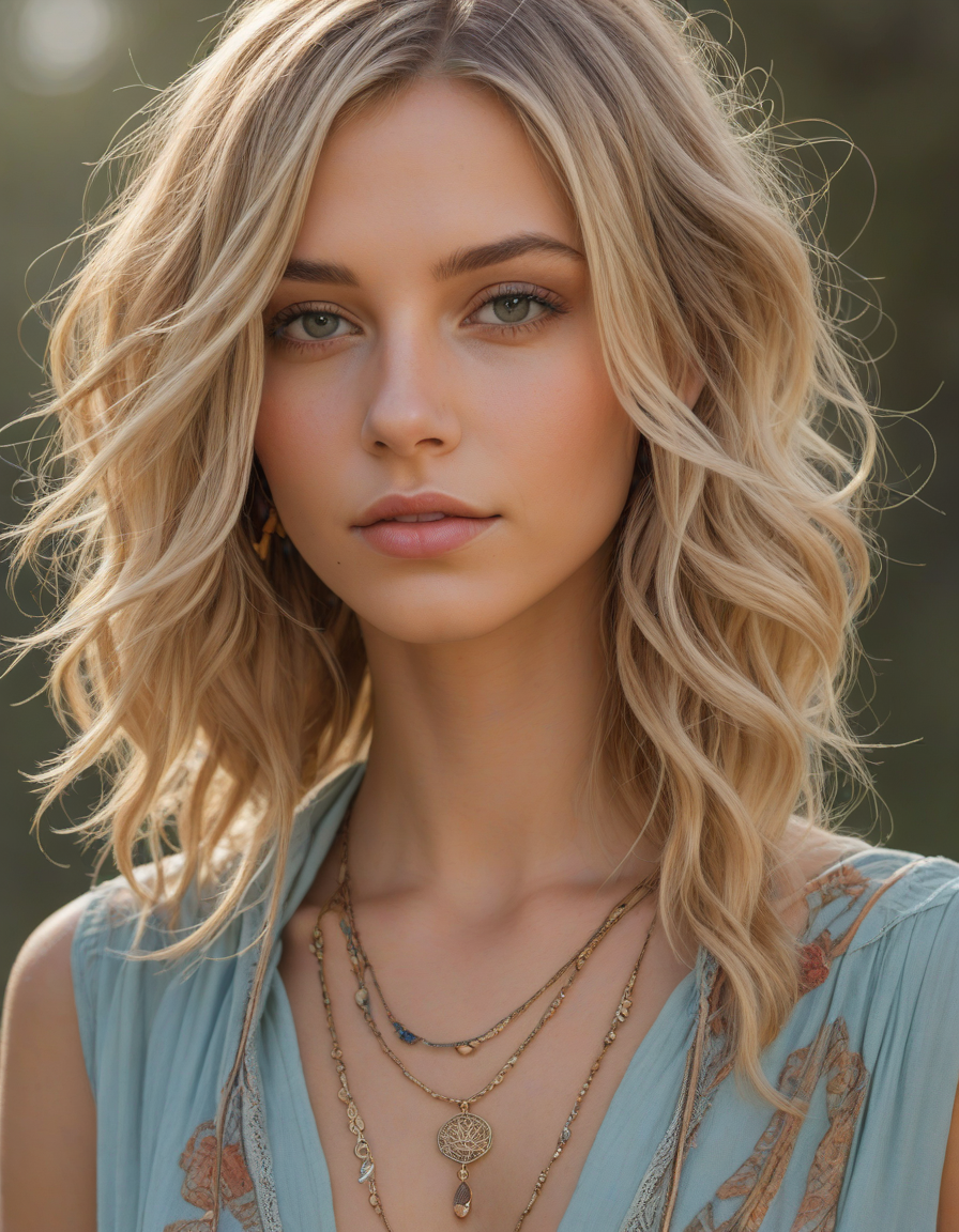 bohemian, "free spirit", jewelry, tattoo, spring dress, oval face shape, almond-shaped eyes, voluminous lashes, slightly arched eyebrows, narrow nasal bridge, rounded nose tip, symmetrical nostrils, full lips, pronounced cupid's bow, slightly fuller lower lip, defined cheekbones, rounded chin, smooth complexion, softly contoured jawline, balanced facial proportions, symmetrical features, gently curved eyelids, soft brow ridge, harmonious cheek to jawline transition, subtle philtrum, delicate ear lobes, straight blonde hair, clear skin, hooded eyelids, light pink lip color, slightly pouty expression, casual pose with hand on face, slight head tilt, indoor lighting, Light blue irises, Medium-thickness eyebrows, Softly angled eyebrows, A hint of freckles across the nose and cheeks, Natural makeup, Gentle frown lines between the eyebrows, Soft nasolabial folds, Smooth forehead, Subtle dimple on the chin, Clear facial contour without distinct shadows, Even skin tone with a hint of natural pink undertones, Slightly rosy cheeks, Tapered jawline, Fine hair texture with gentle waves, Youthful appearance with soft facial features