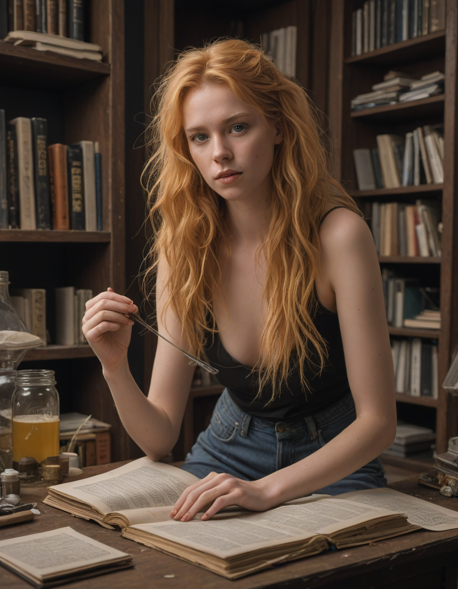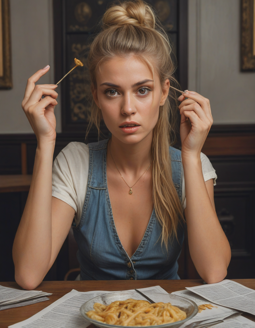 newspaper editorial photography, took too many drugs, Unkempt, Trembling hands clutching a cold metal weapon, agitated brows, decadent feast, nervously wringing damp trembling hands, New Romantic 80s clothing, holding a yoga pose, a head tilting, a question asked without words, they are flushed with embarrassment, dripping with honey, yellow cat-like eyes, torn jeans and combat boots