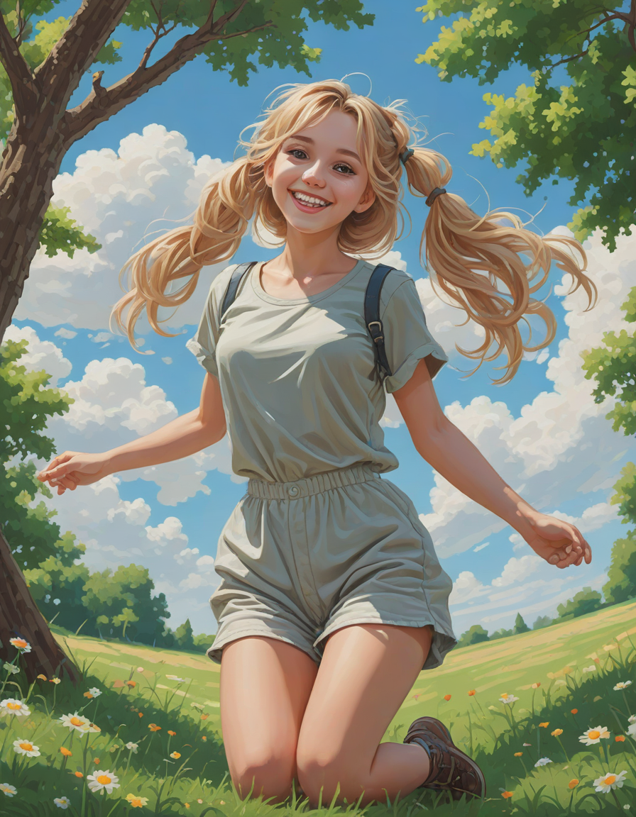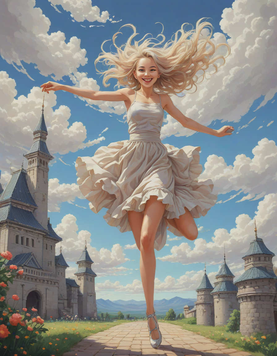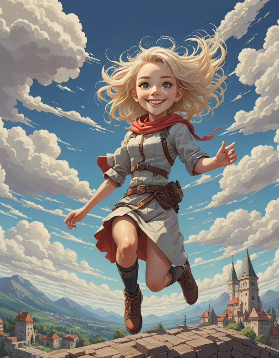 smiling, jumping for joy, pixel art, eyes wide with wonder, whimsical clouds