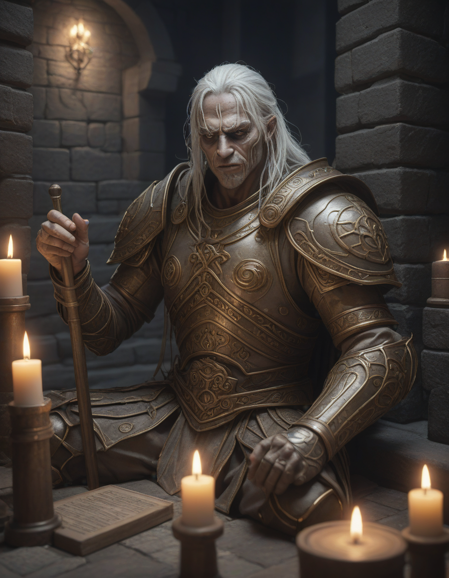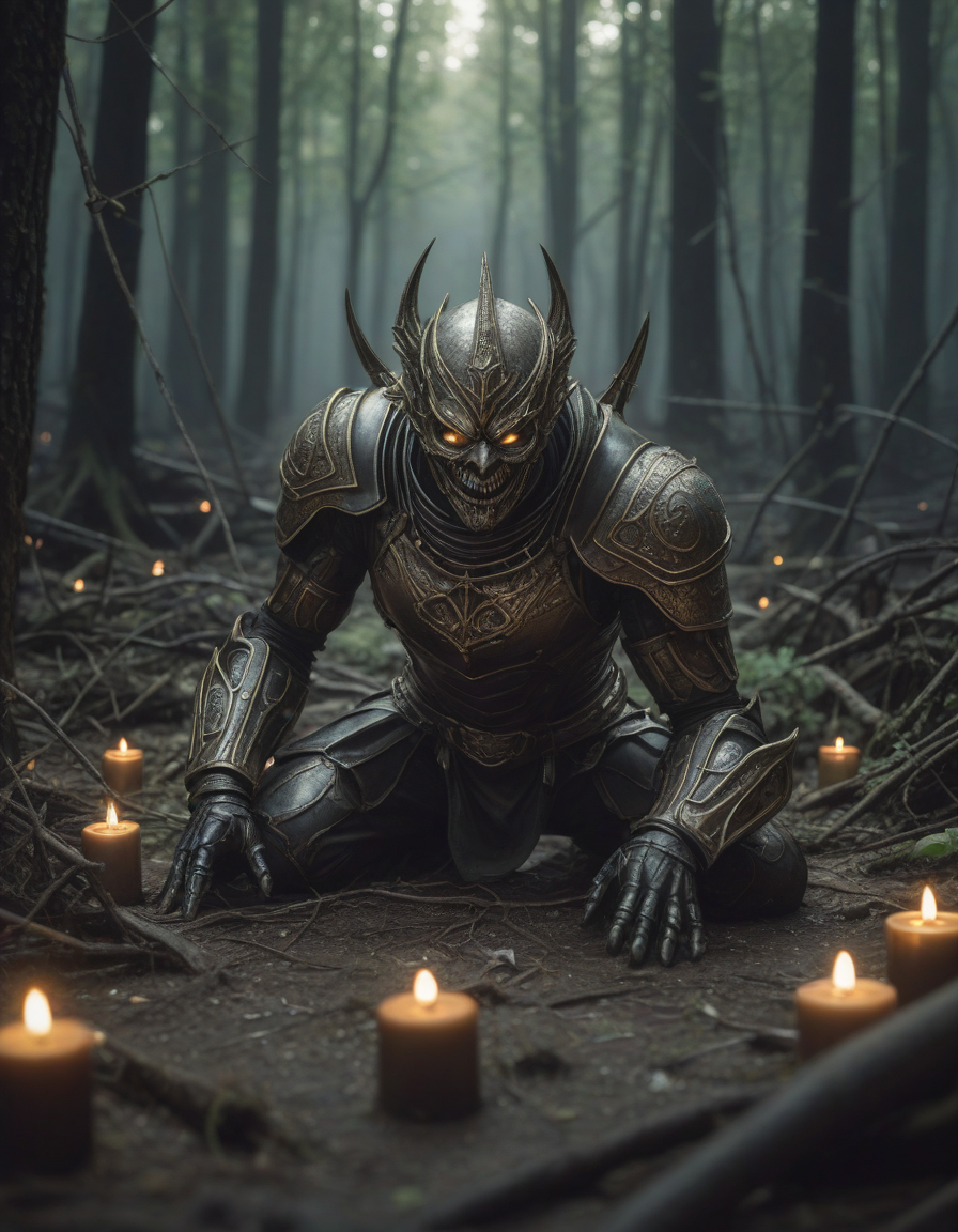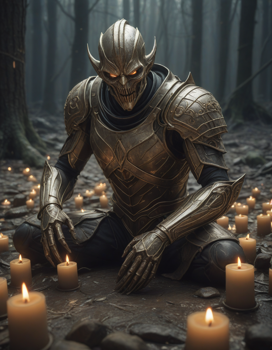 Passed out, legendary, armor-clad hero, An ethereal being drifts past, trollface, polished, Glistening in the light of a thousand candles, suspenseful chase scene