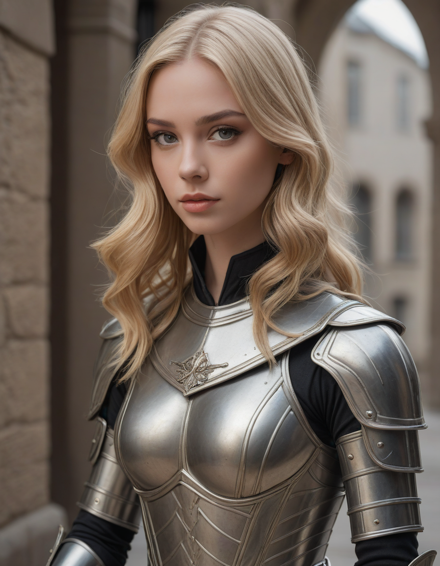 elegant, high waist tight overknee stiletto boots, oval face shape, almond-shaped eyes, voluminous lashes, slightly arched eyebrows, narrow nasal bridge, rounded nose tip, symmetrical nostrils, full lips, pronounced cupid's bow, slightly fuller lower lip, defined cheekbones, rounded chin, smooth complexion, softly contoured jawline, balanced facial proportions, symmetrical features, gently curved eyelids, soft brow ridge, harmonious cheek to jawline transition, subtle philtrum, delicate ear lobes, straight blonde hair, clear skin, hooded eyelids, light pink lip color, slightly pouty expression, casual pose with hand on face, slight head tilt, indoor lighting, Light blue irises, Medium-thickness eyebrows, Softly angled eyebrows, A hint of freckles across the nose and cheeks, Natural makeup, Gentle frown lines between the eyebrows, Soft nasolabial folds, Smooth forehead, Subtle dimple on the chin, Clear facial contour without distinct shadows, Even skin tone with a hint of natural pink undertones, Slightly rosy cheeks, Tapered jawline, Fine hair texture with gentle waves, Youthful appearance with soft facial features, brick wall -> great window view, wearing complete set of armor, wearing full armor, Wearing chest armor, wearing leg armor, wearing feet armor, wearing bracer, wearing pauldrons, Wearing helmet, Wearing breastplate, Wearing gauntlets, Wearing greaves, Wearing pauldrons, Wearing vambraces, Wearing cuisses, Wearing sabatons, Wearing gorget, Wearing tassets, Wearing bracers, Wearing cuirass, Wearing faulds, Wearing plackart, Wearing spaulders, Wearing besagews