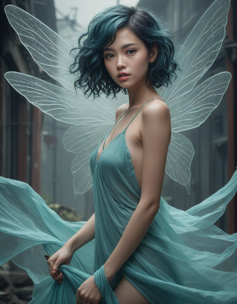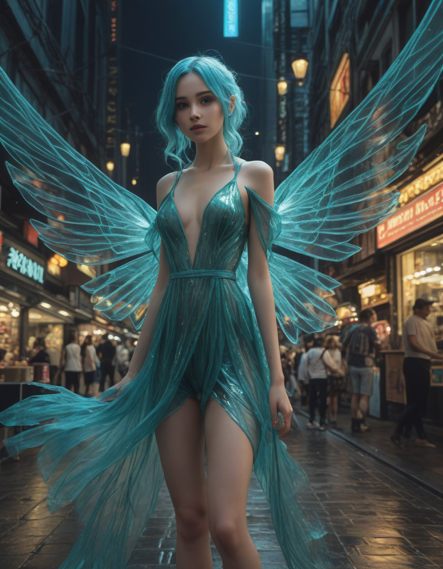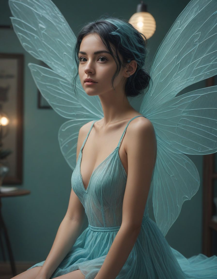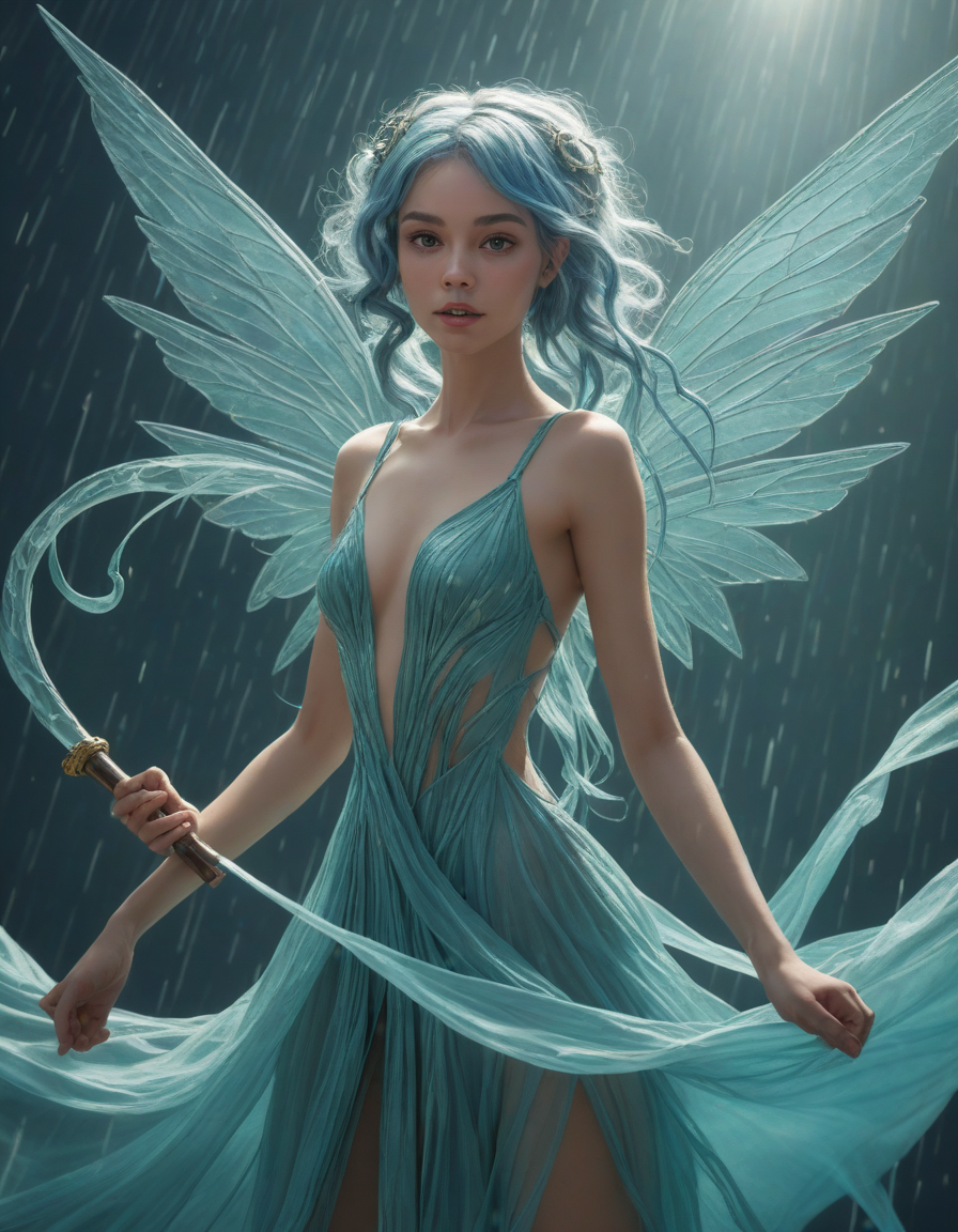 Ethereal brush strokes across the canvas of life, security camera footage, wielding a scythe, brunette, Tron-like, surprised, a radiant, aquamarine-haired fairy flitting about on delicate, translucent wings, Gazing in disbelief, Warmly Welcoming, cel-shaded scene