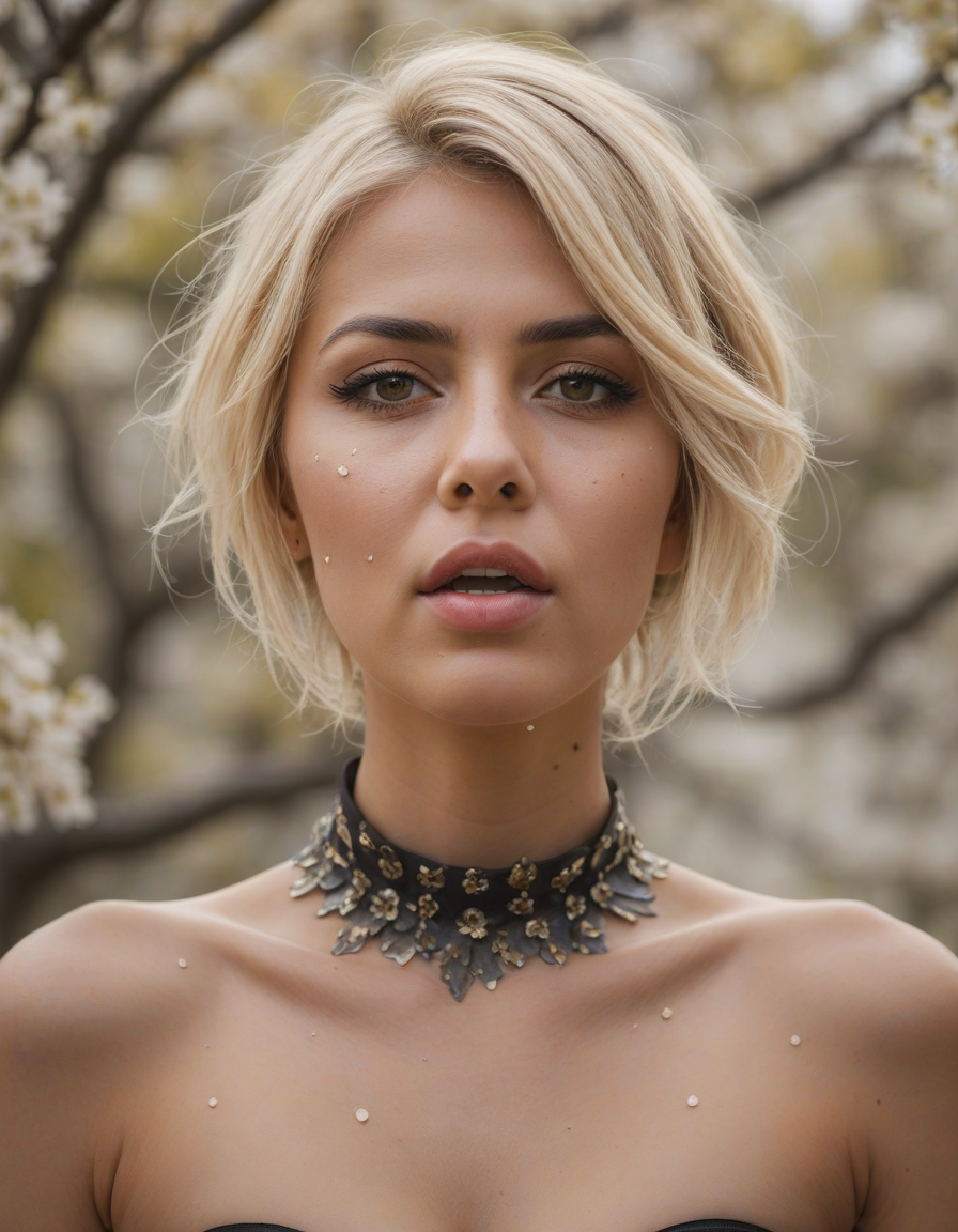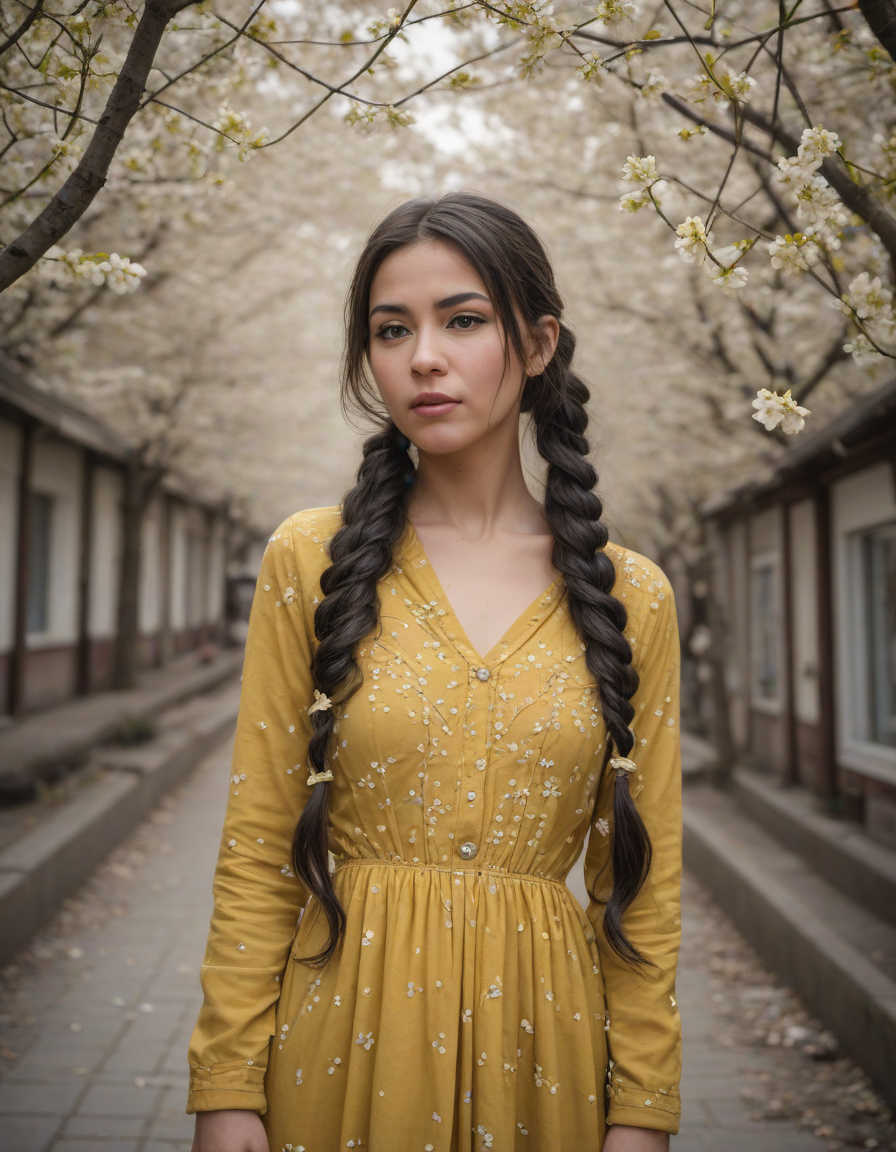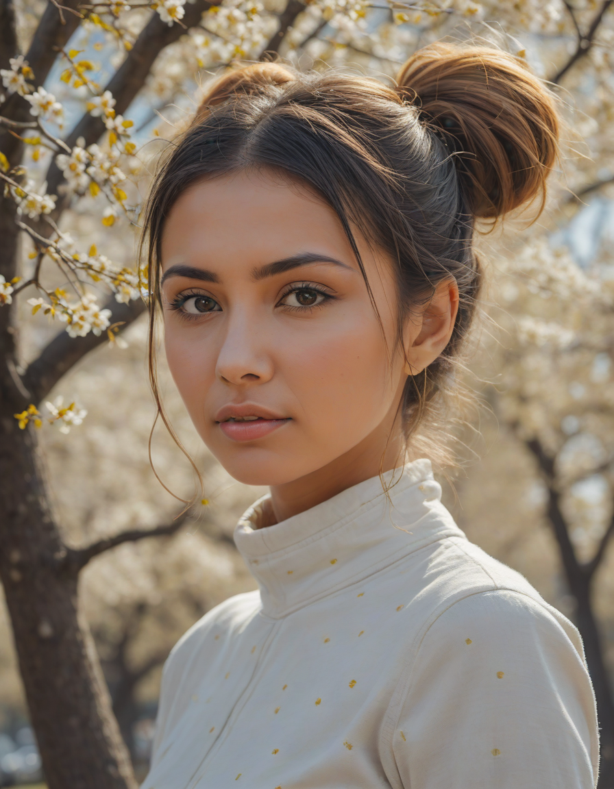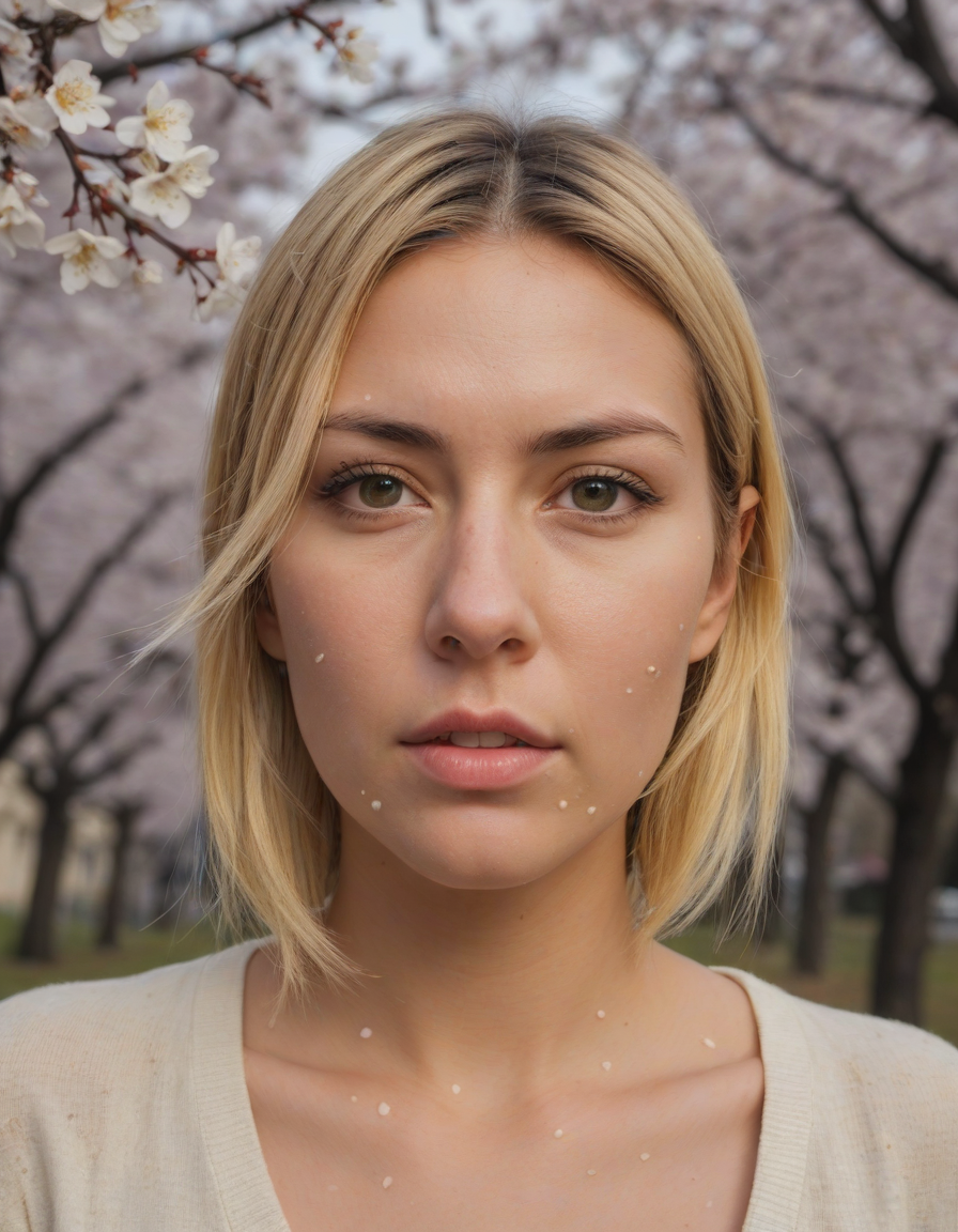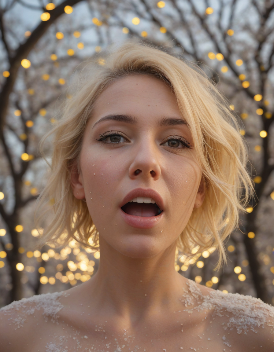 puffed out cheeks, crazy insane stunt, gasping, stencil, Look of pride, yellow, Surrounded by gleaming lights, Blossoming cherry trees, petals falling like snow