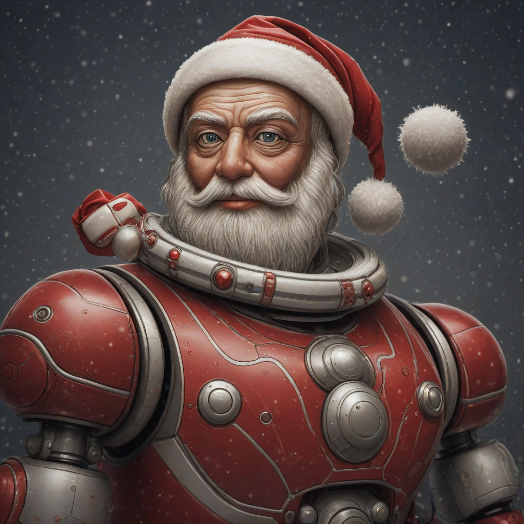 nervous anticipation, electric, duke nukem, robot santa claus, wood elf, in a blizzard, richly textured oil painting, disco ball evening, rich, Intense focus, angelic, Dreamlike wonderland, 90s anime