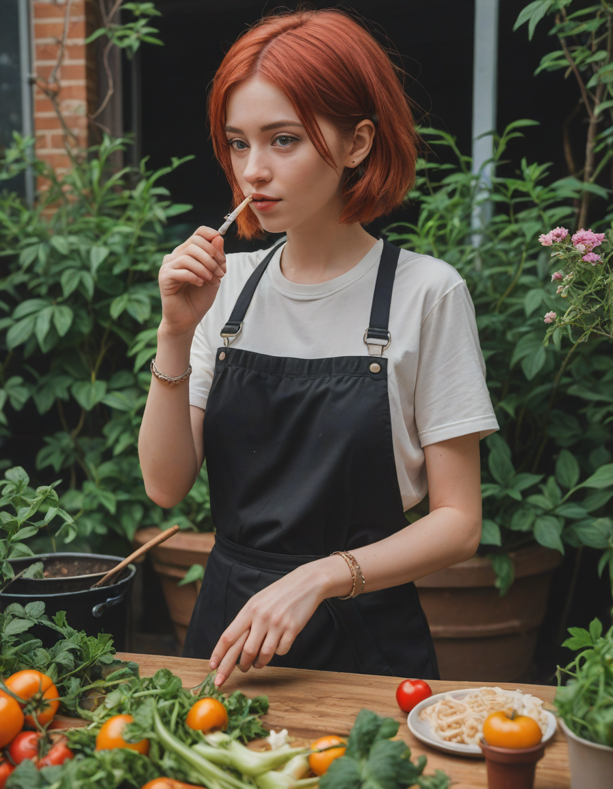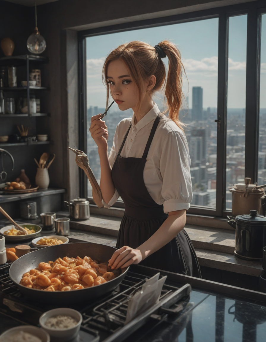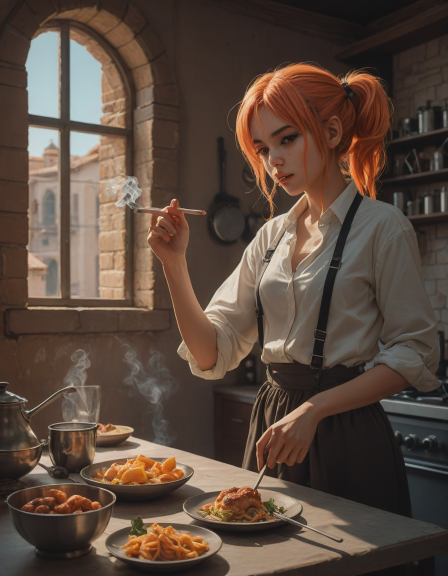 cooking an extravagant meal, secretly in love, color grading, savoring the view, smoking a cigarette looking cool, anime