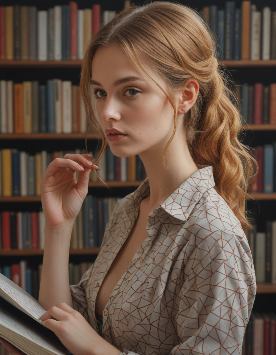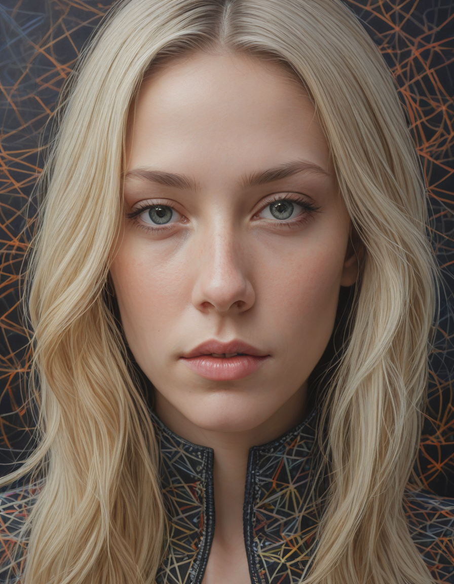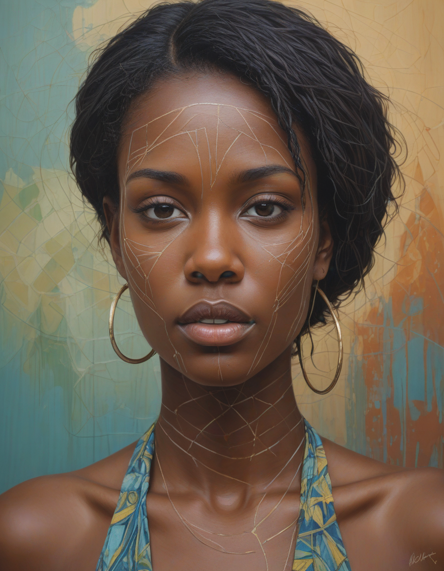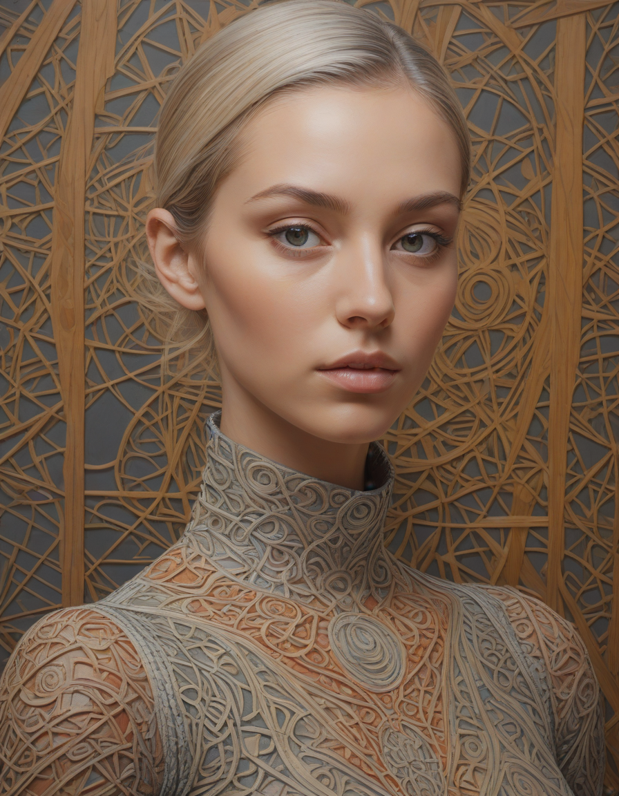 ski mask, sultry look, Serene complexity in subjects portrayed, mathematics, Angular patterns over subjects, A painter meticulously blends hues on a wooden canvas