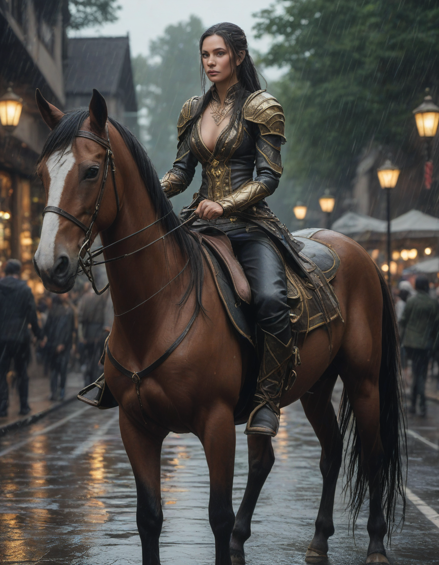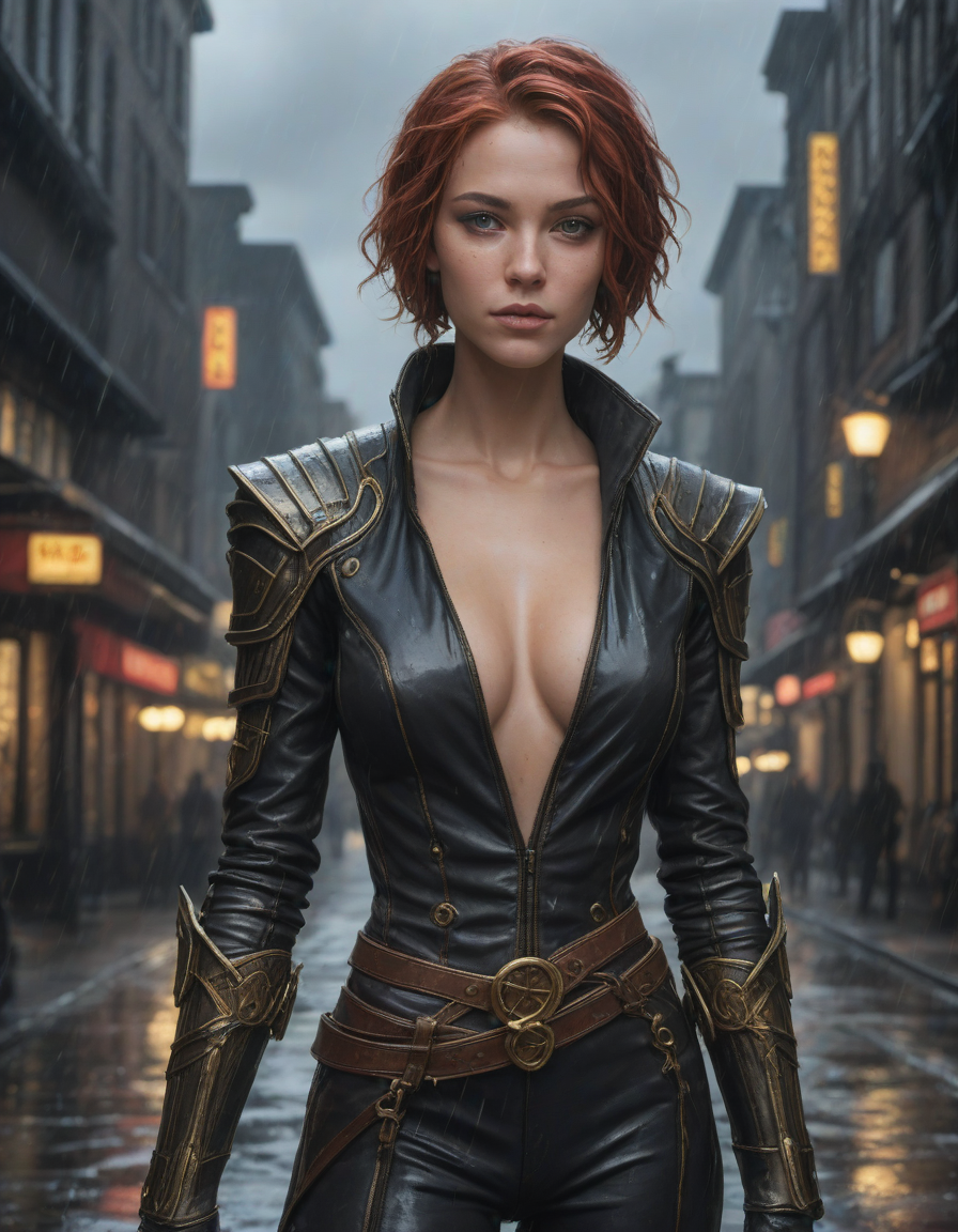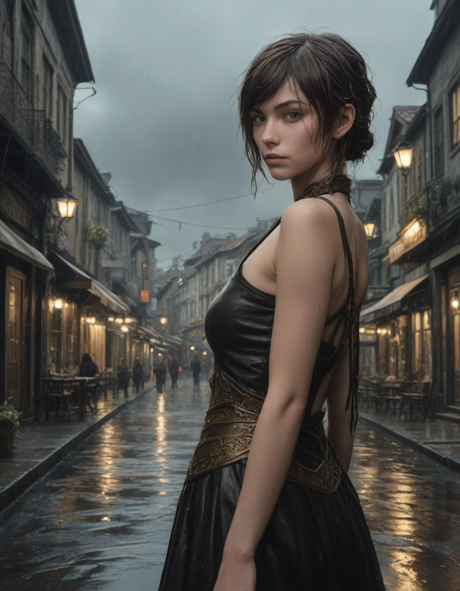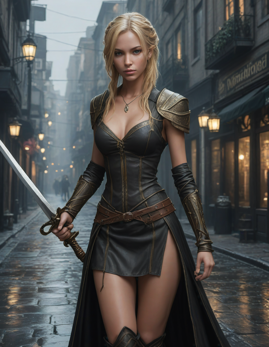 in skyrim, Velvet hair cascades in buoyant tendrils down delicate shoulders, glinting like spun gold in a chink of sunlight, resplendent intelligence, holding a sword, Rain-streaked pavement, neon lights reflecting