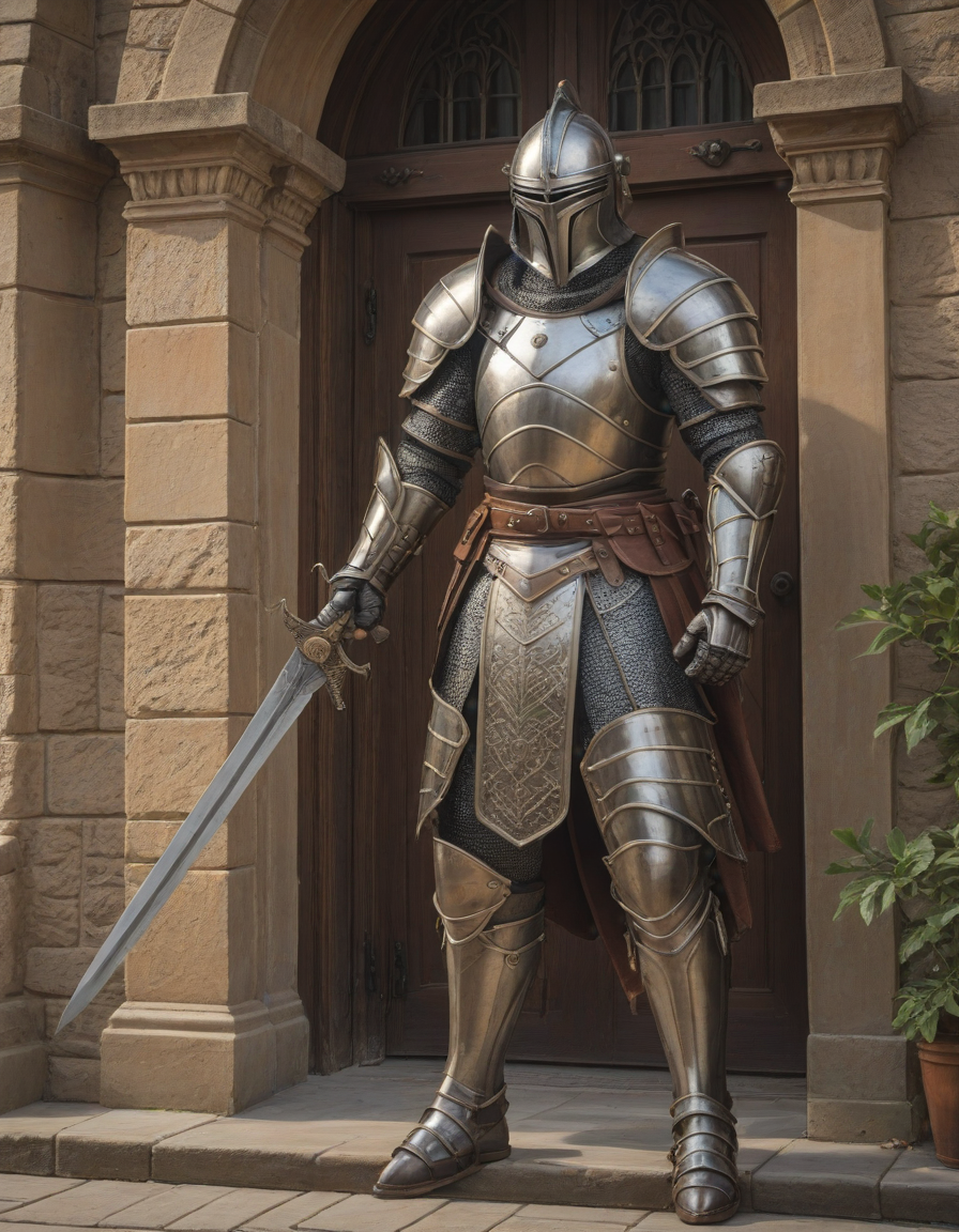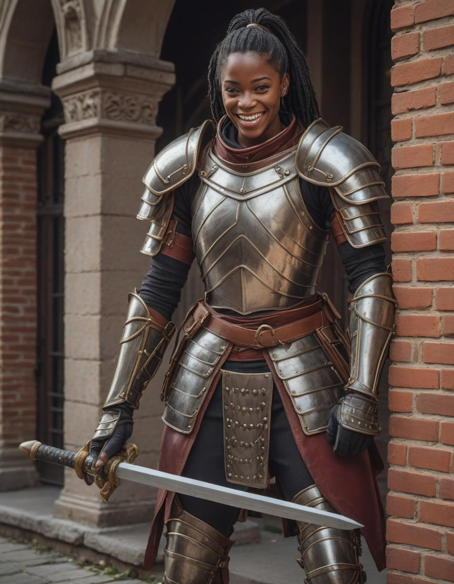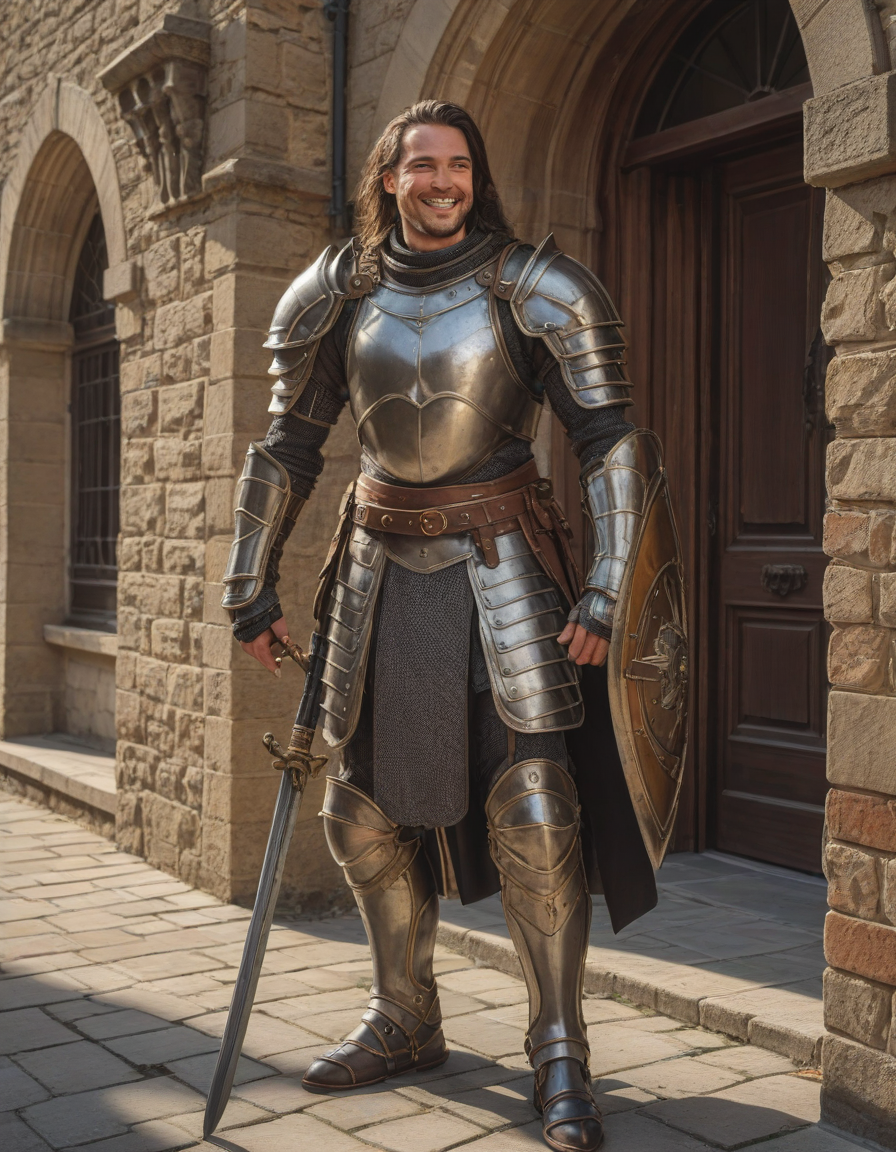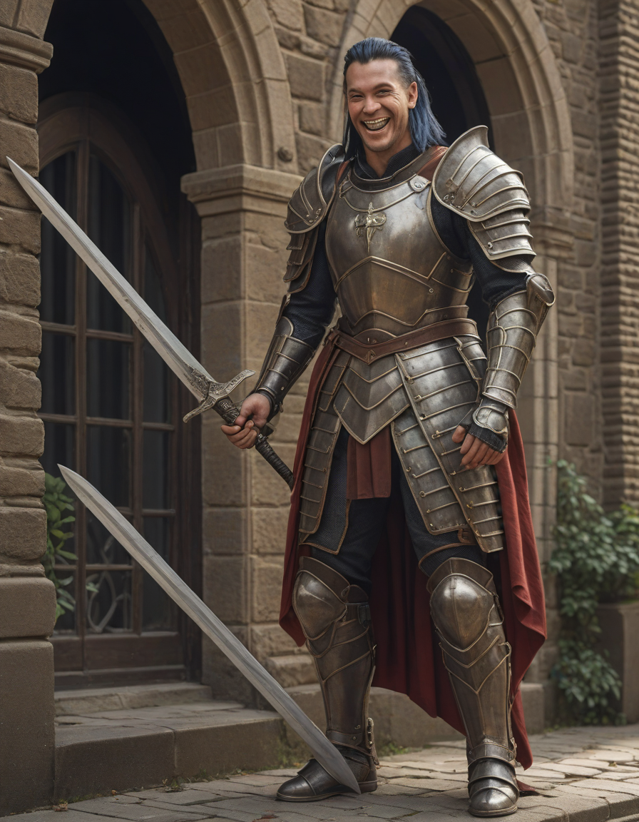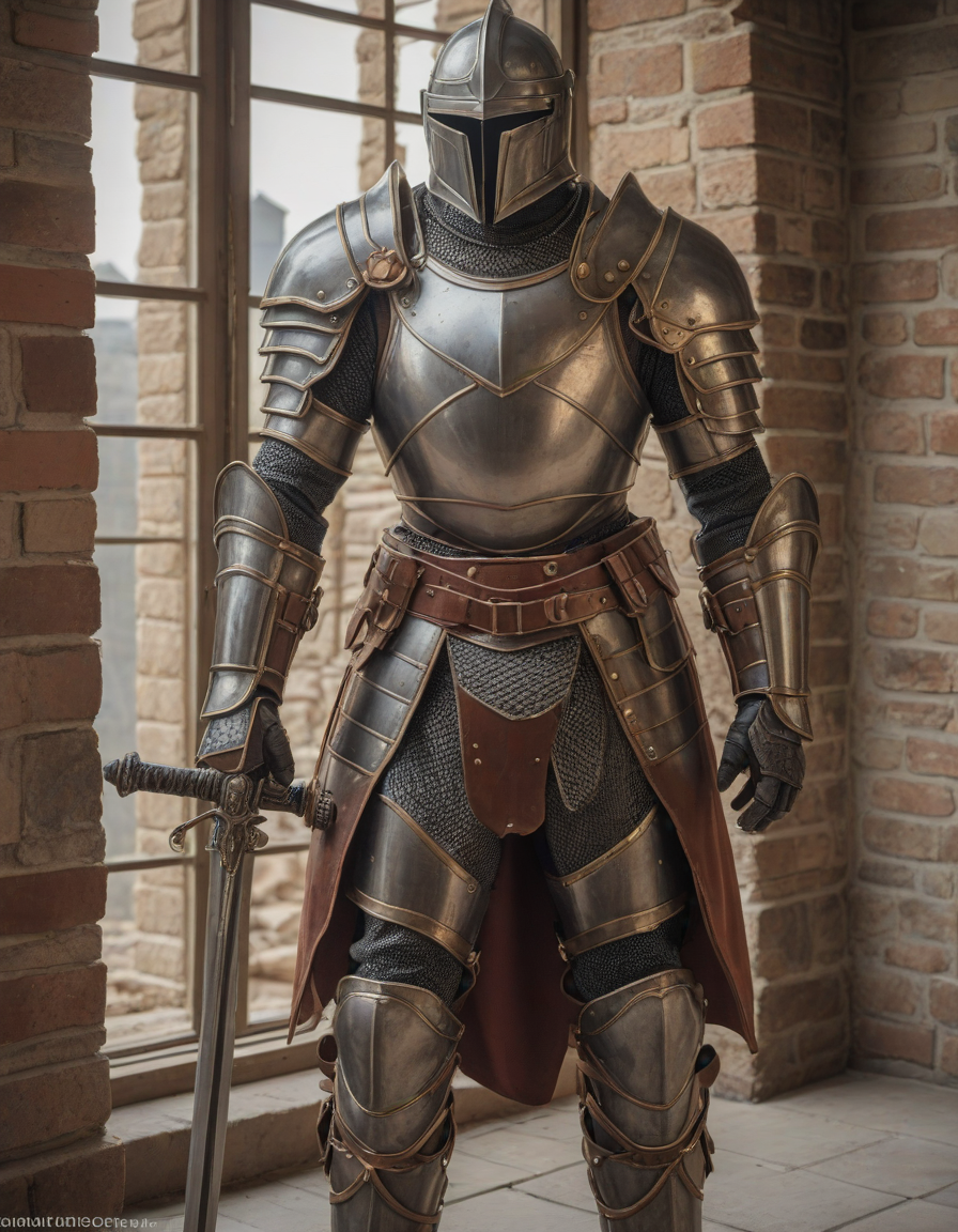laughing, wearing complete set of armor, wearing full armor, Wearing chest armor, wearing leg armor, wearing feet armor, wearing bracer, wearing pauldrons,, Holding a sword in both hands in a confident pose, detailed grip, detailed fuller, detailed pommel, detailed blade, detailed edge, , brick wall -> great window view, wearing complete set of armor, wearing full armor, Wearing chest armor, wearing leg armor, wearing feet armor, wearing bracer, wearing pauldrons, Wearing helmet, Wearing breastplate, Wearing gauntlets, Wearing greaves, Wearing pauldrons, Wearing vambraces, Wearing cuisses, Wearing sabatons, Wearing gorget, Wearing tassets, Wearing bracers, Wearing cuirass, Wearing faulds, Wearing plackart, Wearing spaulders, Wearing besagews