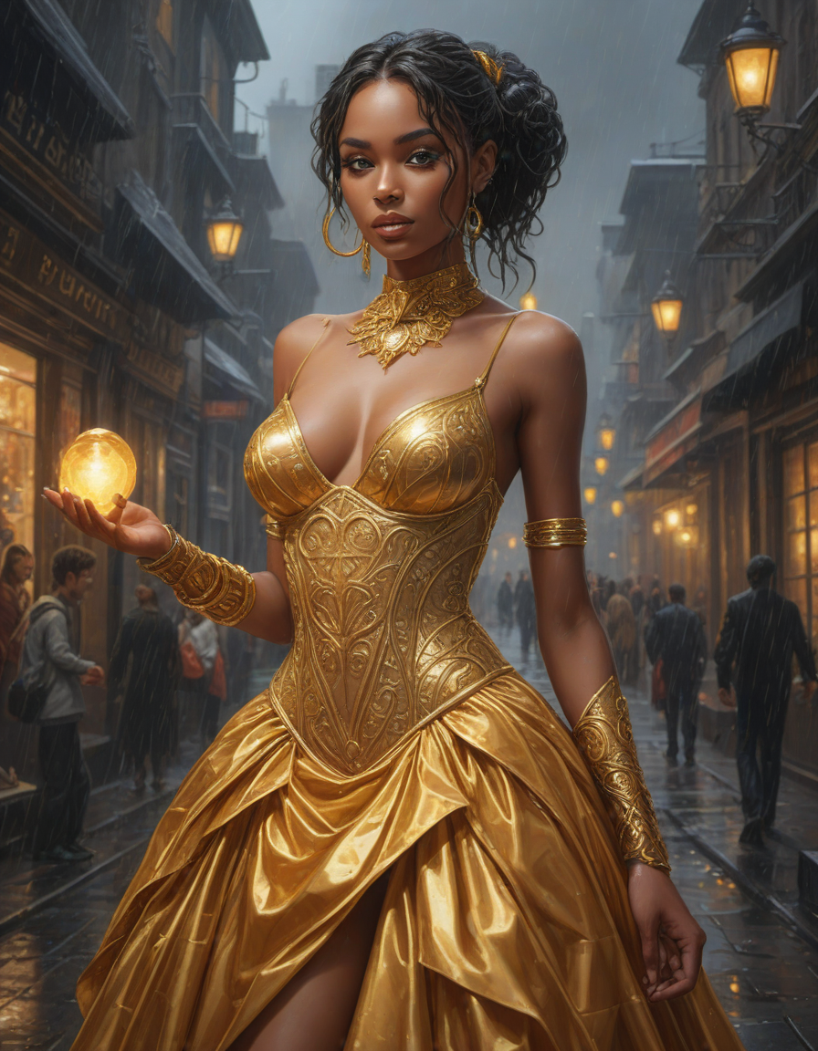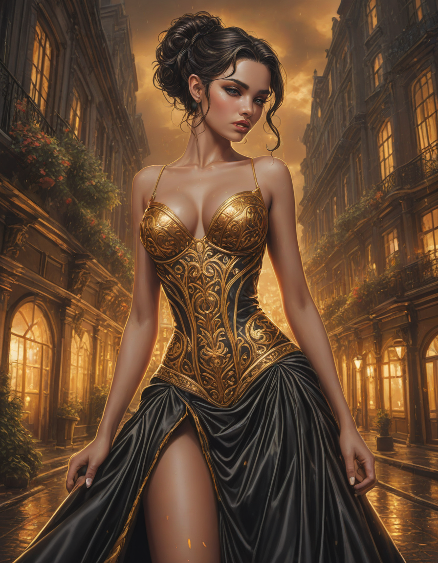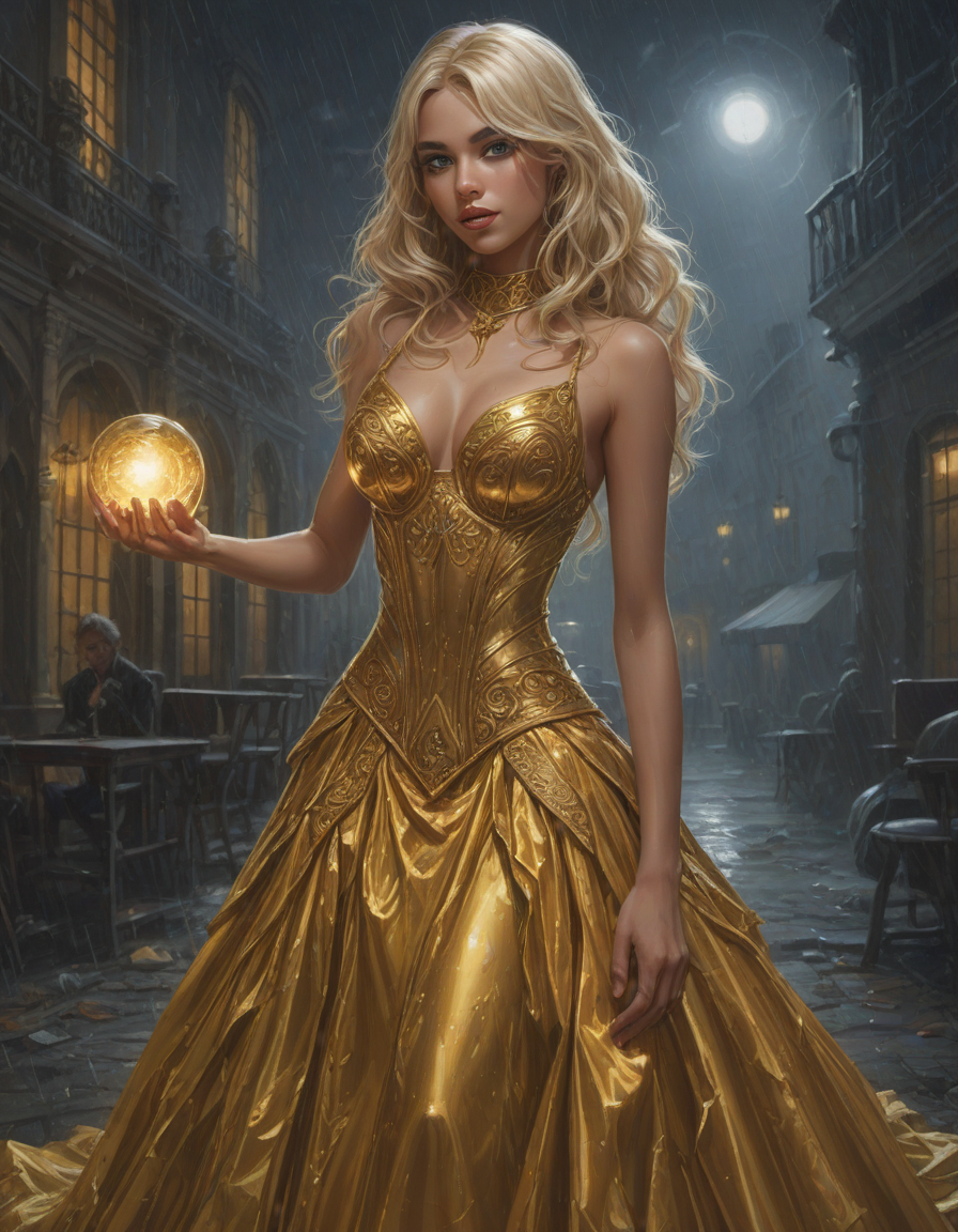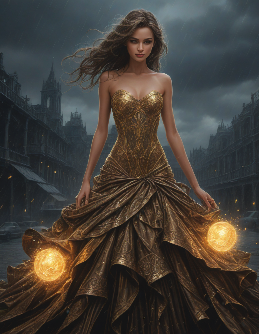 ornate, gold-trimmed ball gown, Curves softening in an alluring embrace, passionate, Shimmering splendor, emotional, 2000s indie comic art style, Old abbey on fire during dramatic rainstorm, Edgy fashionista, glowing orbs