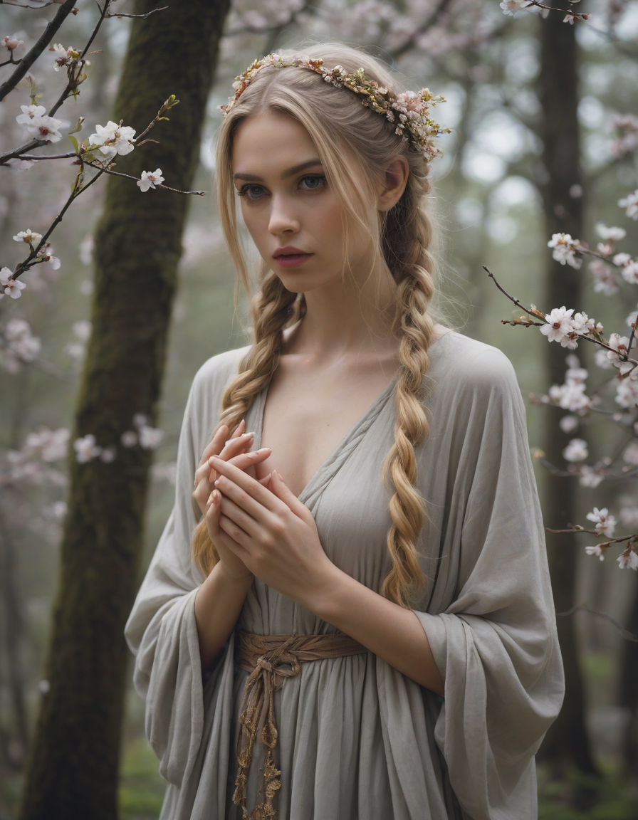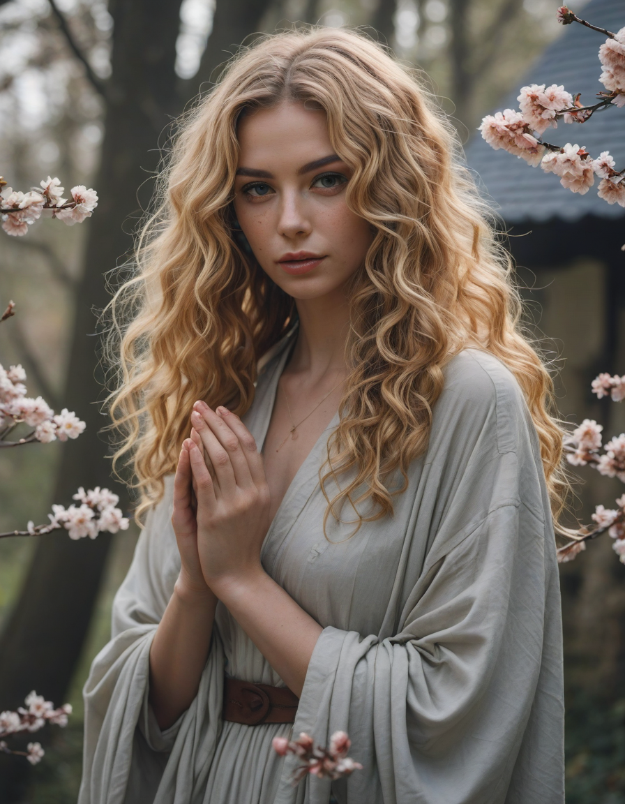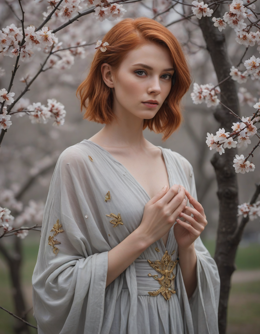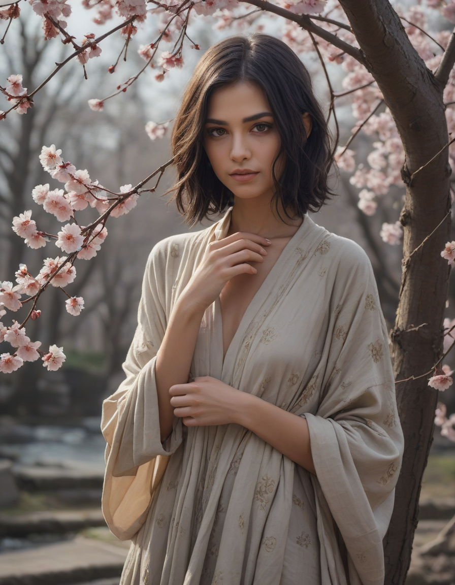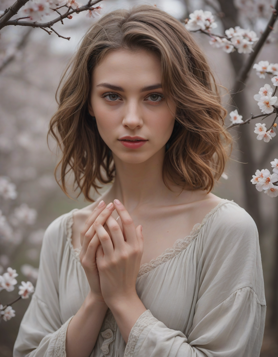 nice hands, mysterious enchantress, fade haircut, cool stony gaze, in love, nervously wringing damp trembling hands, Blossoming cherry trees, petals falling like snow, banshee