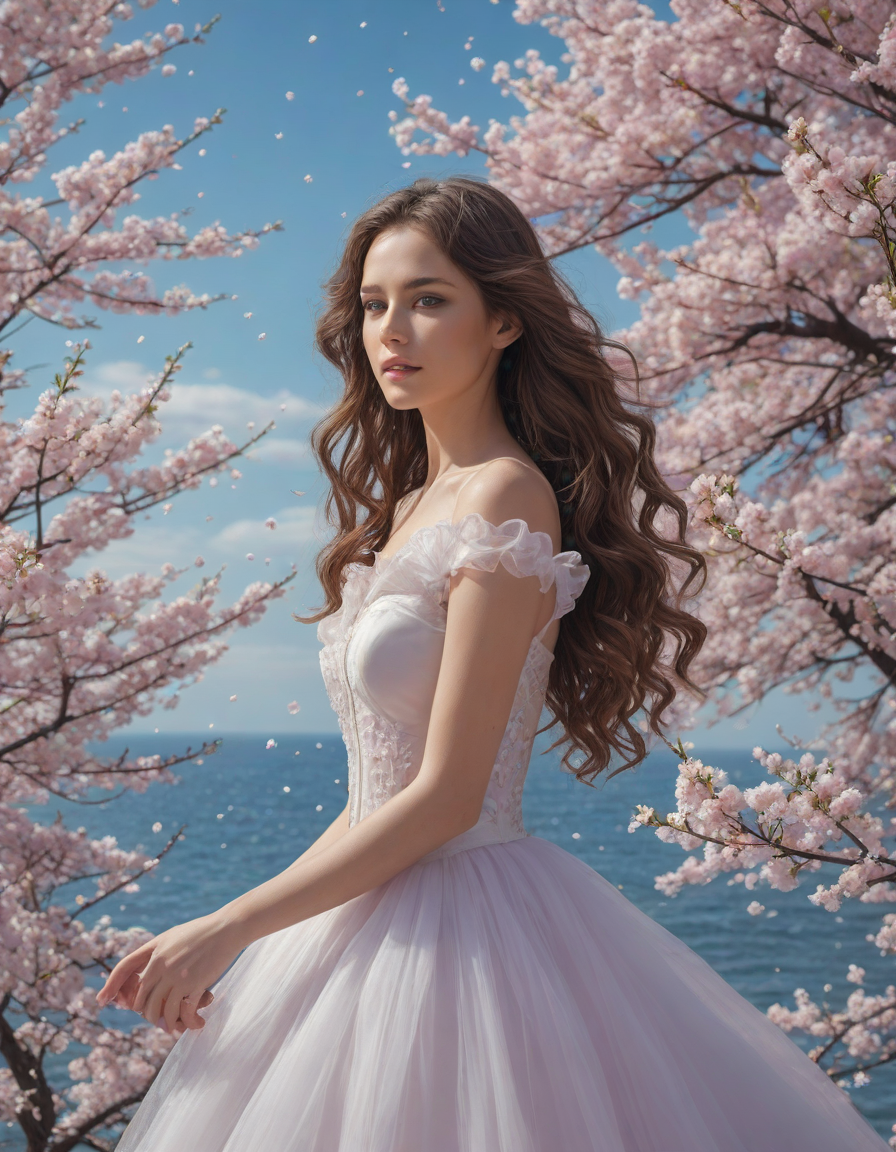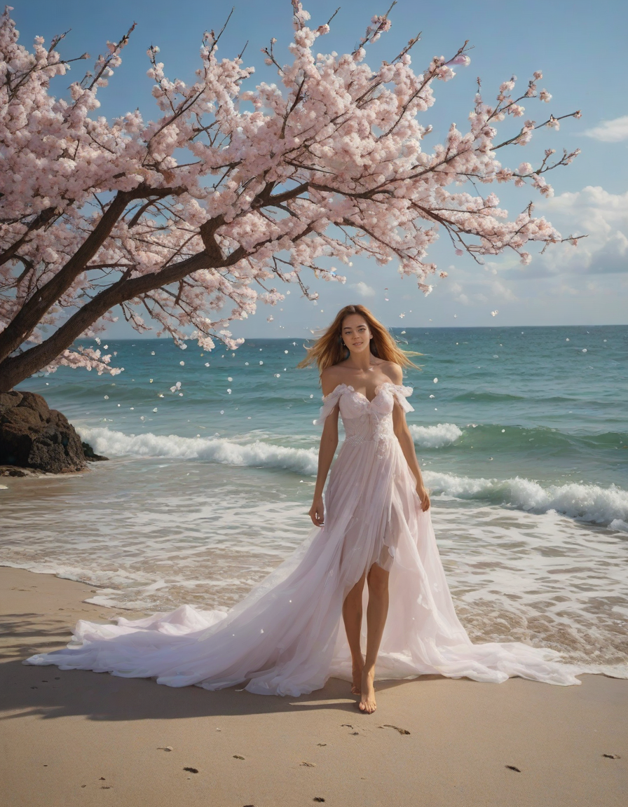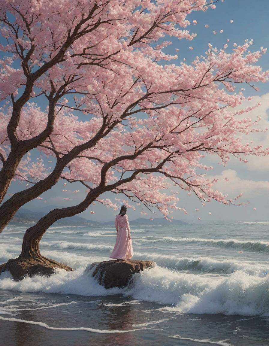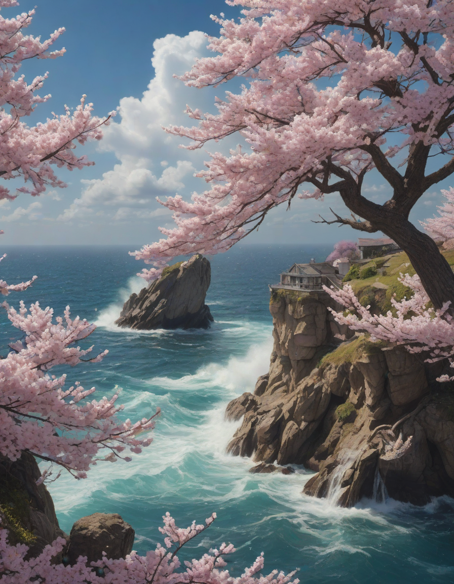 magical, enchanted, sparkling sea spray, Cautiously, Giant cherry blossom, made of clouds