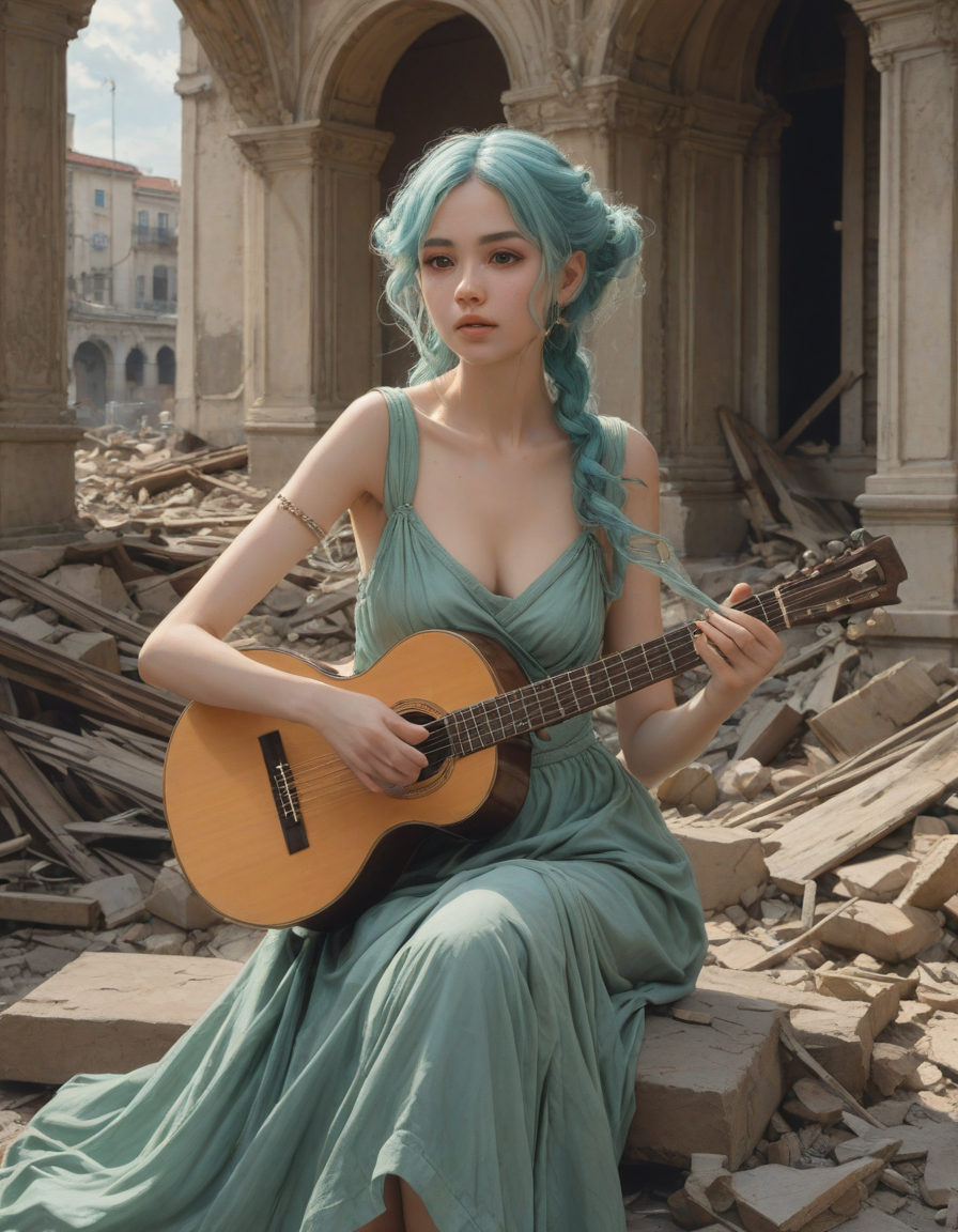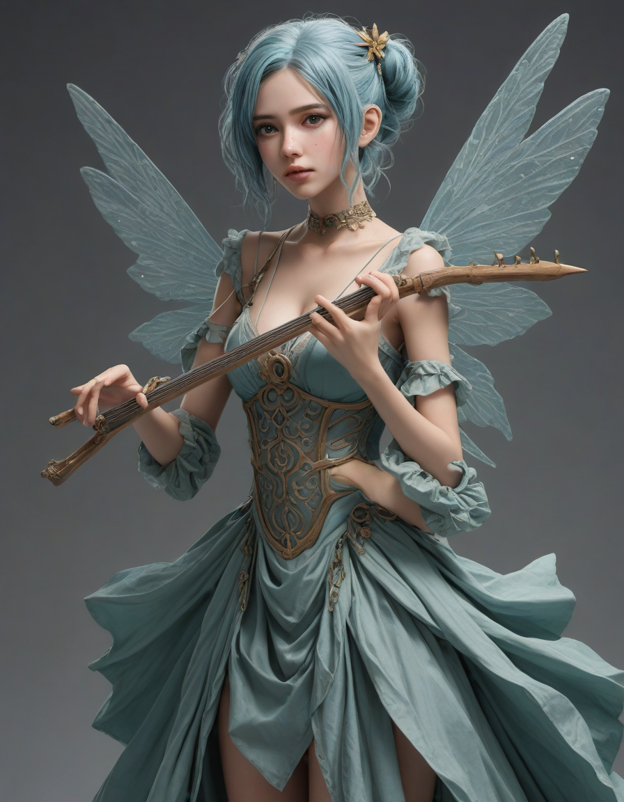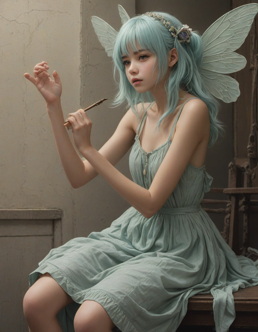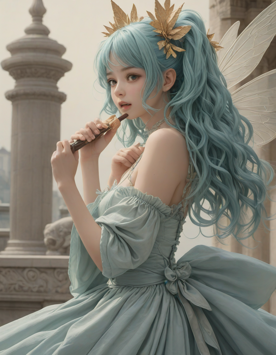 begging, ideal, playing a musical instrument, all the way up to an 11, neoclassical, a radiant, aquamarine-haired fairy flitting about details, agitated brows, anime, love, Girl in dress waving her hand in front of her face to fan herself, flushing, Body trembling with excitement, charcoal sketches on textured paper, resplendent intelligence