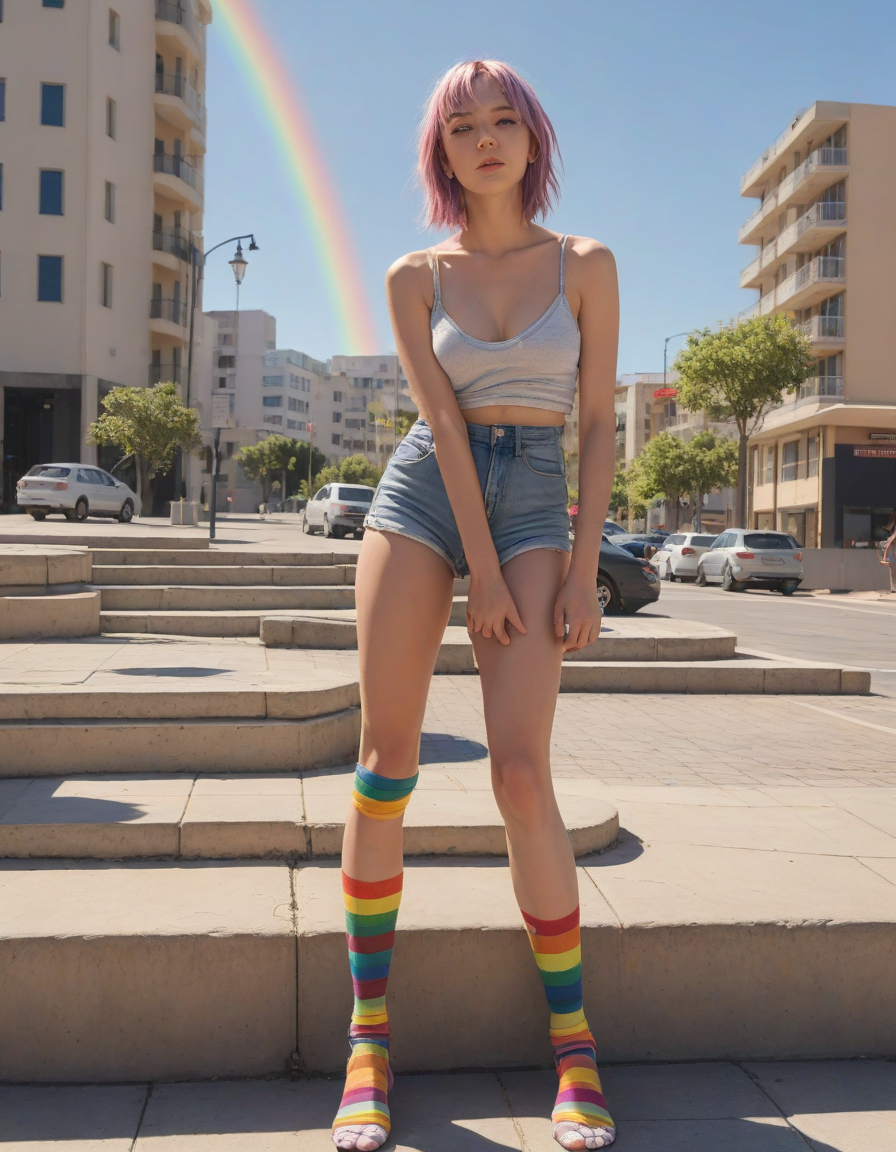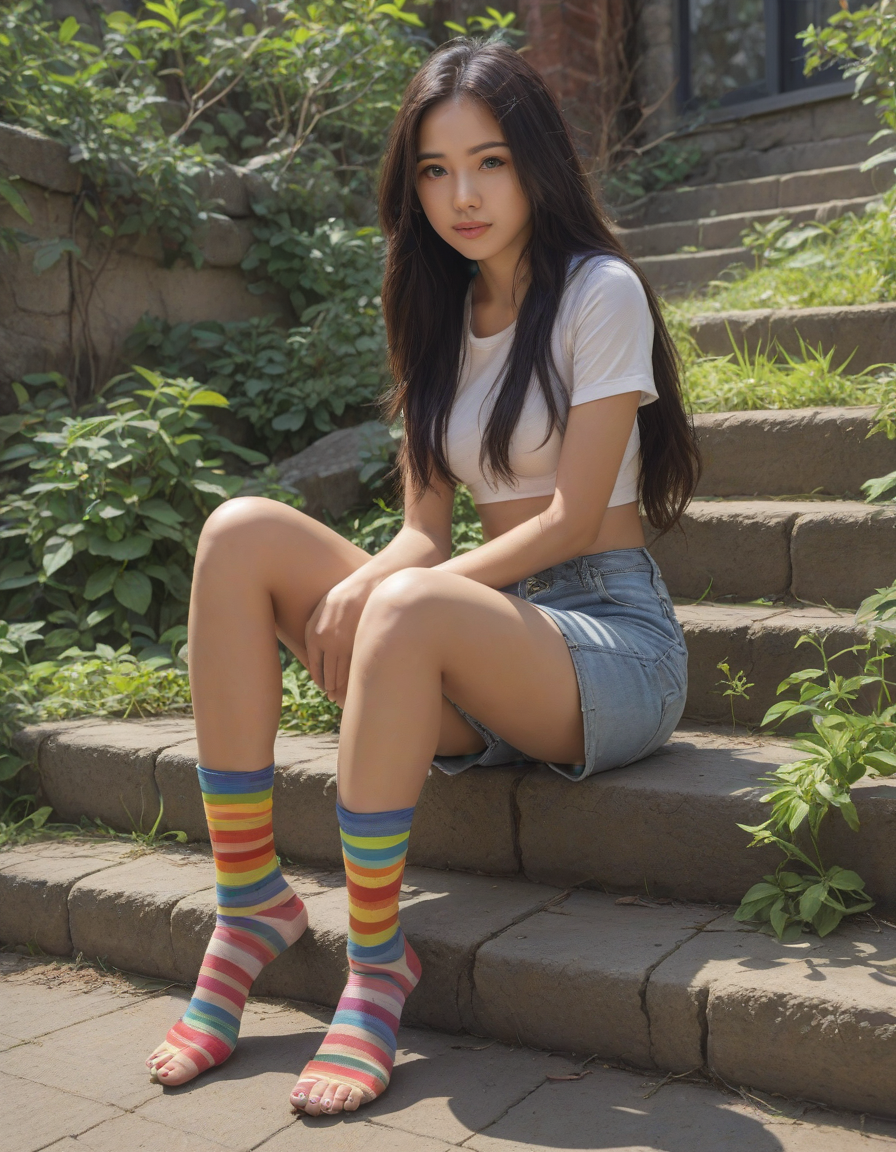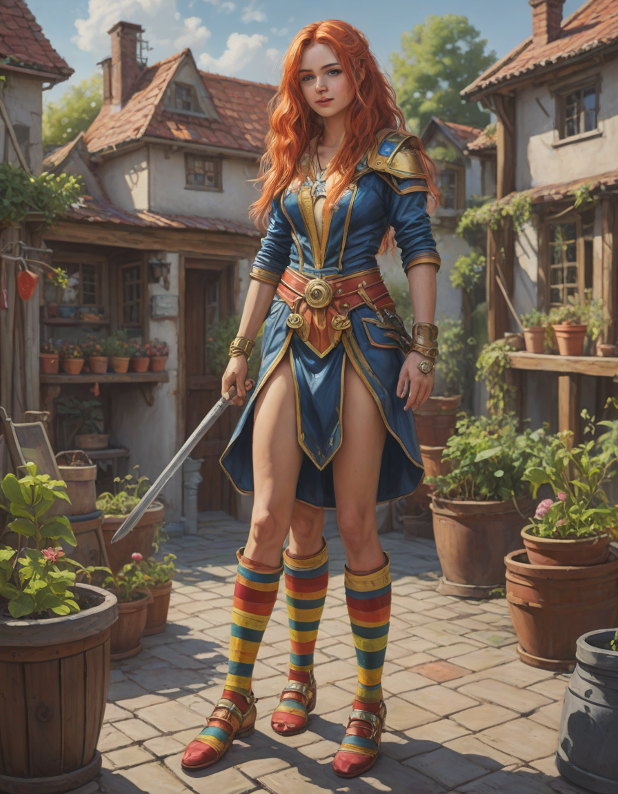 epic oil painting, superhero, mad genius, One foot propped, Rainbow strip socks, winner, Love, enjoying the sunshine outside