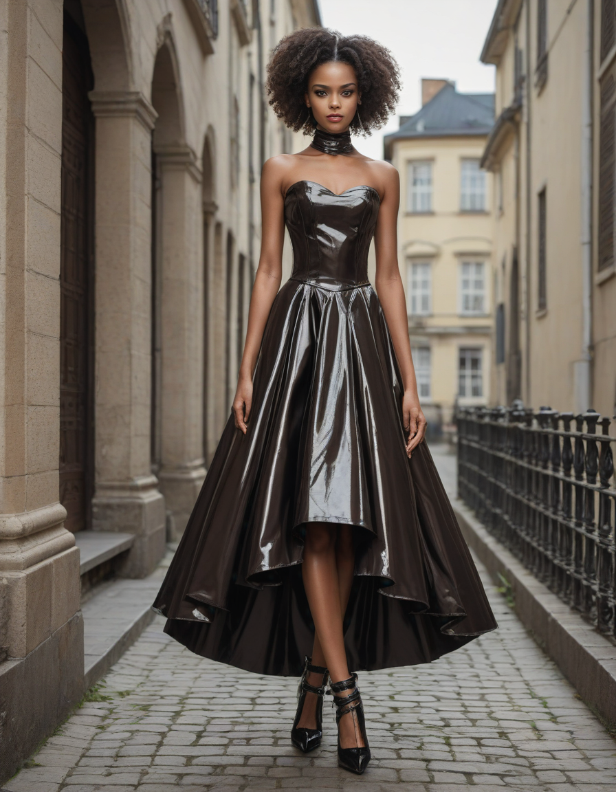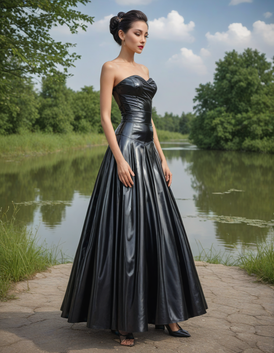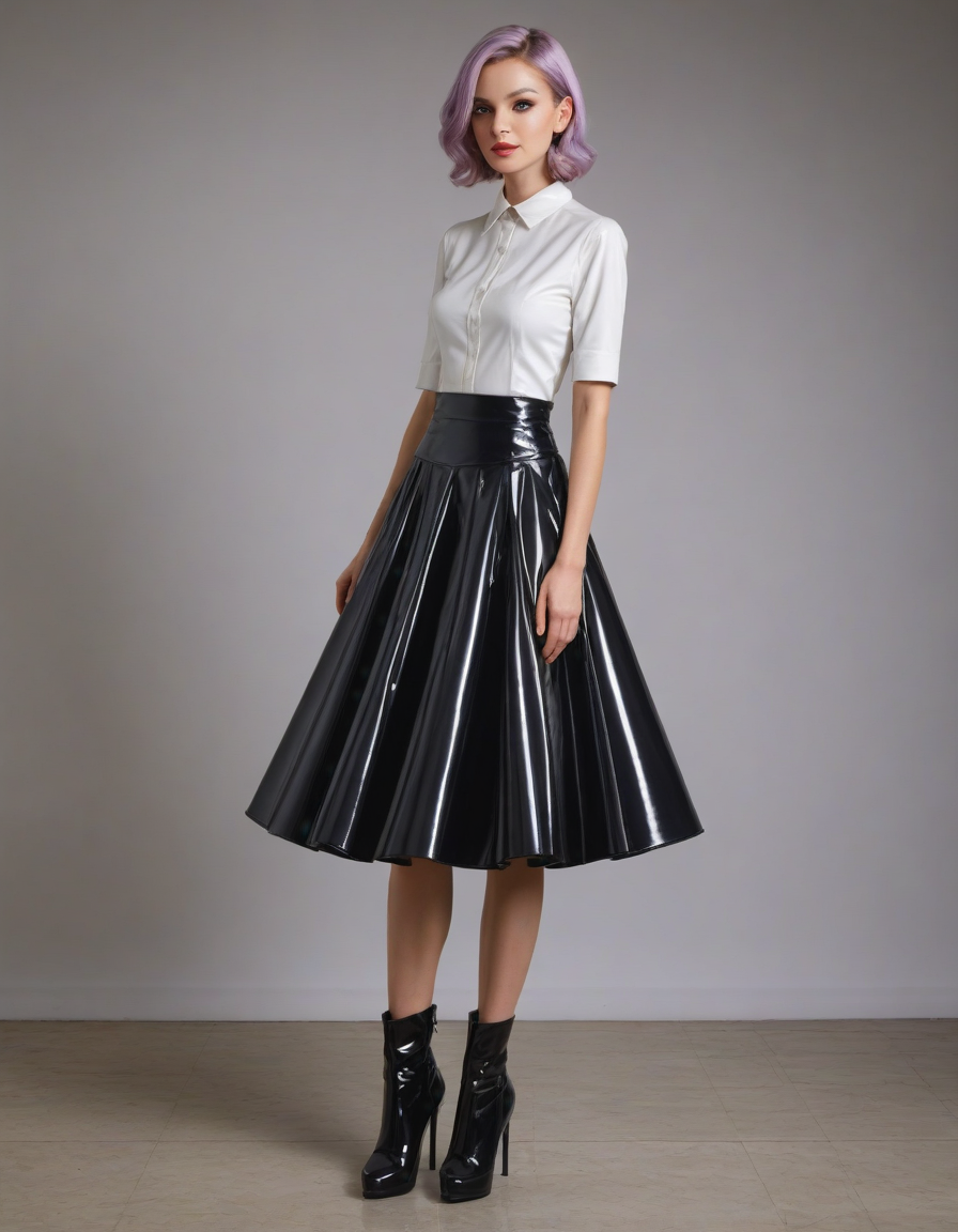 elegant, high waist tight overknee stiletto boots, Wide Skirt, wide ballgown hem, a line skirt, petticoat skirt, , shiny, glossy PVC outfit, (shiny glossy PVC cloth textures), clothes made from pvc, plastic