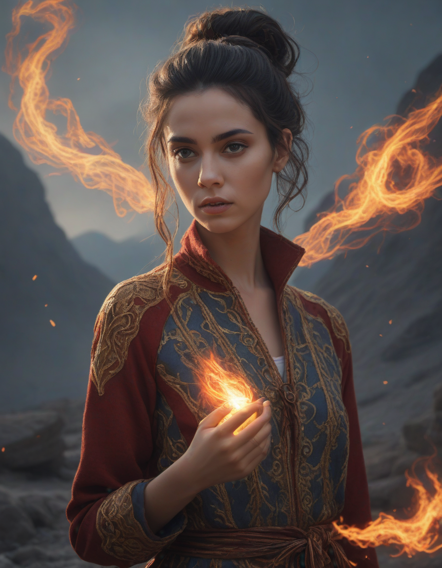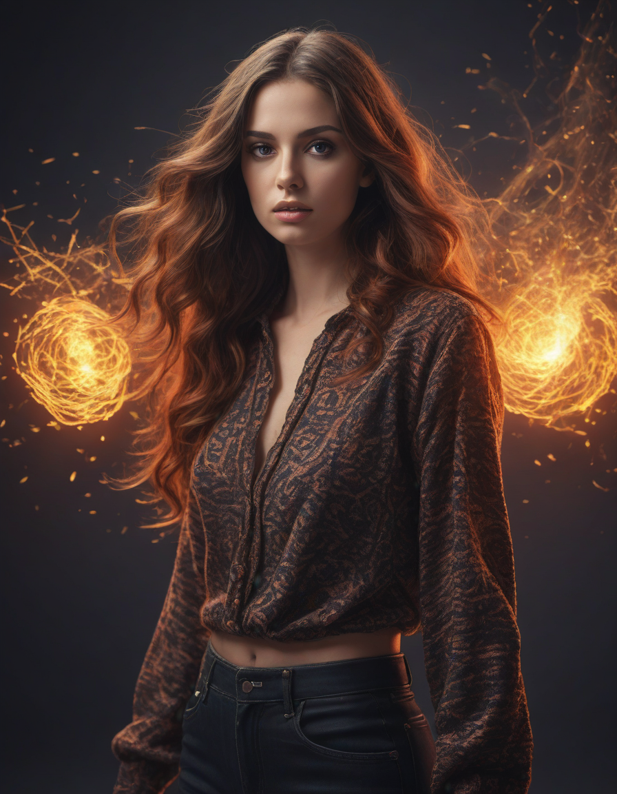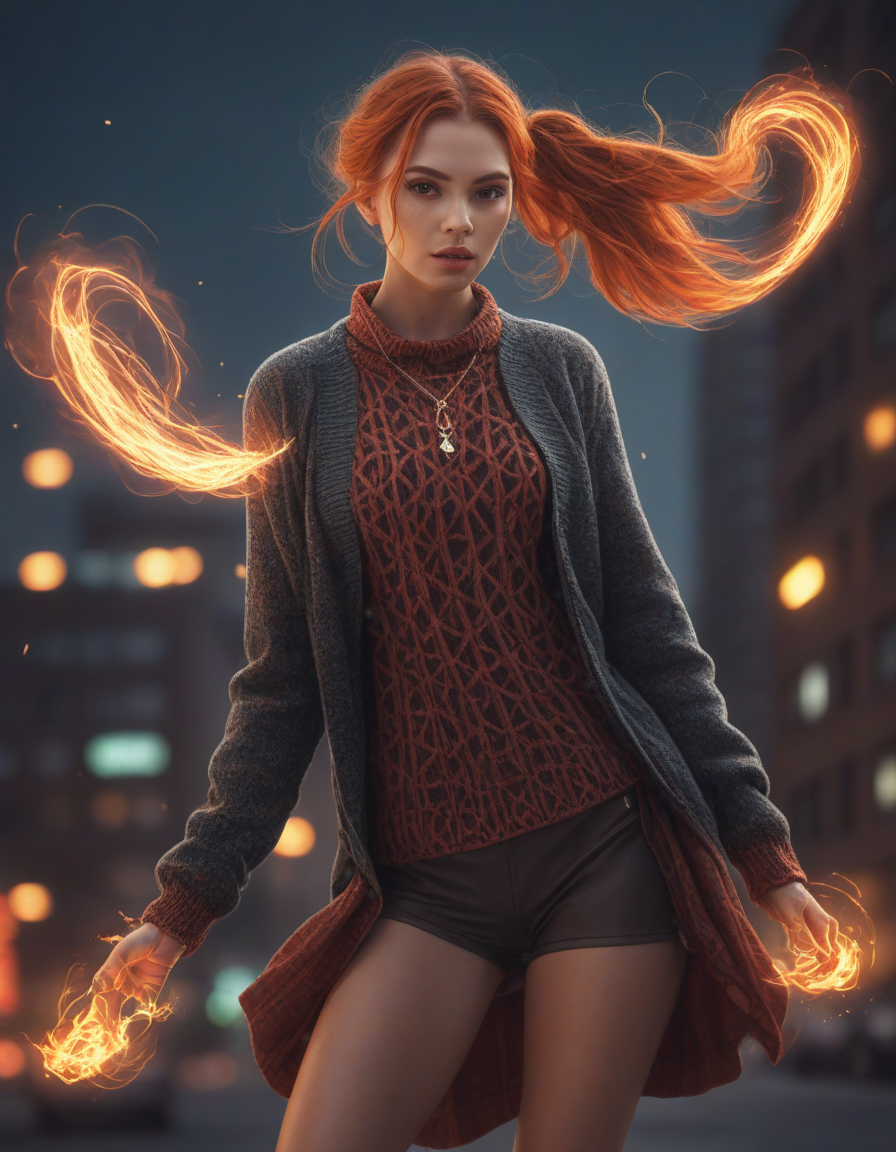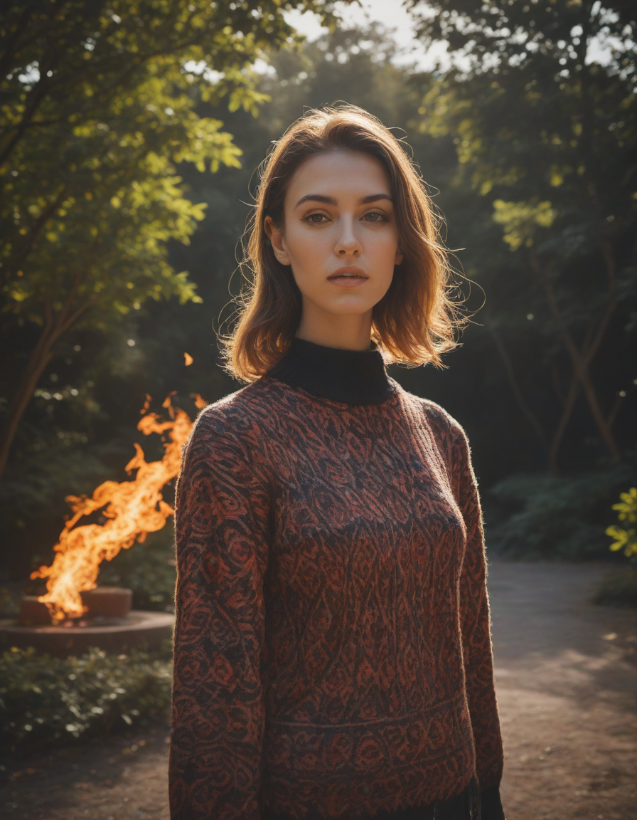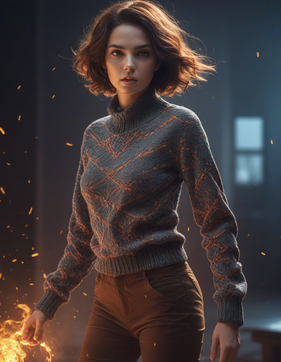 Blinding light highlighting mysterious figure, being chased, Gaudy sweater, eerie, Fiery sparks igniting a symphony of colors, designer vintage wear, Highschool_Senior, 18yo, 19yo, 20yo, 18-year-old, 19-year-old, 20-year-old,