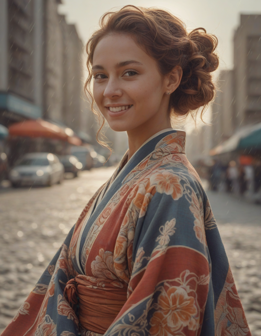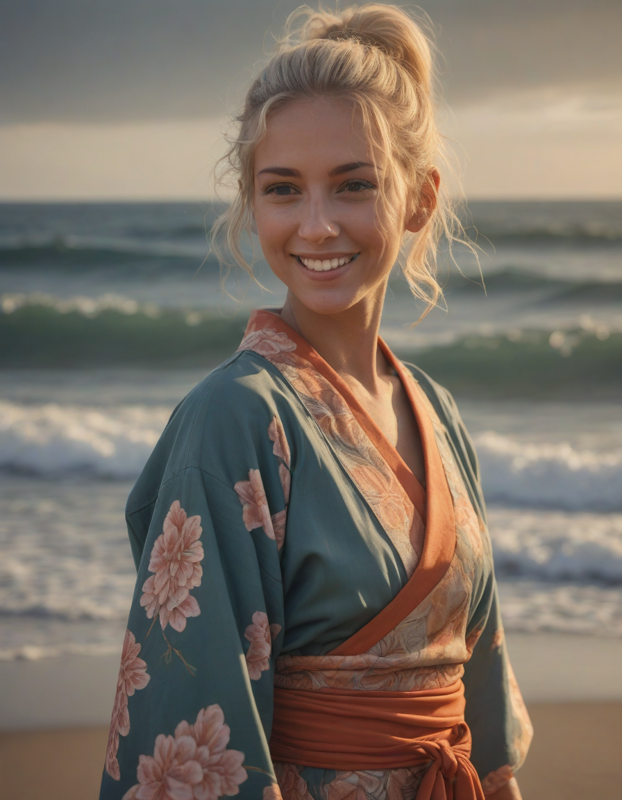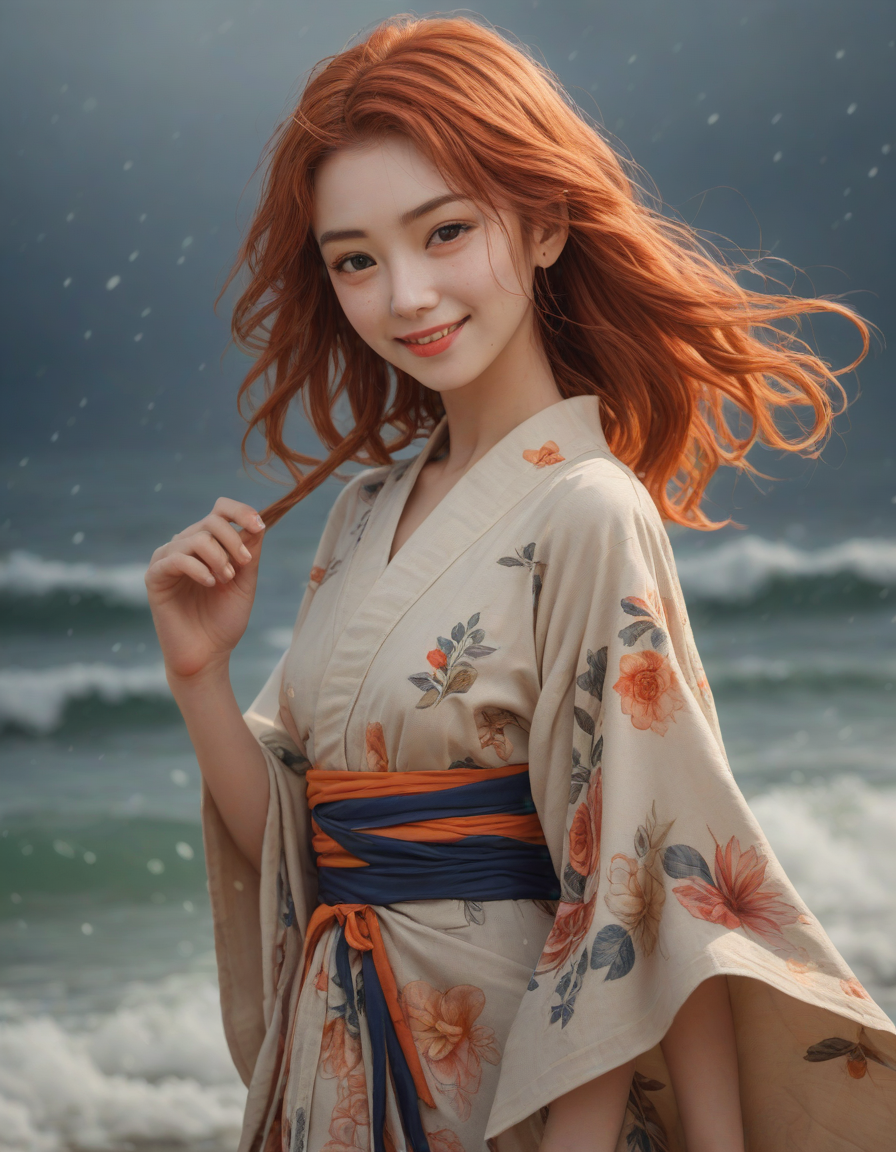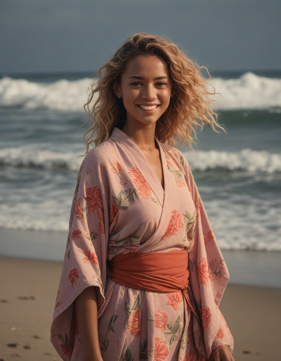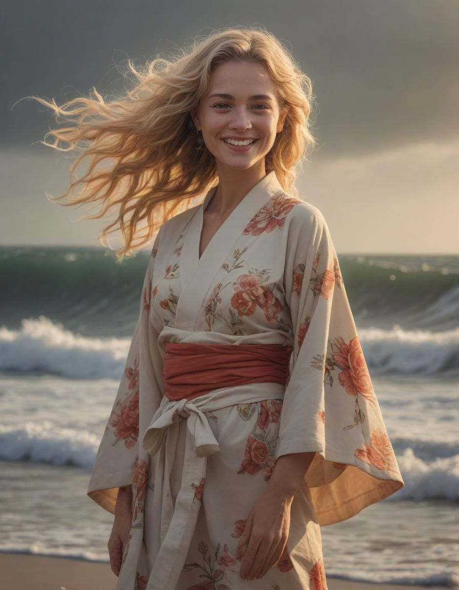 very uncomfortable, mischievious grin, gawking openly, Blinding sunlight, Surfer catching wave in beach sunset, smiling, bloom shader, diablo, soulful, raining, windy storm, Dreamy gaze, wearing a traditional kimono