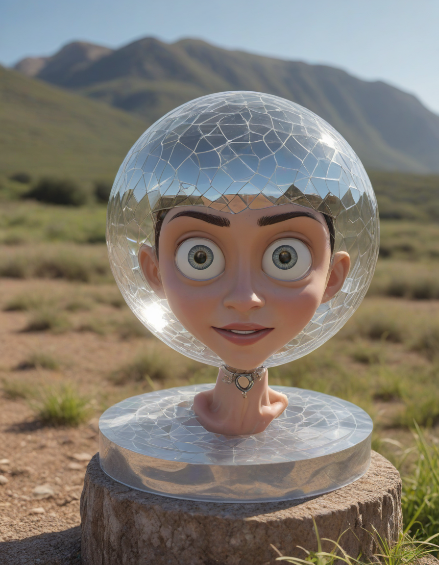 pixar-style, at a meetup, crystal sculpture, bright-eyed curiosity, Sarcastic half-smile, Photorealistic portrait, disco ball evening, classic look, raging while typing at a computer, staring at a screen, Eyes glint with mischief, driven mad god, Distant mountain landscape, like a sunny day at the beach