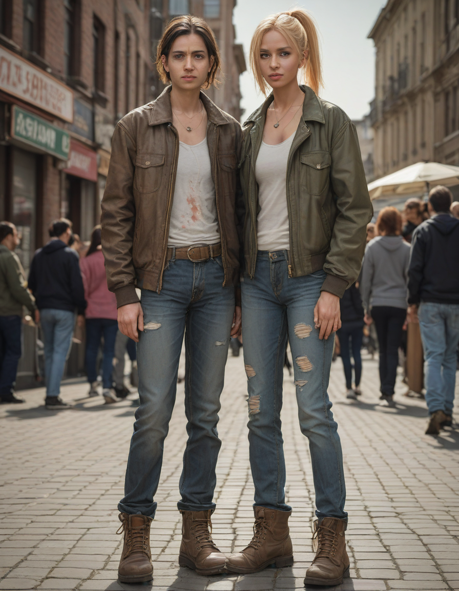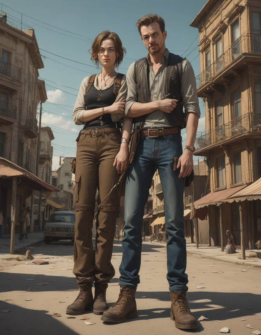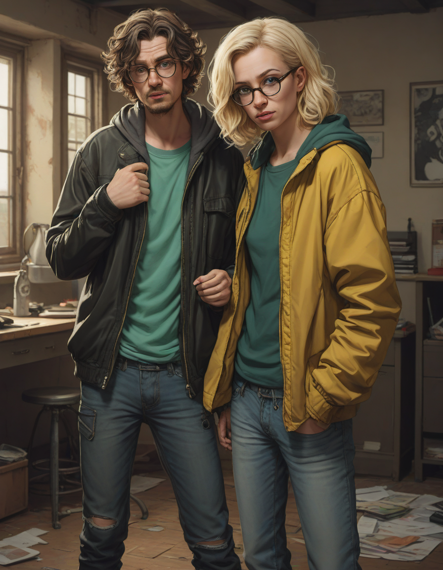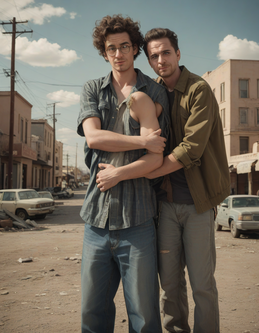 Wise-looking, goofy expression, baroque, pose estimation, Eyes glint with mischief, on the show breaking bad, cel-shaded, friend hugging best friend, torn jeans and combat boots