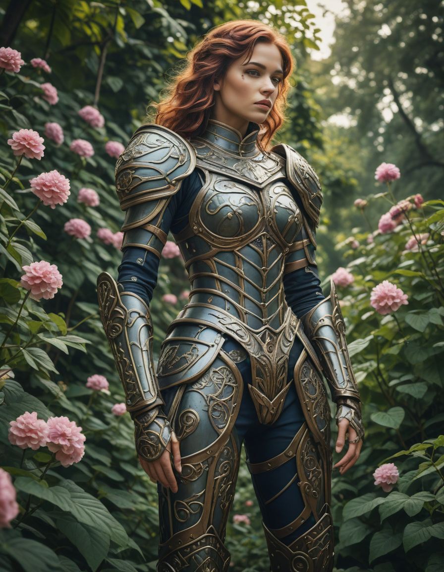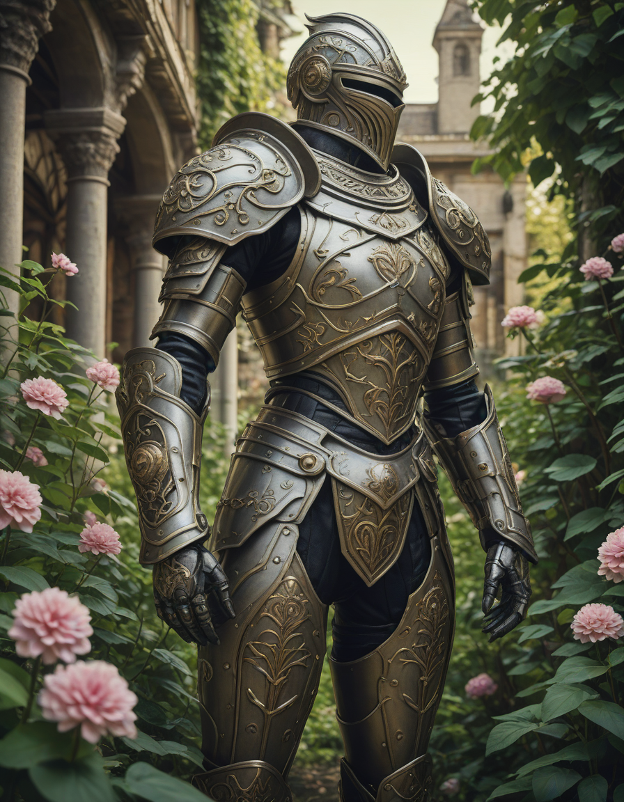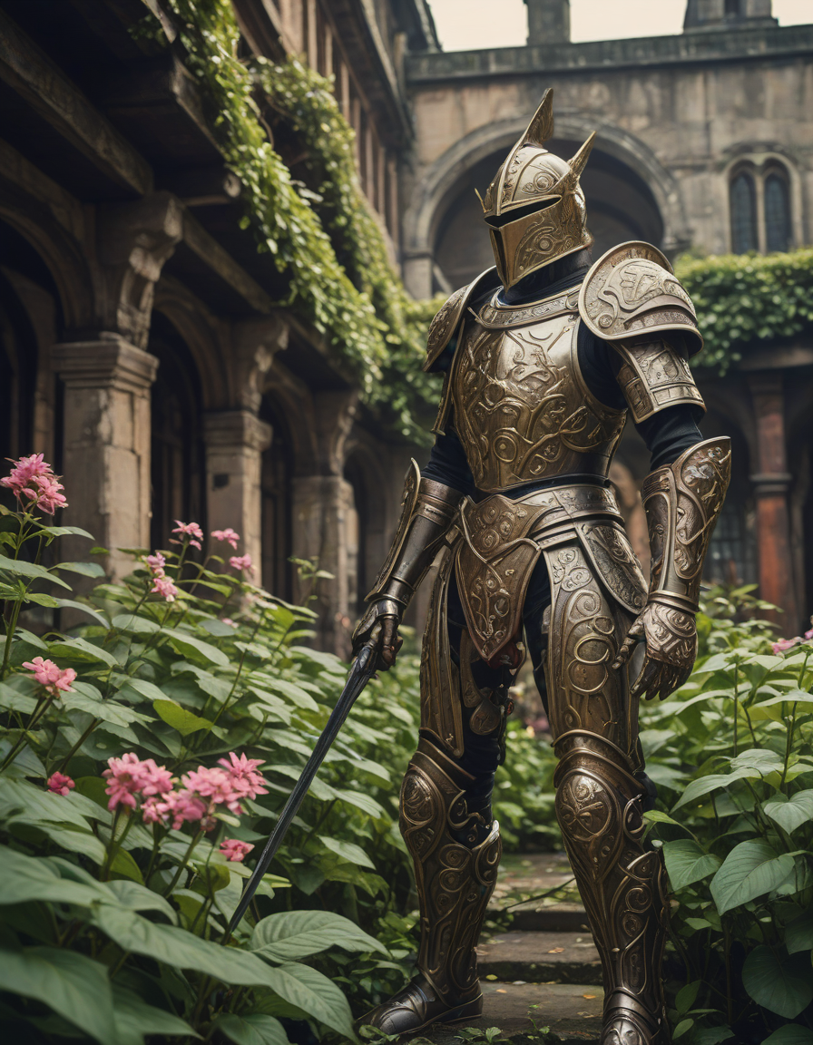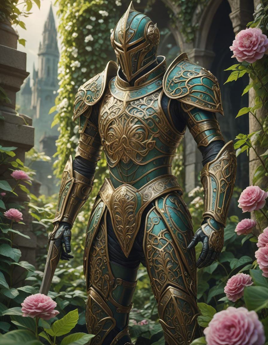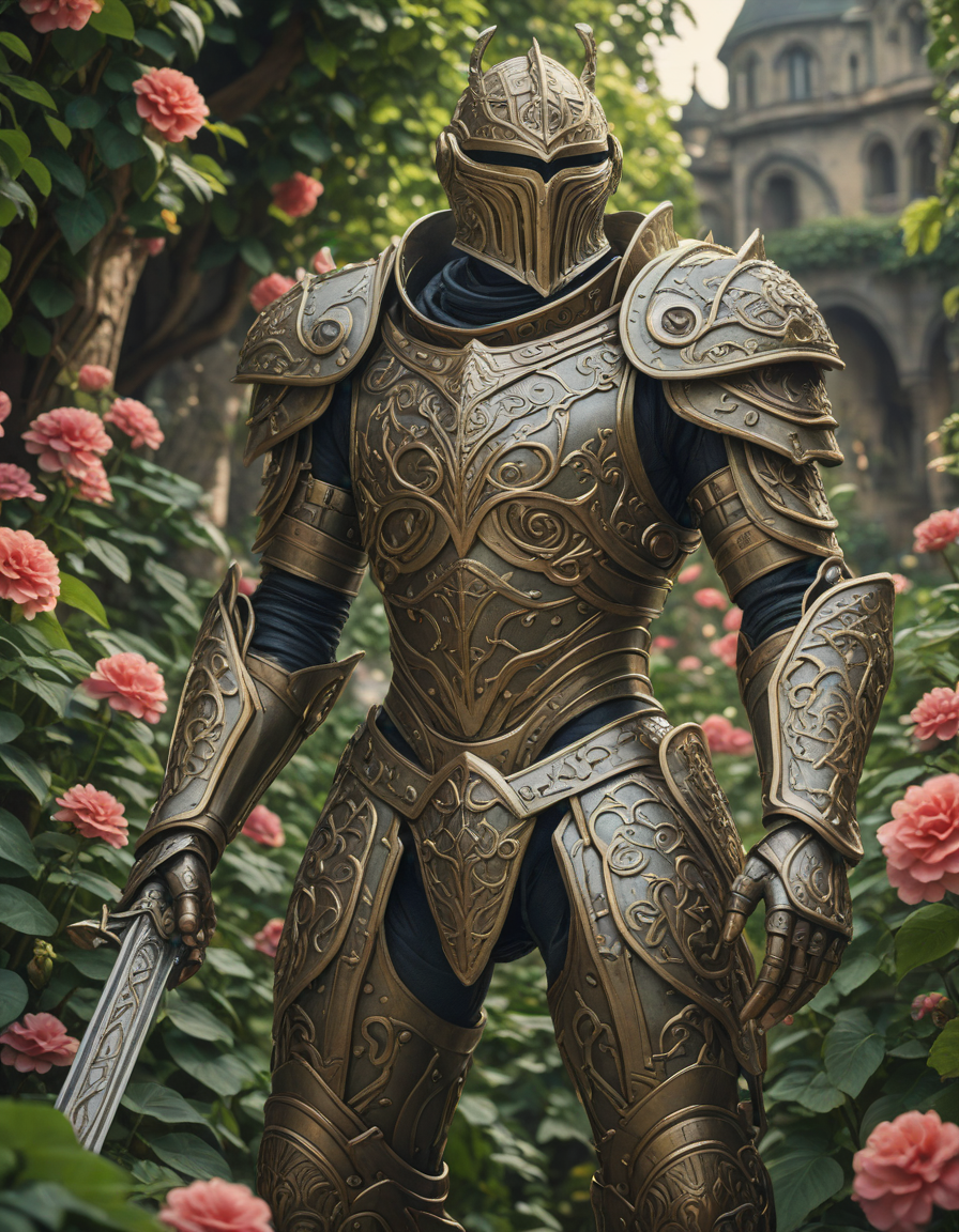 epic fantasy armour, ornate medieval knight, lush garden setting with flowers and vines, detailed biomechanical elements, futuristic cyborg parts, dynamic pose, action shot, surreal dreamlike composition, physically impossible elements, 1980s retro aesthetic, vintage filters, bold graphic designs