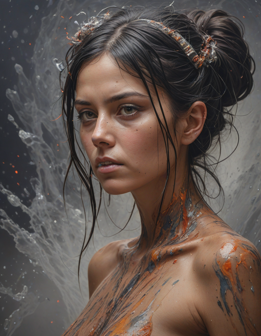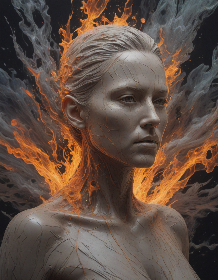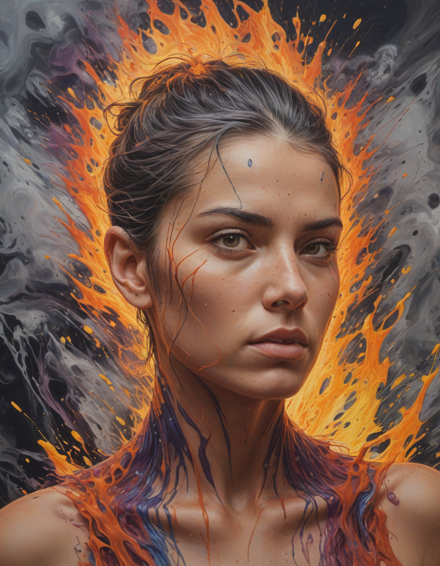 surrounded by people, Fiery volcanic eruption, a glistening, crystal-like figure that sparkles in the light, a head tilting, a question asked without words, Grizzled and rugged, intense focus, meticulous attention to details, pulsing heartbeat, A painter meticulously blends hues on a wooden canvas