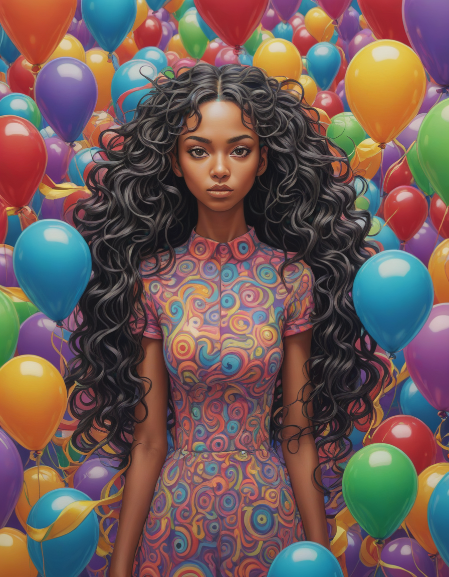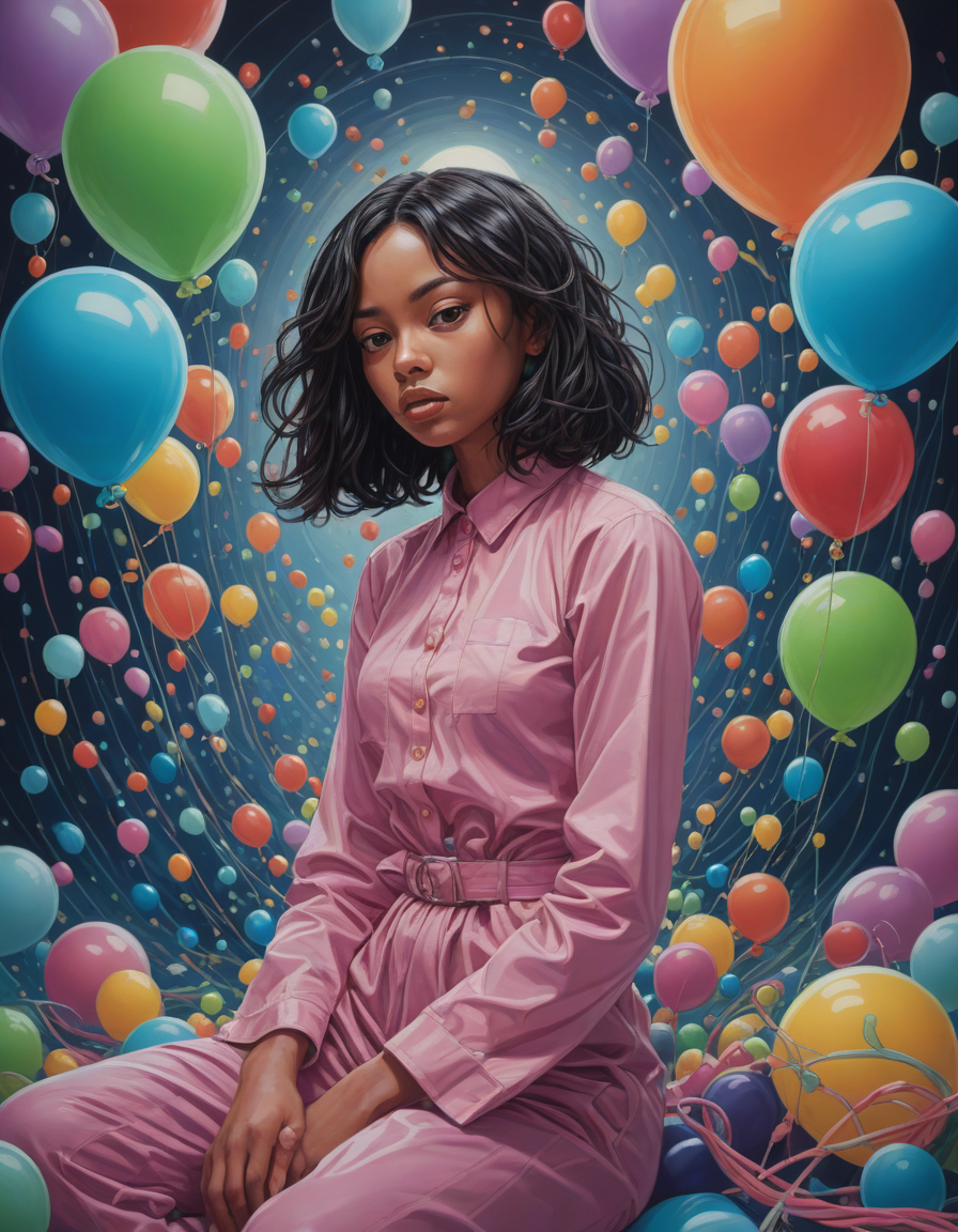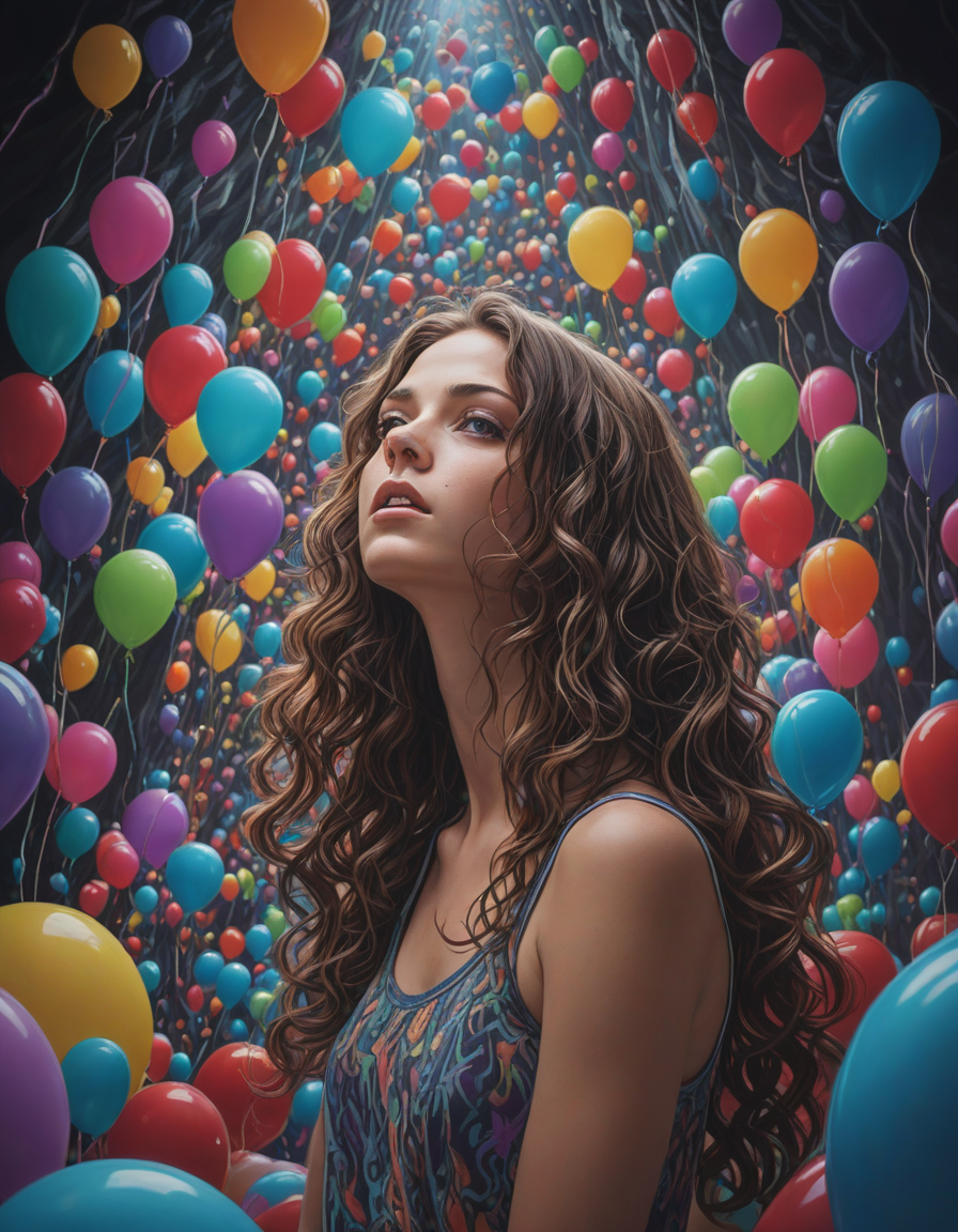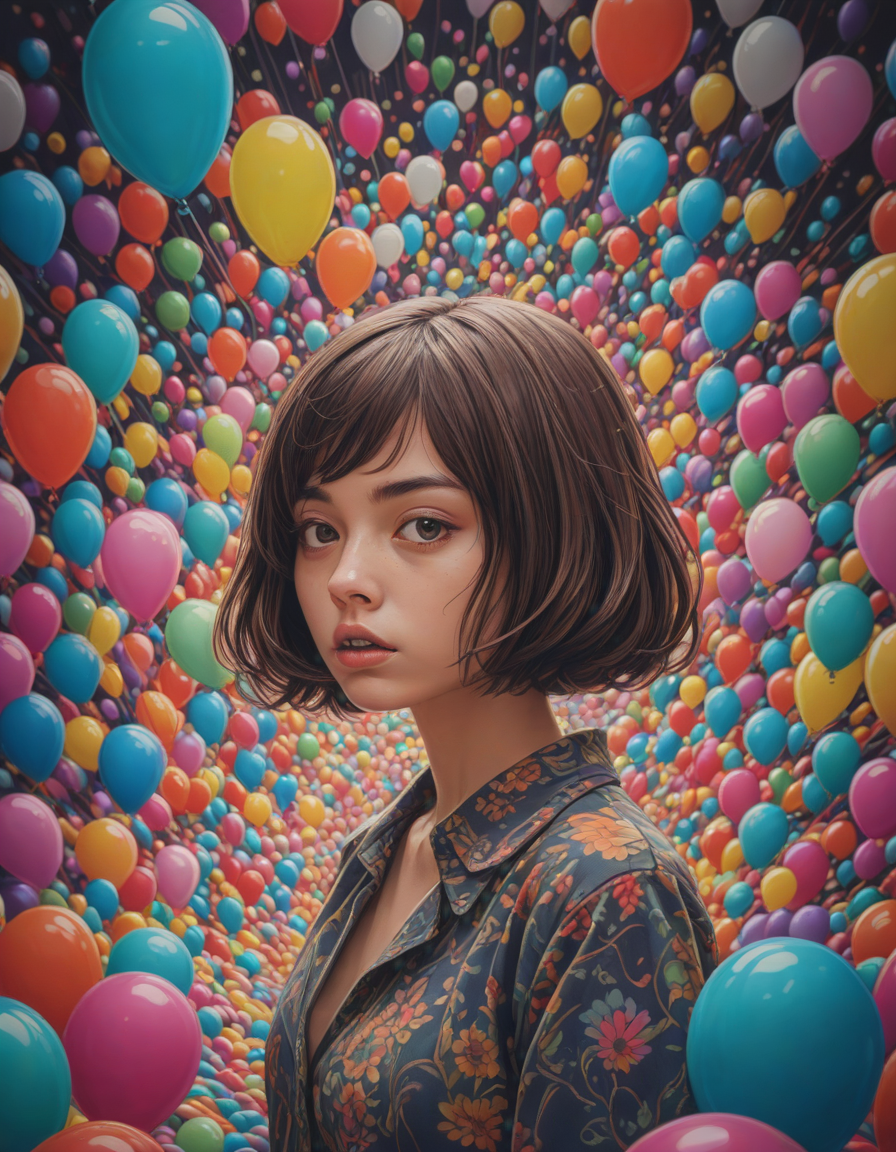 surrounded by balloons, immersed in, anime, psychedelic trip, mesmerizing swirls, angry, a mysterious hologram