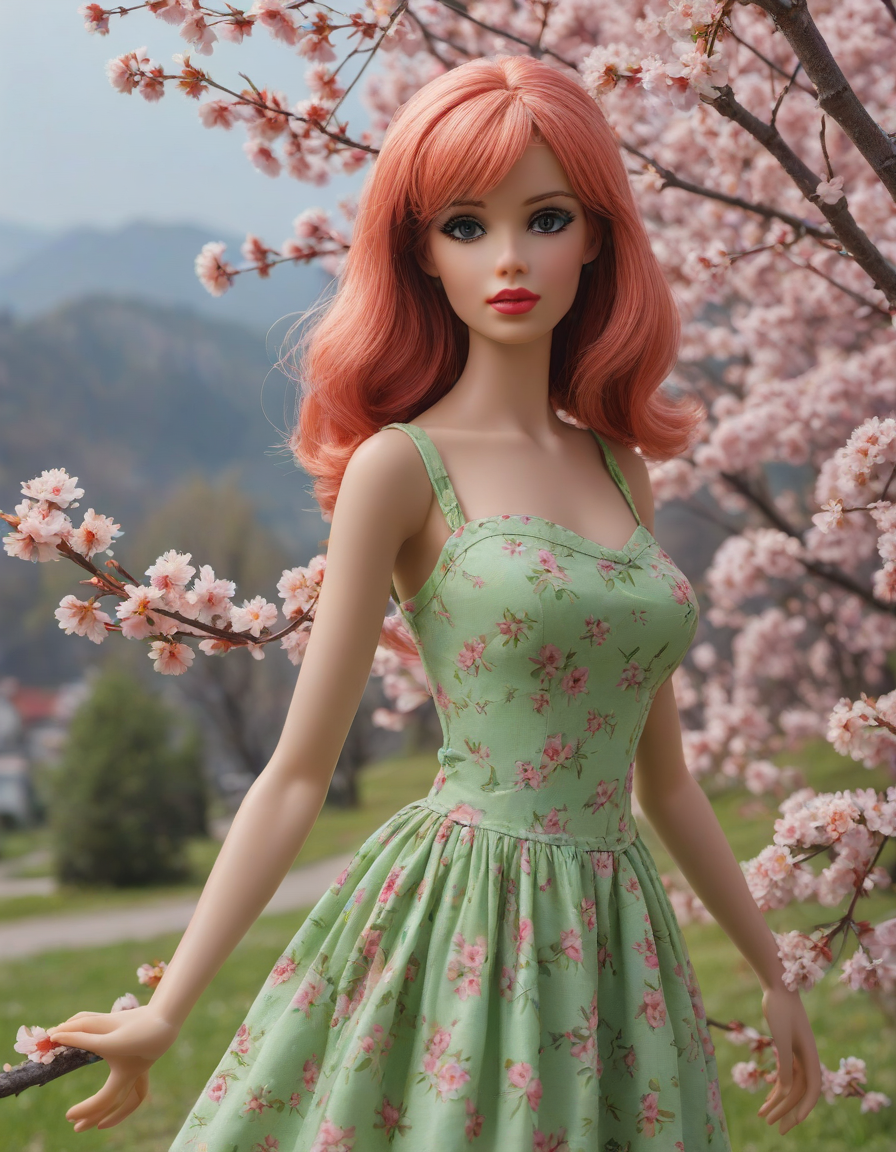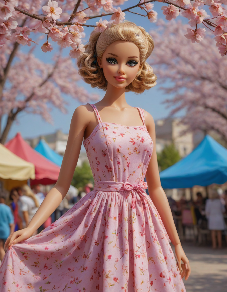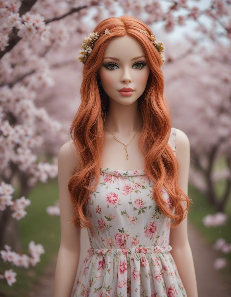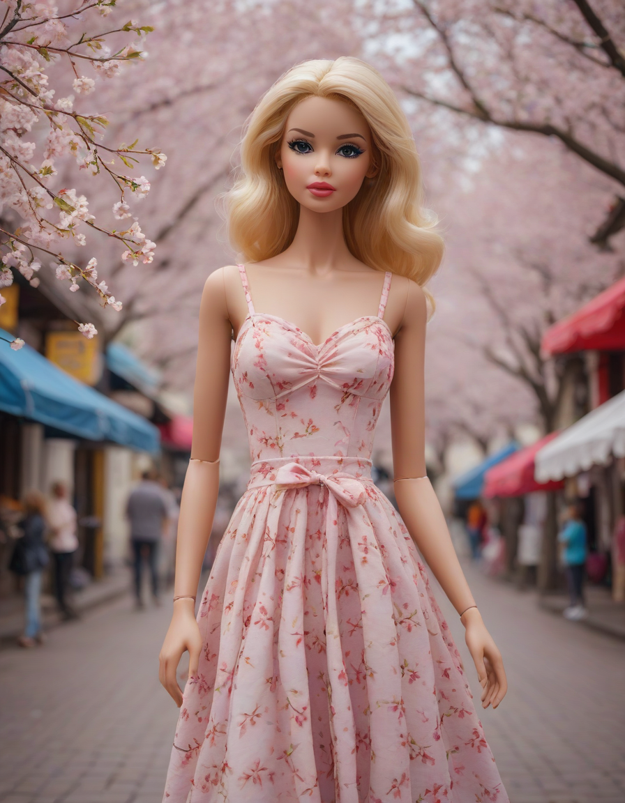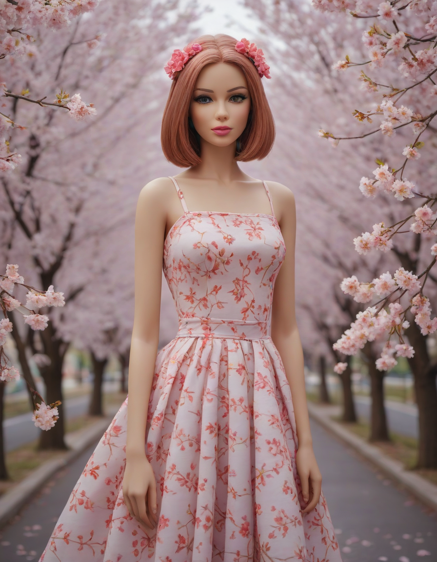 barbie, Blossoming cherry trees, petals falling like snow, in a sundress