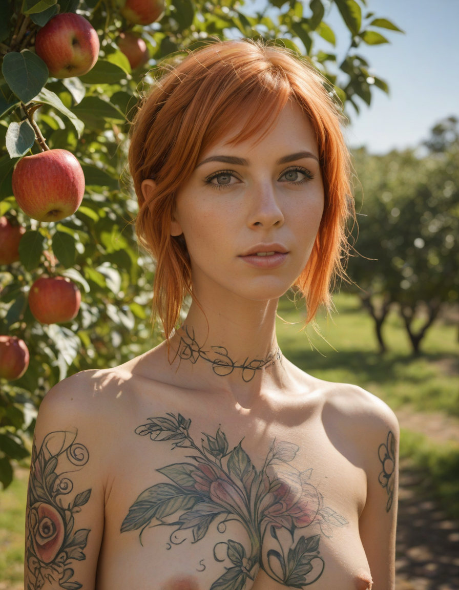 whimsical graffiti, hard to look away from, vibrant, glowing, and healthy skin, in an apple orchard, elf