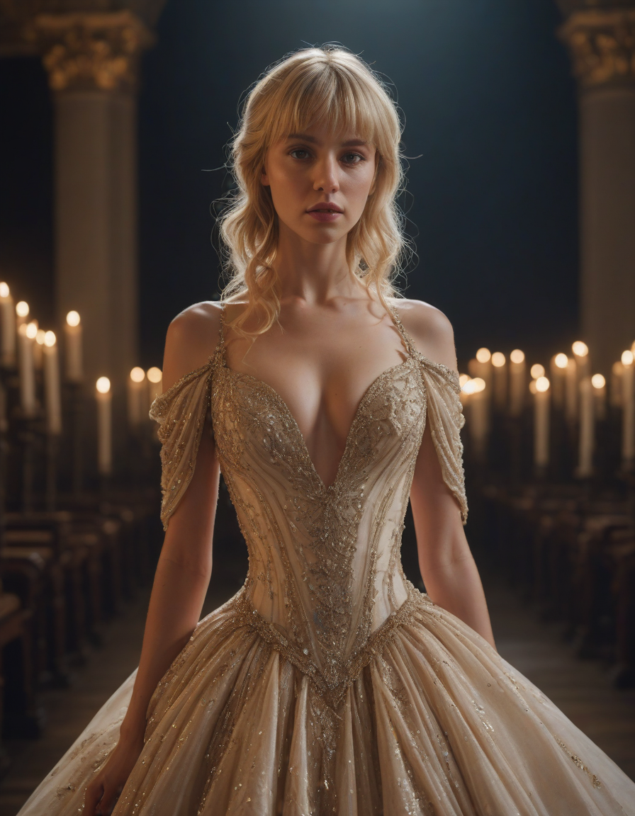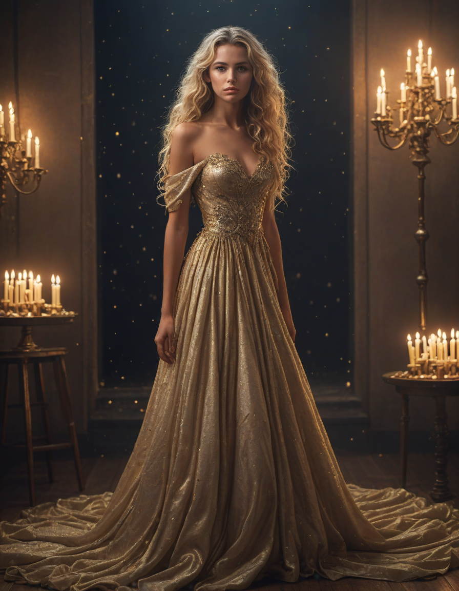 Gloating triumphantly, Glistening in the light of a thousand candles, suspicious glare, A voluminous, fiery dress trailing behind her, western, Glistening in the light of a thousand candles