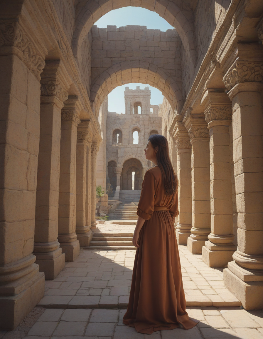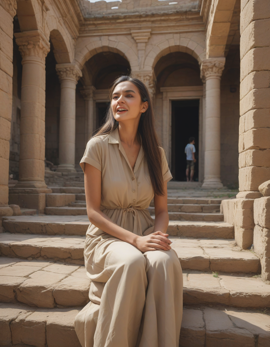 low poly count, gasping, excited, ancient ruins of masonry and carved stone, enjoying the sunshine outside, intense focus