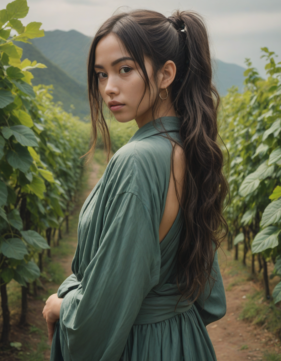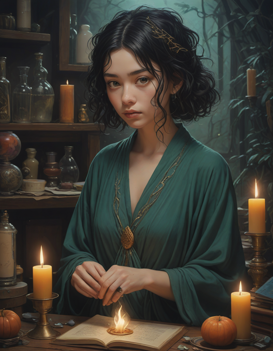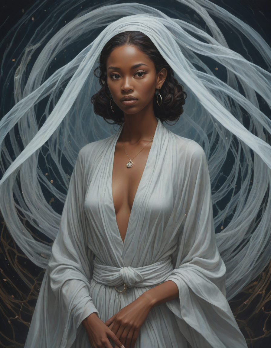 Studio Ghibli style, piercing stares, Haunting hue, elegantly draped rich crinkled robes swirling gracefully, Ethereal tendrils of cosmic energy