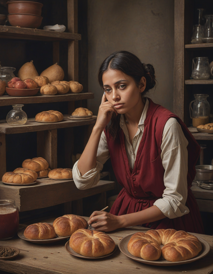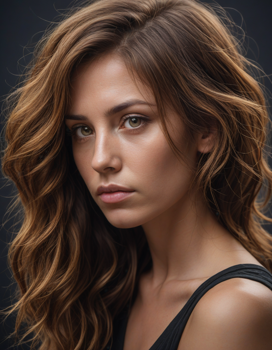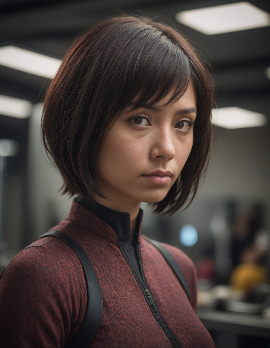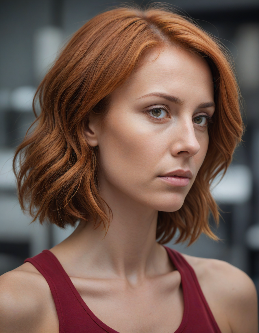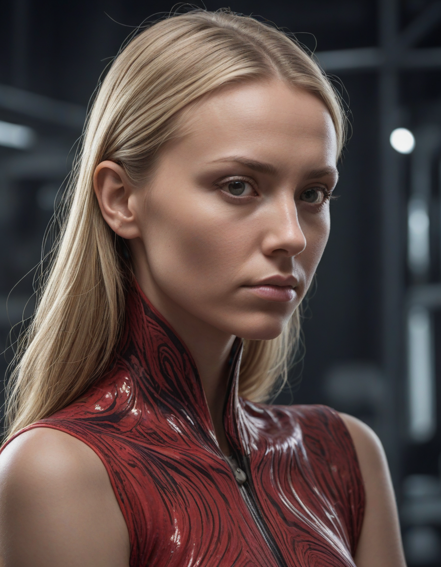 looking contemplative, daring acrobat, Enigmatic, crimson-flecked eyes, lost in deep thought, vibrant dream, in a lab