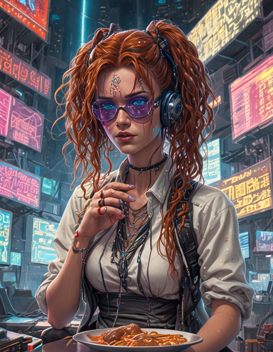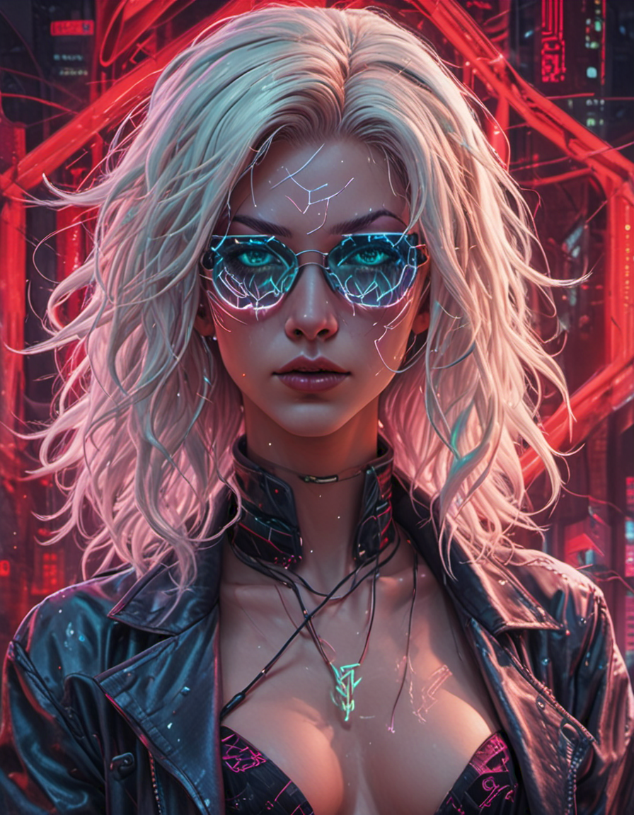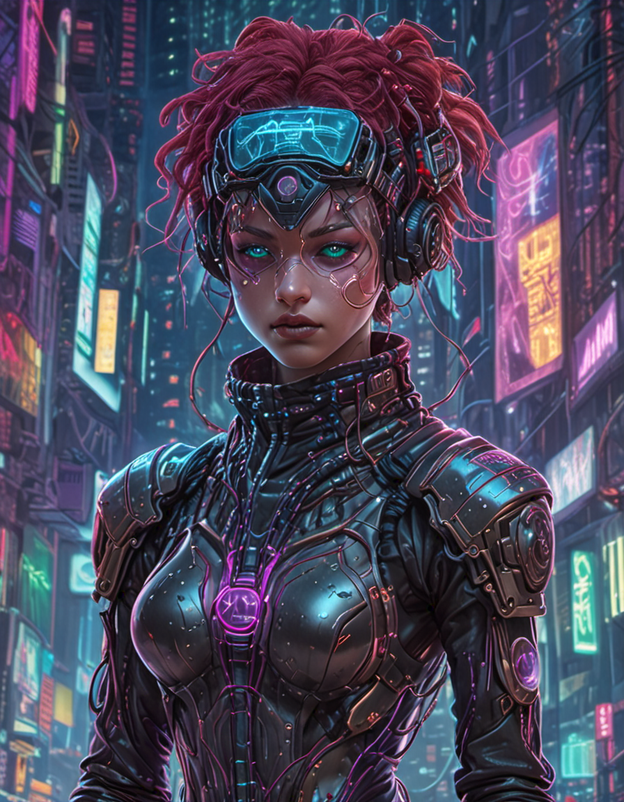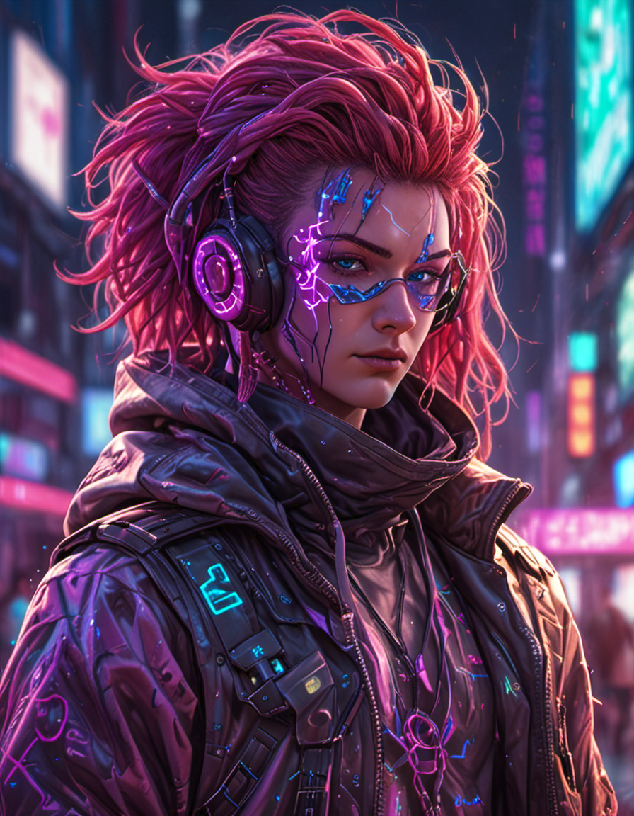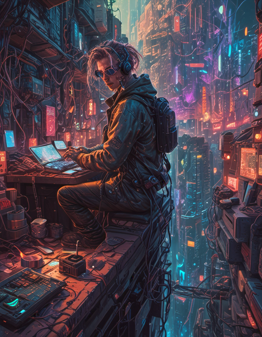 cyberpunk hacker, surrounded by neon lights and holographic screens
